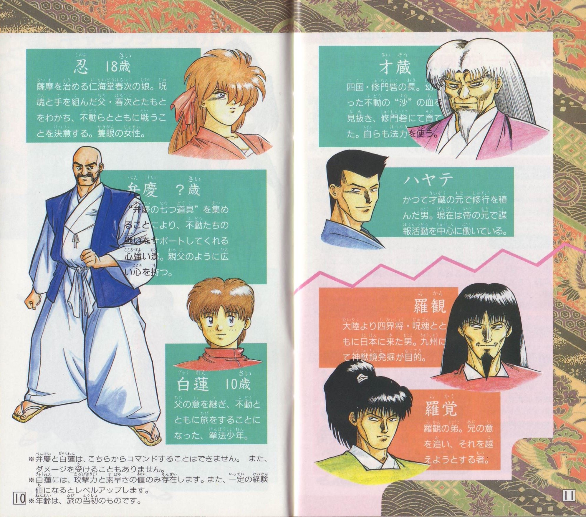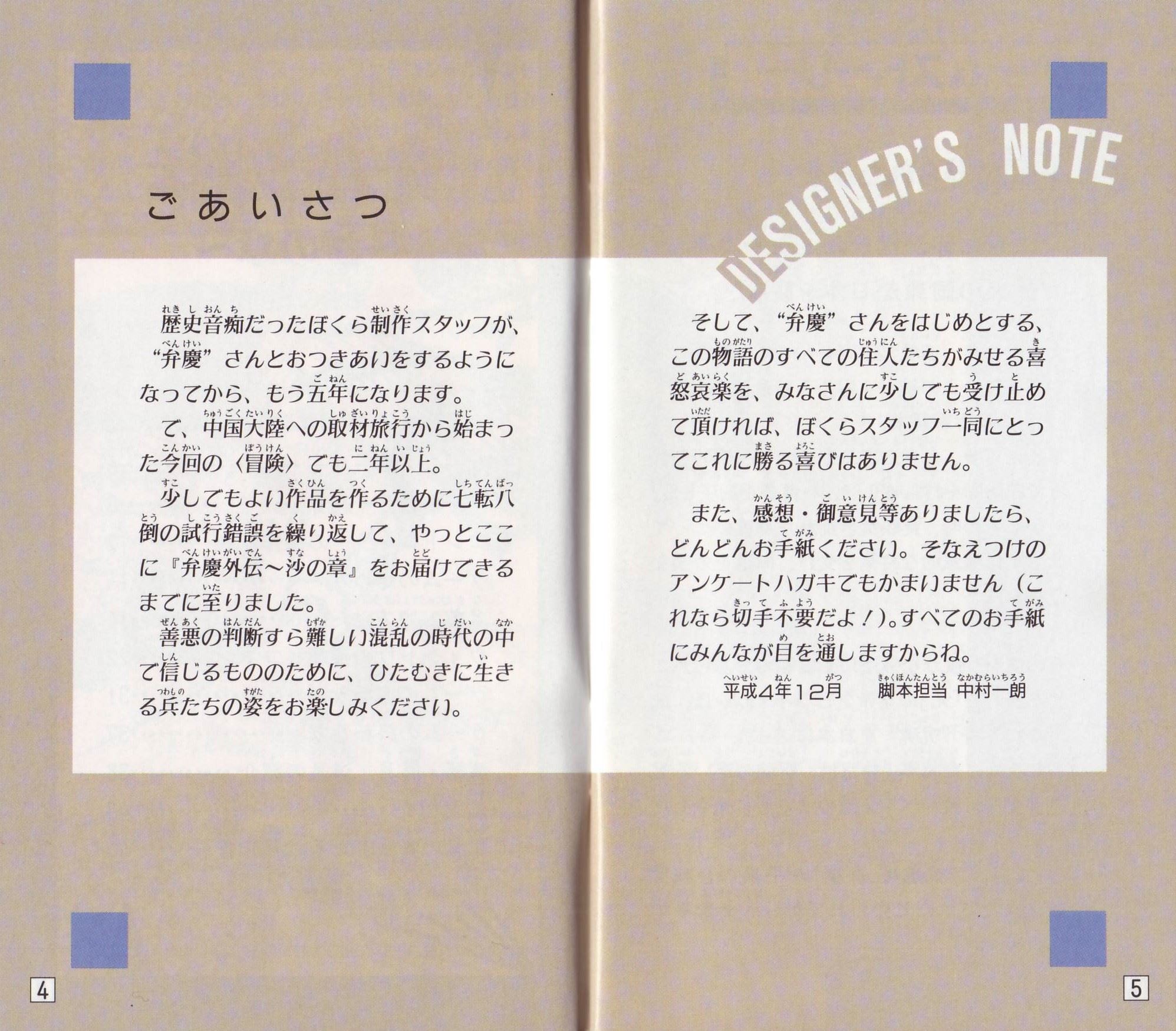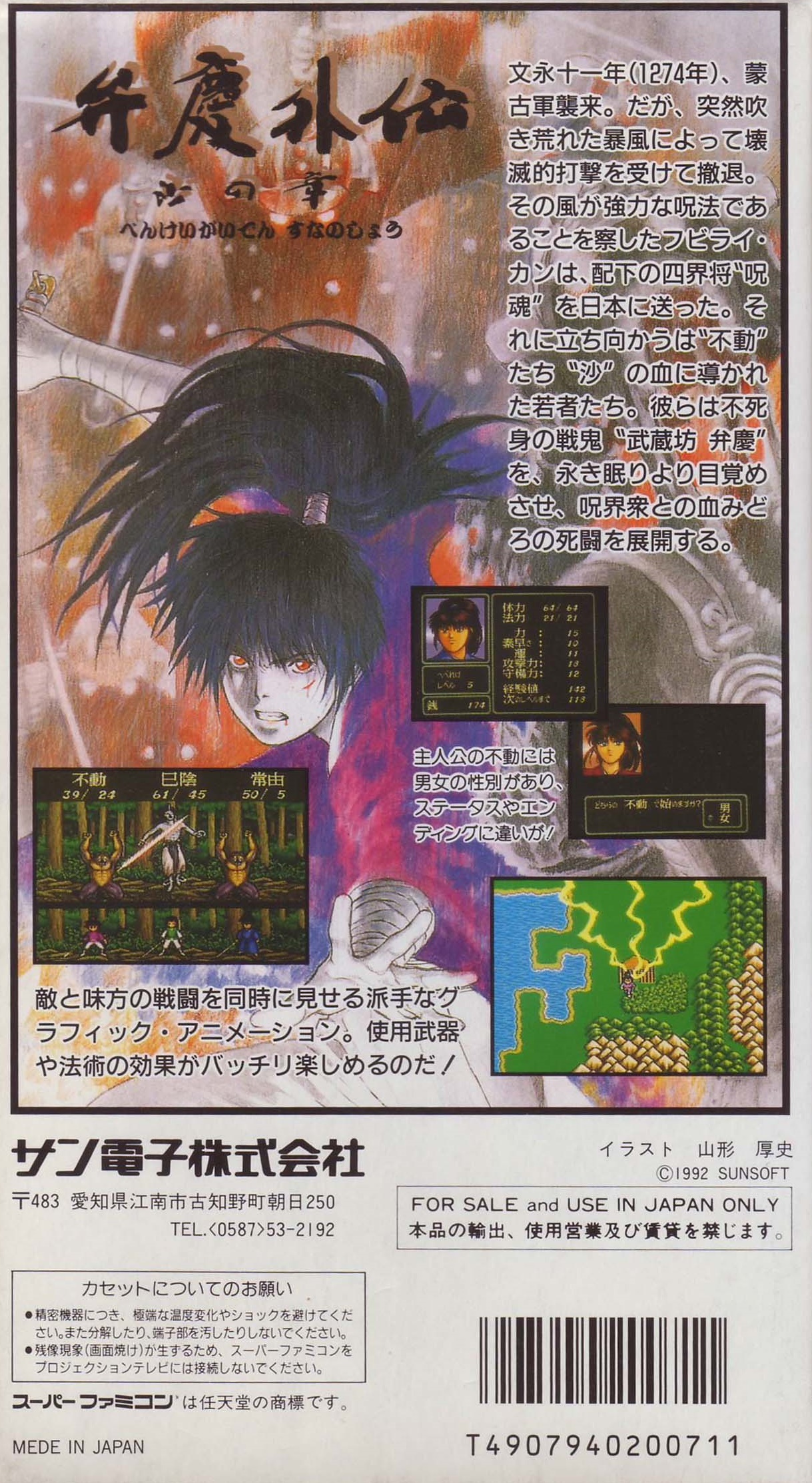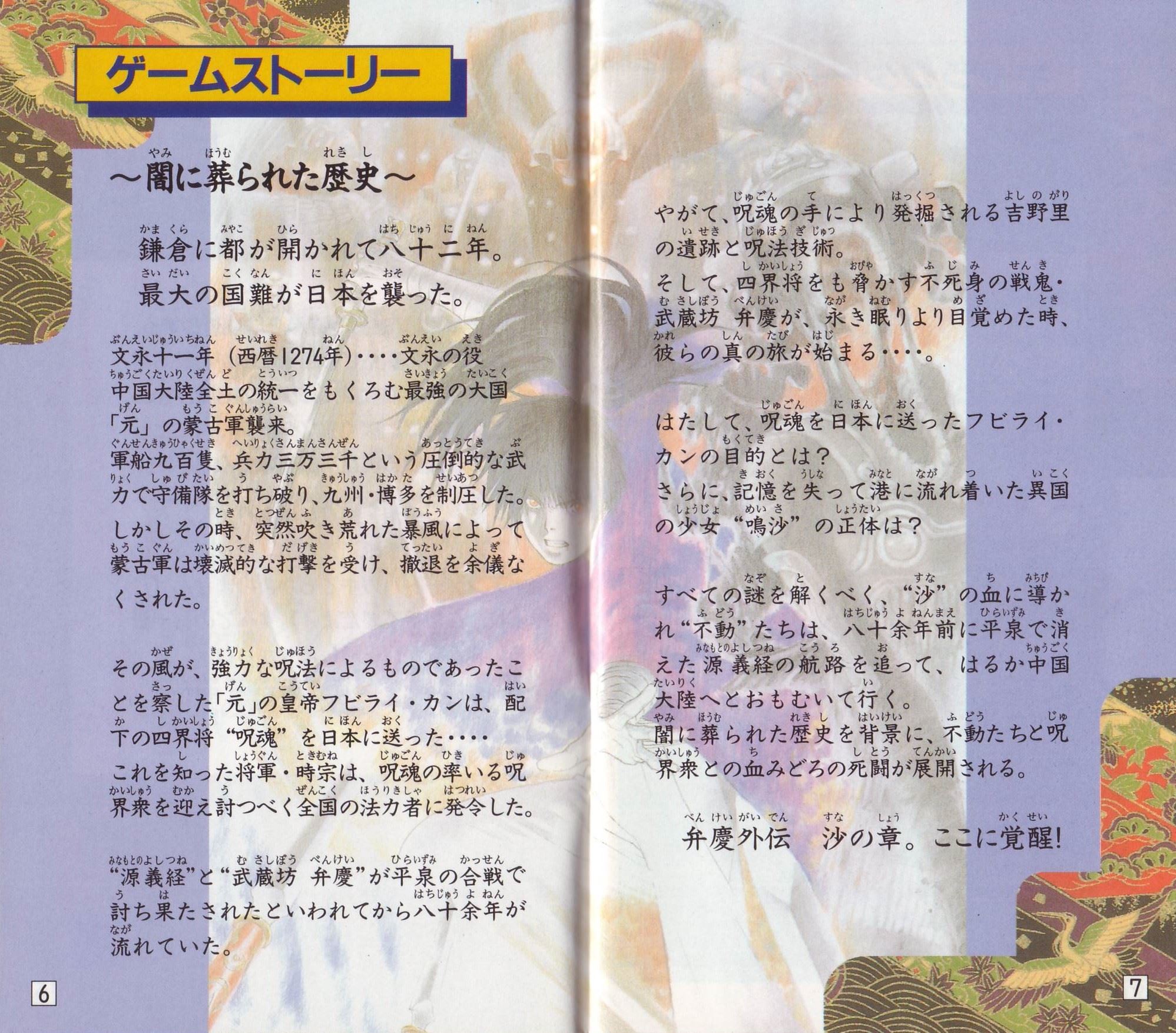ごあいさつ歴史音痴だったぼくら制作スタッフが、"弁慶"さんとおつきあいするようになってから、もう五年になります。で、中国大陸への取材旅行から始まった今回の<冒険>でも二年以上。 少しでもよい作品を作るために七転八倒の試行錯誤を繰り返して、やっとここに『弁慶外伝 沙の章』をお届けできるまでに至りました。 善悪の判断すら難しい混乱の時代の中で信じるもののために、ひたむきに生きる兵たちの姿をお楽しみください。 そして、"弁慶"さんをはじめとする、この物語のすべての住人たちがみせる喜怒哀楽を、みなさんに少しでも受け止めて頂ければ、ぼくらスタッフ一同にとってこれに勝る喜びはありません。 また、感想・御意見等ありましたら、どんどんお手紙ください。そなえつけのアンケートハガキでもかまいません(これなら切手不要だよ!)。 すべてのお手紙にみんなが目を通しますからね。 平成4年12月 脚本担当 中村一朗 ゲームストーリー闇に葬られた歴史鎌倉に都が開かれて八十二年。最大の国難が日本を襲った。 文永十一年(西暦1274年)……文永の役 中国大陸全土の統一をもくろむ最強の大国「元」の蒙古軍襲来。 軍船九百隻、兵力三万三千という圧倒的な武力で守備隊を打ち破り、九州・博多を制圧した。 しかしその時、突然吹き荒れた暴風によって蒙古軍は壊滅的な打撃を受け、撤退を余儀なくされた。 その風が、強力な呪法によるものであったことを察した「元」の皇帝フビライ・カンは、配下の四界将"呪魂"を日本に送った… これを知った将軍・時宗は、呪魂の率いる呪界衆を迎え討つべく全国の法力者に発令した。 "源義経"と"武蔵坊弁慶"が平泉の合戦で討ち果たされたといわれてから八十余年が流れていた。 やがて、呪魂の手により発掘される吉野里の遺跡と呪法技術。 そして、四界将をも脅かす不死身の戦鬼・武蔵坊弁慶が、永き眠りより目覚めた時、彼らの真の旅が始まる…。 はたして、呪魂を日本に送ったフビライ・カンの目的とは? さらに、記憶を失って港に流れ着いた異国の少女"鳴沙"の正体は? すべての謎を解くべく、"沙"の血に導かれ"不動"たちは、八十余年前に平泉で消えた源義経の航路を追って、はるか中国大陸へとおもむいて行く。 闇に葬られた歴史を背景に、不動たちと呪界衆との血みどろの死闘が展開される。弁慶外伝 沙の章。ここに覚醒! キャラクター紹介不動(ふどう) 16歳『弁慶外伝 沙の章』の主人公。才蔵にひろわれ、日本を襲うもう一つの蒙古に備えるべく、四国の修門砦で修行をかさねていた若者。"沙"の血を引いている。 巳陰(みかげ) 18歳 長門の練武館で修行を積む。"沙"の血により、幻術を主に操る。礼節を重んじ、沈着冷静な好青年。 常世(とこよ) 20歳 巳陰とともに練武館で修行を積む。"沙"の血により、豪快な剣による必殺技、剣技を使う。一本気で負けん気が強く、曲がったことが大っきらいな快男子。 鳴沙(めいさ) 10歳 中国大陸より、ある男の意を伝えに日本にやってきた少女。だが途中、船が沈み博多湾に漂着、その際に記憶を失ってしまう。神秘的で謎の多い美少女。 忍(しのぶ) 18歳 薩摩を治める仁海堂春次の娘。呪魂と手を組んだ父・春次とたもとをわかち、不動らとともに戦うことを決意する。隻眼の女性。 弁慶(べんけい) ?歳 "弁慶の七つ道具"を集めることにより、不動たちの戦いをサポートしてくれる心強い男。親父のように広い心を持つ。 白蓮(びゃくれん) 10歳 父の意を継ぎ、不動とともに旅をすることになった、拳法少年。 ※弁慶と白蓮は、こちらからコマンドすることはできません。また、ダメージを受けることもありません。 ※白蓮には、攻撃力と素早さの値のみ存在します。また、一定の経験値になるとレベルアップします。 ※年齢は、旅の当初のものです。 才蔵(さいぞう) 四国・修門砦の長。幼かった不動の"沙"の血を見抜き、修門砦にて育てた。自らも法力を使う。 ハヤテ かつて才蔵の元で修行を積んだ男。現在は帝の元で諜報活動を中心に働いている。 羅観(らかん) 大陸より四界将・呪魂とともに日本に来た男。九州にて神獣鏡発掘が目的。 羅覚(らかく) 羅観の弟。兄の意を追い、それを越えようとする者。 コントローラーの使い方通常モードの使い方町の中やフィールドマップなど通常モードのときのコントローラーの使い方を説明します。 十字ボタン キャラクターやカーソルの移動に使用します。 Aボタン 1 人との会話に使用します(机ごしに会話できます)。 2 メッセージの送りに使用します。 3 コマンドの決定に使用します。 Bボタン 1 全員のステータス、所持金表示に使用します。 2 コマンドキャンセルに使用します。 Xボタン 1 道具や装備の入れ換えに使用します。道具や装備のリストを表示しているとき、一方の道具や装備にカーソルを合わせXボタンを押します。 するともう1つのカーソルが出ますから、そのカーソルをもう一方の入れ換えたい道具や装備に合わせXボタンを押します。 2 道具