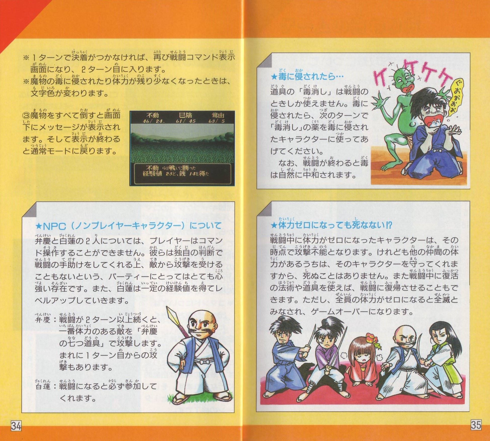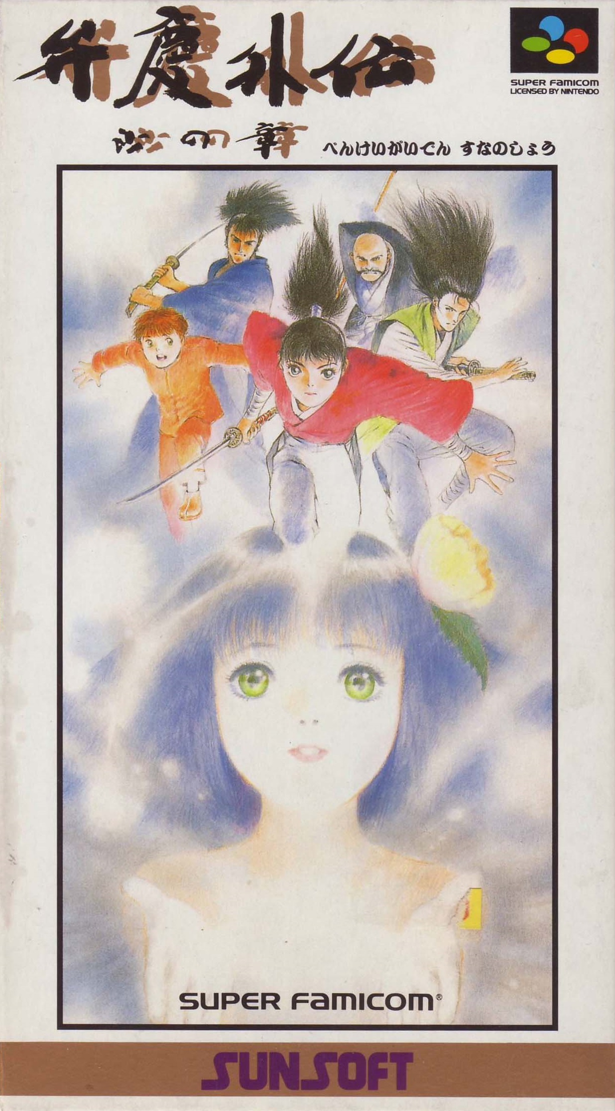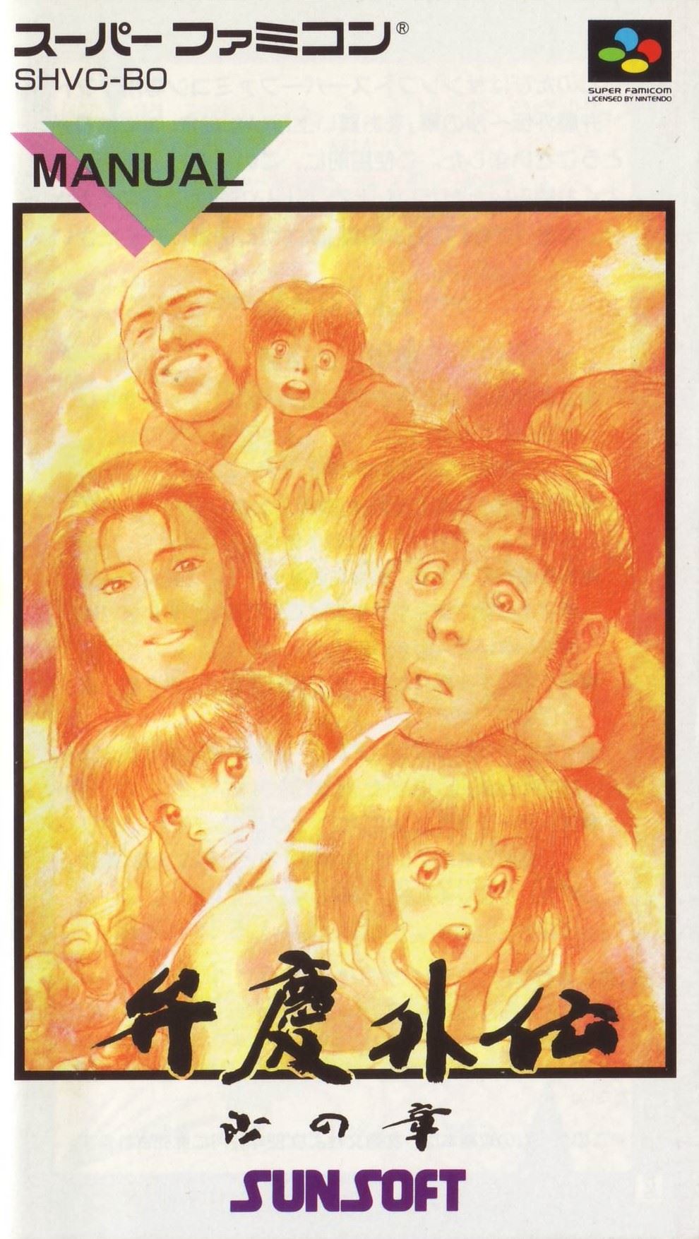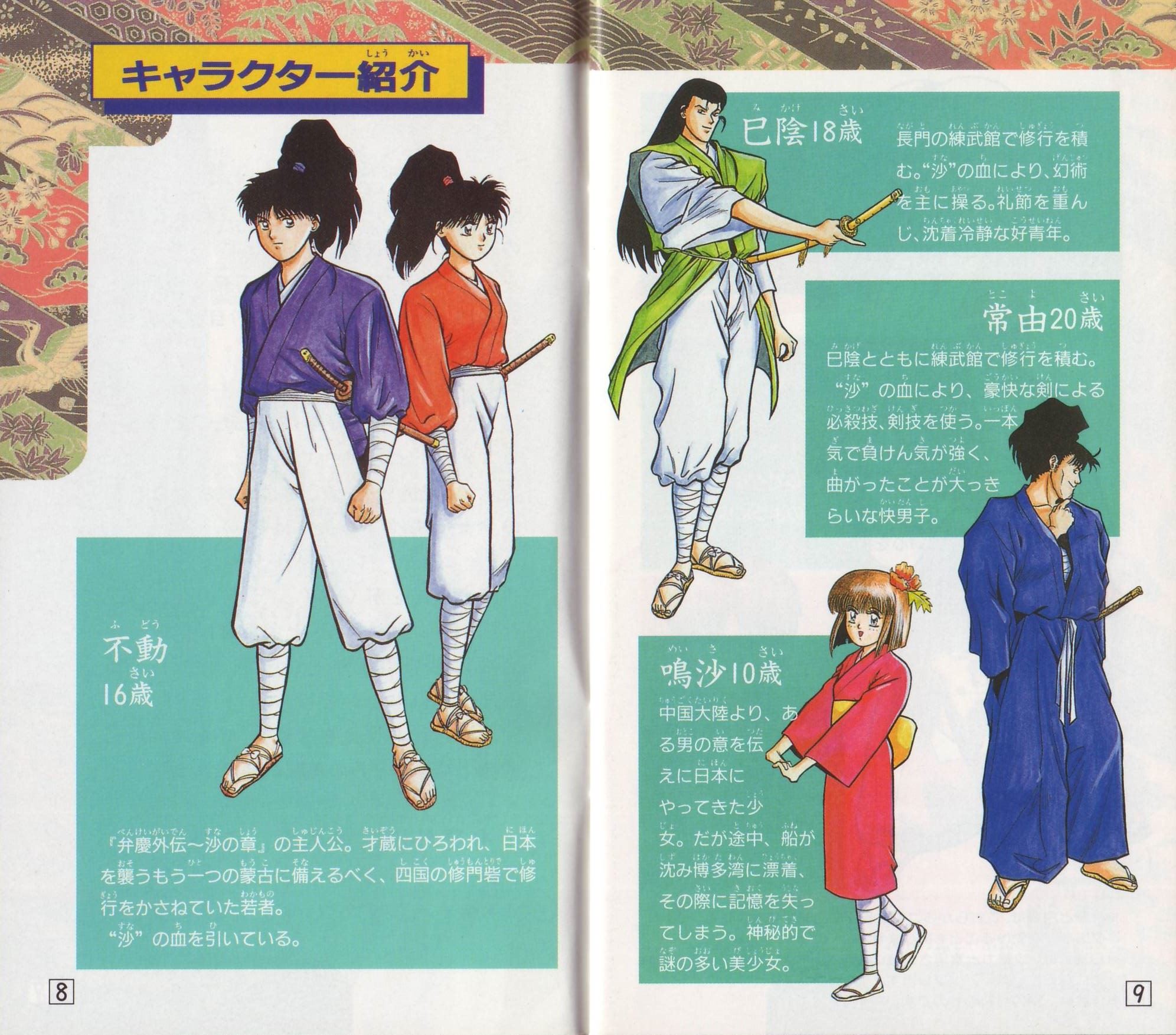 ごあいさつ歴史音痴だったぼくら制作スタッフが、"弁慶"さんとおつきあいするようになってから、もう五年になります。で、中国大陸への取材旅行から始まった今回の<冒険>でも二年以上。 少しでもよい作品を作るために七転八倒の試行錯誤を繰り返して、やっとここに『弁慶外伝 沙の章』をお届けできるまでに至りました。 善悪の判断すら難しい混乱の時代の中で信じるもののために、ひたむきに生きる兵たちの姿をお楽しみください。 そして、"弁慶"さんをはじめとする、この物語のすべての住人たちがみせる喜怒哀楽を、みなさんに少しでも受け止めて頂ければ、ぼくらスタッフ一同にとってこれに勝る喜びはありません。 また、感想・御意見等ありましたら、どんどんお手紙ください。そなえつけのアンケートハガキでもかまいません(これなら切手不要だよ!)。 すべてのお手紙にみんなが目を通しますからね。 平成4年12月 脚本担当 中村一朗 ゲームストーリー闇に葬られた歴史鎌倉に都が開かれて八十二年。最大の国難が日本を襲った。 文永十一年(西暦1274年)……文永の役 中国大陸全土の統一をもくろむ最強の大国「元」の蒙古軍襲来。 軍船九百隻、兵力三万三千という圧倒的な武力で守備隊を打ち破り、九州・博多を制圧した。 しかしその時、突然吹き荒れた暴風によって蒙古軍は壊滅的な打撃を受け、撤退を余儀なくされた。 その風が、強力な呪法によるものであったことを察した「元」の皇帝フビライ・カンは、配下の四界将"呪魂"を日本に送った… これを知った将軍・時宗は、呪魂の率いる呪界衆を迎え討つべく全国の法力者に発令した。 "源義経"と"武蔵坊弁慶"が平泉の合戦で討ち果たされたといわれてから八十余年が流れていた。 やがて、呪魂の手により発掘される吉野里の遺跡と呪法技術。 そして、四界将をも脅かす不死身の戦鬼・武蔵坊弁慶が、永き眠りより目覚めた時、彼らの真の旅が始まる…。 はたして、呪魂を日本に送ったフビライ・カンの目的とは? さらに、記憶を失って港に流れ着いた異国の少女"鳴沙"の正体は? すべての謎を解くべく、"沙"の血に導かれ"不動"たちは、八十余年前に平泉で消えた源義経の航路を追って、はるか中国大陸へとおもむいて行く。 闇に葬られた歴史を背景に、不動たちと呪界衆との血みどろの死闘が展開される。弁慶外伝 沙の章。ここに覚醒! キャラクター紹介不動(ふどう) 16歳『弁慶外伝 沙の章』の主人公。才蔵にひろわれ、日本を襲うもう一つの蒙古に備えるべく、四国の修門砦で修行をかさねていた若者。"沙"の血を引いている。 巳陰(みかげ) 18歳 長門の練武館で修行を積む。"沙"の血により、幻術を主に操る。礼節を重んじ、沈着冷静な好青年。 常世(とこよ) 20歳 巳陰とともに練武館で修行を積む。"沙"の血により、豪快な剣による必殺技、剣技を使う。一本気で負けん気が強く、曲がったことが大っきらいな快男子。 鳴沙(めいさ) 10歳 中国大陸より、ある男の意を伝えに日本にやってきた少女。だが途中、船が沈み博多湾に漂着、その際に記憶を失ってしまう。神秘的で謎の多い美少女。 忍(しのぶ) 18歳 薩摩を治める仁海堂春次の娘。呪魂と手を組んだ父・春次とたもとをわかち、不動らとともに戦うことを決意する。隻眼の女性。 弁慶(べんけい) ?歳 "弁慶の七つ道具"を集めることにより、不動たちの戦いをサポートしてくれる心強い男。親父のように広い心を持つ。 白蓮(びゃくれん) 10歳 父の意を継ぎ、不動とともに旅をすることになった、拳法少年。 ※弁慶と白蓮は、こちらからコマンドすることはできません。また、ダメージを受けることもありません。 ※白蓮には、攻撃力と素早さの値のみ存在します。また、一定の経験値になるとレベルアップします。 ※年齢は、旅の当初のものです。 才蔵(さいぞう) 四国・修門砦の長。幼かった不動の"沙"の血を見抜き、修門砦にて育てた。自らも法力を使う。 ハヤテ かつて才蔵の元で修行を積んだ男。現在は帝の元で諜報活動を中心に働いている。 羅観(らかん) 大陸より四界将・呪魂とともに日本に来た男。九州にて神獣鏡発掘が目的。 羅覚(らかく) 羅観の弟。兄の意を追い、それを越えようとする者。 コントローラーの使い方通常モードの使い方町の中やフィールドマップなど通常モードのときのコントローラーの使い方を説明します。 十字ボタン キャラクターやカーソルの移動に使用します。 Aボタン 1 人との会話に使用します(机ごしに会話できます)。 2 メッセージの送りに使用します。 3 コマンドの決定に使用します。 Bボタン 1 全員のステータス、所持金表示に使用します。 2 コマンドキャンセルに使用します。 Xボタン 1 道具や装備の入れ換えに使用します。道具や装備のリストを表示しているとき、一方の道具や装備にカーソルを合わせXボタンを押します。 するともう1つのカーソルが出ますから、そのカーソルをもう一方の入れ換えたい道具や装備に合わせXボタンを押します。 2 道具