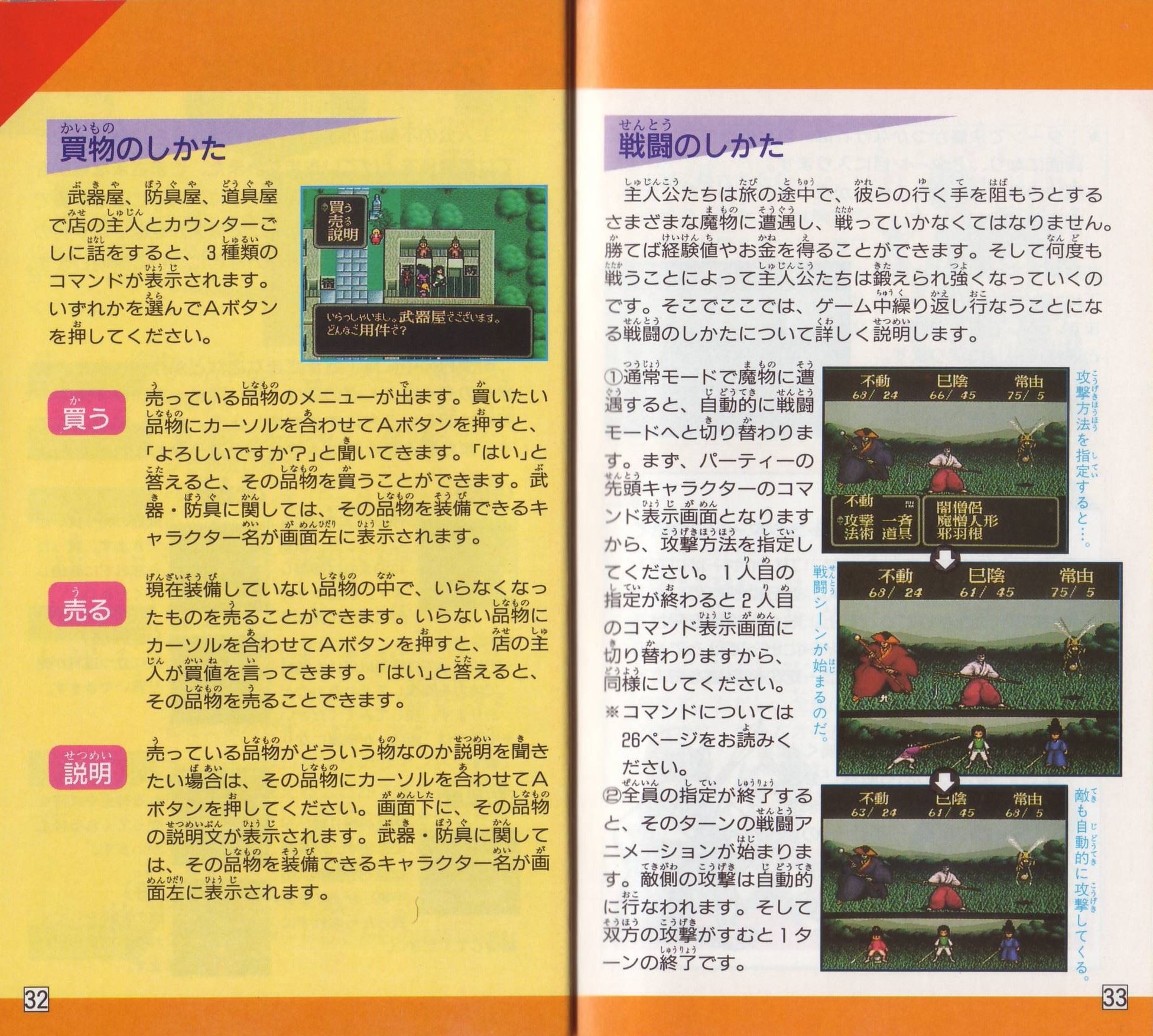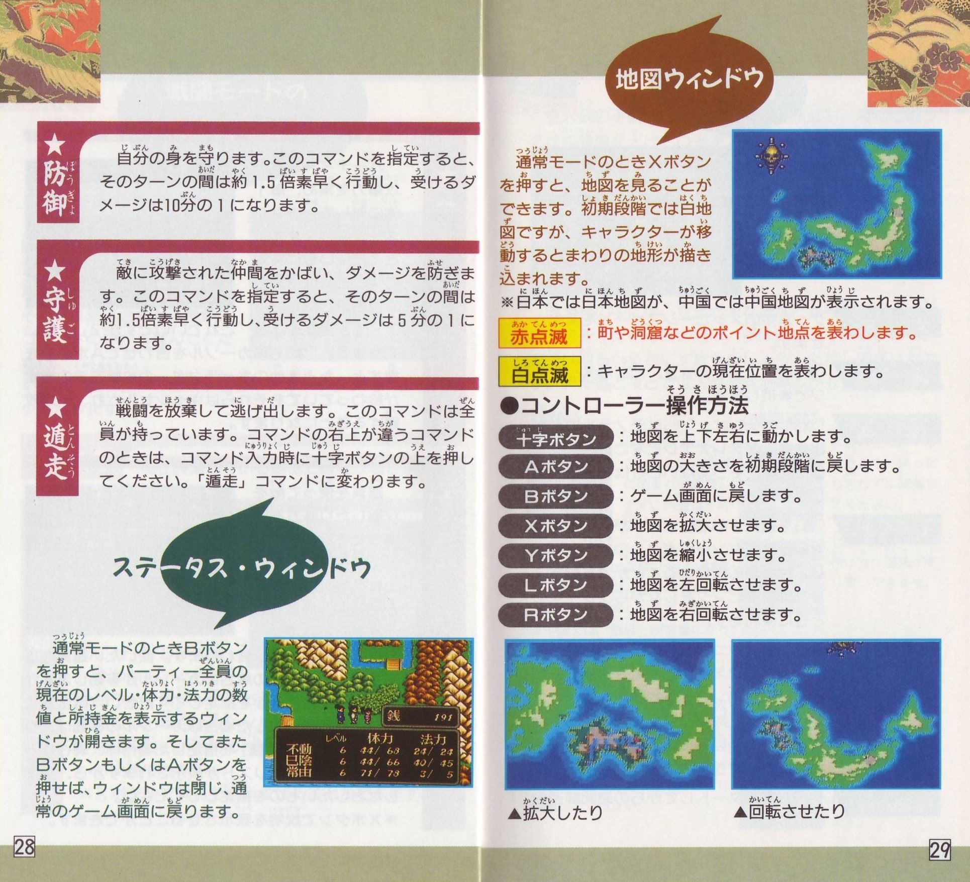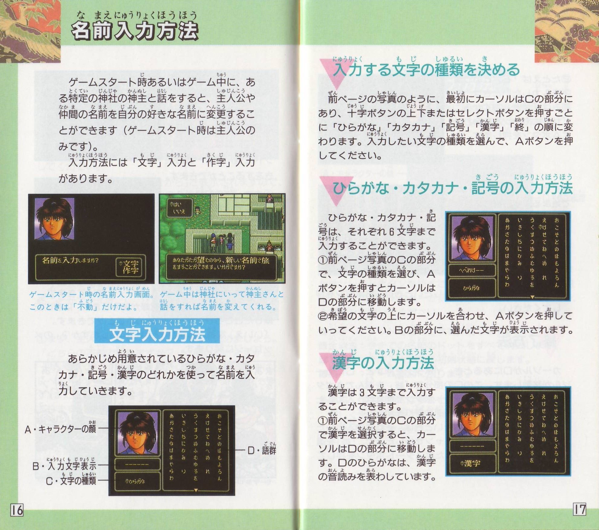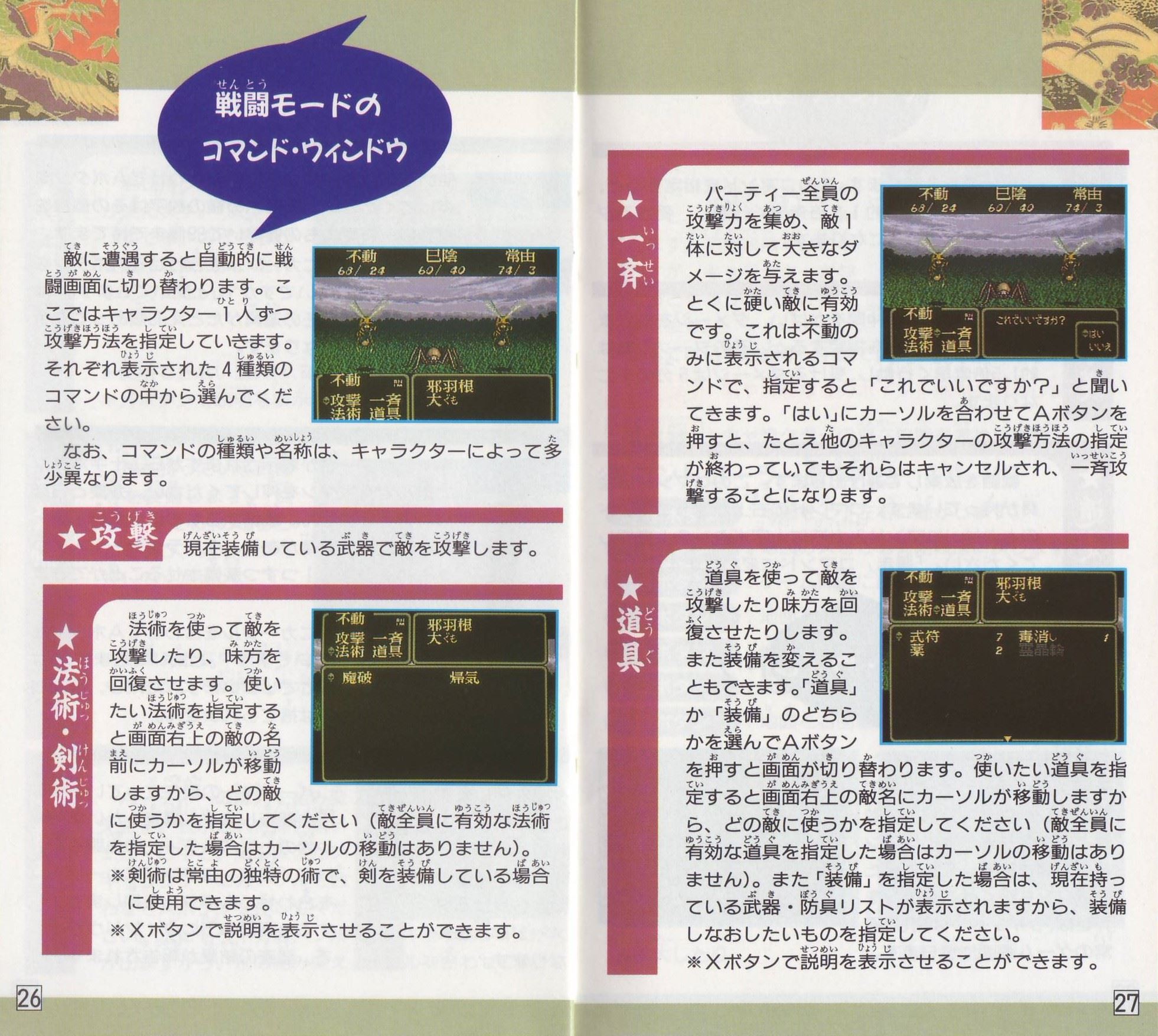 ごあいさつ歴史音痴だったぼくら制作スタッフが、"弁慶"さんとおつきあいするようになってから、もう五年になります。で、中国大陸への取材旅行から始まった今回の<冒険>でも二年以上。 少しでもよい作品を作るために七転八倒の試行錯誤を繰り返して、やっとここに『弁慶外伝 沙の章』をお届けできるまでに至りました。 善悪の判断すら難しい混乱の時代の中で信じるもののために、ひたむきに生きる兵たちの姿をお楽しみください。 そして、"弁慶"さんをはじめとする、この物語のすべての住人たちがみせる喜怒哀楽を、みなさんに少しでも受け止めて頂ければ、ぼくらスタッフ一同にとってこれに勝る喜びはありません。 また、感想・御意見等ありましたら、どんどんお手紙ください。そなえつけのアンケートハガキでもかまいません(これなら切手不要だよ!)。 すべてのお手紙にみんなが目を通しますからね。 平成4年12月 脚本担当 中村一朗 ゲームストーリー闇に葬られた歴史鎌倉に都が開かれて八十二年。最大の国難が日本を襲った。 文永十一年(西暦1274年)……文永の役 中国大陸全土の統一をもくろむ最強の大国「元」の蒙古軍襲来。 軍船九百隻、兵力三万三千という圧倒的な武力で守備隊を打ち破り、九州・博多を制圧した。 しかしその時、突然吹き荒れた暴風によって蒙古軍は壊滅的な打撃を受け、撤退を余儀なくされた。 その風が、強力な呪法によるものであったことを察した「元」の皇帝フビライ・カンは、配下の四界将"呪魂"を日本に送った… これを知った将軍・時宗は、呪魂の率いる呪界衆を迎え討つべく全国の法力者に発令した。 "源義経"と"武蔵坊弁慶"が平泉の合戦で討ち果たされたといわれてから八十余年が流れていた。 やがて、呪魂の手により発掘される吉野里の遺跡と呪法技術。 そして、四界将をも脅かす不死身の戦鬼・武蔵坊弁慶が、永き眠りより目覚めた時、彼らの真の旅が始まる…。 はたして、呪魂を日本に送ったフビライ・カンの目的とは? さらに、記憶を失って港に流れ着いた異国の少女"鳴沙"の正体は? すべての謎を解くべく、"沙"の血に導かれ"不動"たちは、八十余年前に平泉で消えた源義経の航路を追って、はるか中国大陸へとおもむいて行く。 闇に葬られた歴史を背景に、不動たちと呪界衆との血みどろの死闘が展開される。弁慶外伝 沙の章。ここに覚醒! キャラクター紹介不動(ふどう) 16歳『弁慶外伝 沙の章』の主人公。才蔵にひろわれ、日本を襲うもう一つの蒙古に備えるべく、四国の修門砦で修行をかさねていた若者。"沙"の血を引いている。 巳陰(みかげ) 18歳 長門の練武館で修行を積む。"沙"の血により、幻術を主に操る。礼節を重んじ、沈着冷静な好青年。 常世(とこよ) 20歳 巳陰とともに練武館で修行を積む。"沙"の血により、豪快な剣による必殺技、剣技を使う。一本気で負けん気が強く、曲がったことが大っきらいな快男子。 鳴沙(めいさ) 10歳 中国大陸より、ある男の意を伝えに日本にやってきた少女。だが途中、船が沈み博多湾に漂着、その際に記憶を失ってしまう。神秘的で謎の多い美少女。 忍(しのぶ) 18歳 薩摩を治める仁海堂春次の娘。呪魂と手を組んだ父・春次とたもとをわかち、不動らとともに戦うことを決意する。隻眼の女性。 弁慶(べんけい) ?歳 "弁慶の七つ道具"を集めることにより、不動たちの戦いをサポートしてくれる心強い男。親父のように広い心を持つ。 白蓮(びゃくれん) 10歳 父の意を継ぎ、不動とともに旅をすることになった、拳法少年。 ※弁慶と白蓮は、こちらからコマンドすることはできません。また、ダメージを受けることもありません。 ※白蓮には、攻撃力と素早さの値のみ存在します。また、一定の経験値になるとレベルアップします。 ※年齢は、旅の当初のものです。 才蔵(さいぞう) 四国・修門砦の長。幼かった不動の"沙"の血を見抜き、修門砦にて育てた。自らも法力を使う。 ハヤテ かつて才蔵の元で修行を積んだ男。現在は帝の元で諜報活動を中心に働いている。 羅観(らかん) 大陸より四界将・呪魂とともに日本に来た男。九州にて神獣鏡発掘が目的。 羅覚(らかく) 羅観の弟。兄の意を追い、それを越えようとする者。 コントローラーの使い方通常モードの使い方町の中やフィールドマップなど通常モードのときのコントローラーの使い方を説明します。 十字ボタン キャラクターやカーソルの移動に使用します。 Aボタン 1 人との会話に使用します(机ごしに会話できます)。 2 メッセージの送りに使用します。 3 コマンドの決定に使用します。 Bボタン 1 全員のステータス、所持金表示に使用します。 2 コマンドキャンセルに使用します。 Xボタン 1 道具や装備の入れ換えに使用します。道具や装備のリストを表示しているとき、一方の道具や装備にカーソルを合わせXボタンを押します。 するともう1つのカーソルが出ますから、そのカーソルをもう一方の入れ換えたい道具や装備に合わせXボタンを押します。 2 道具
