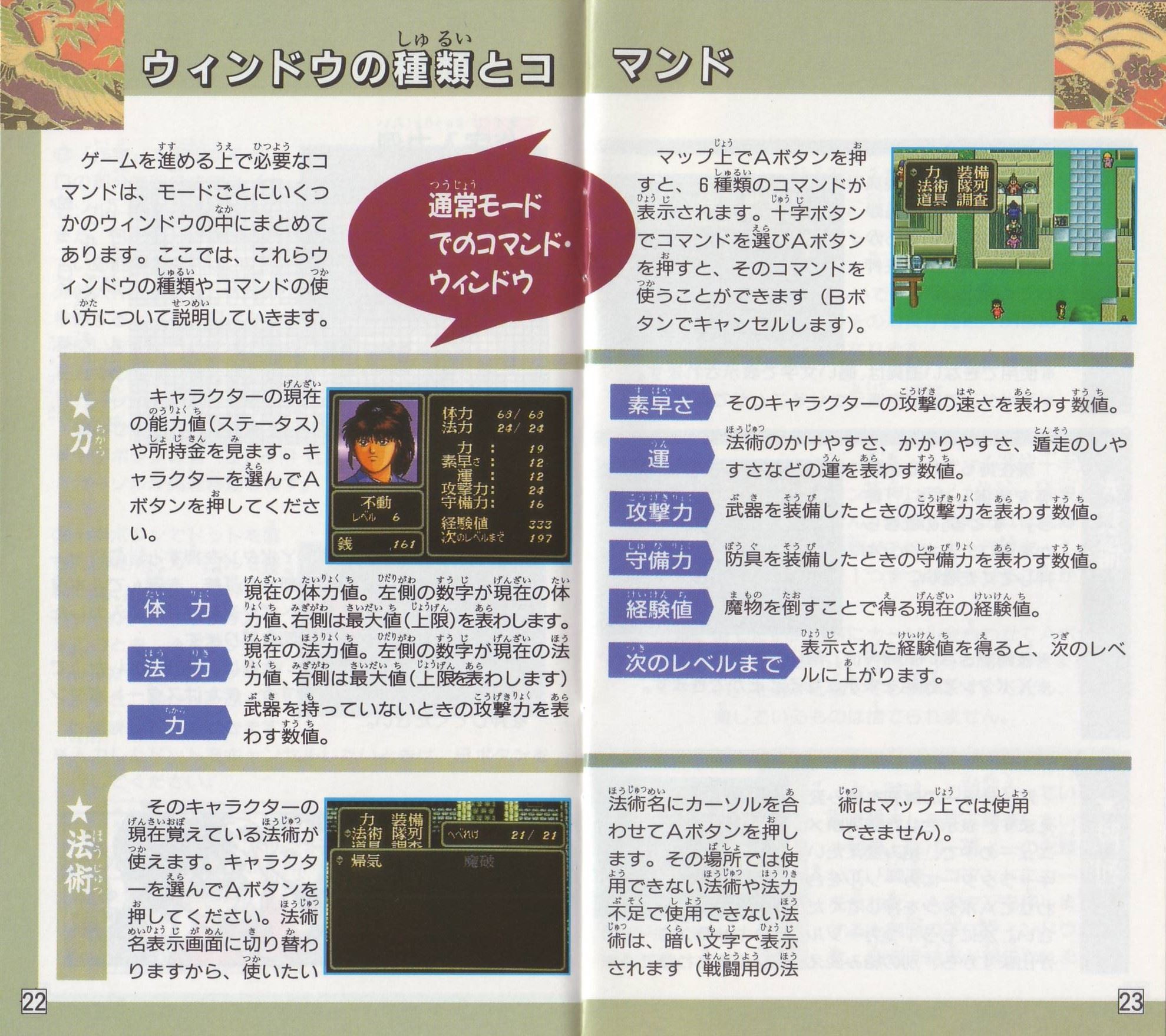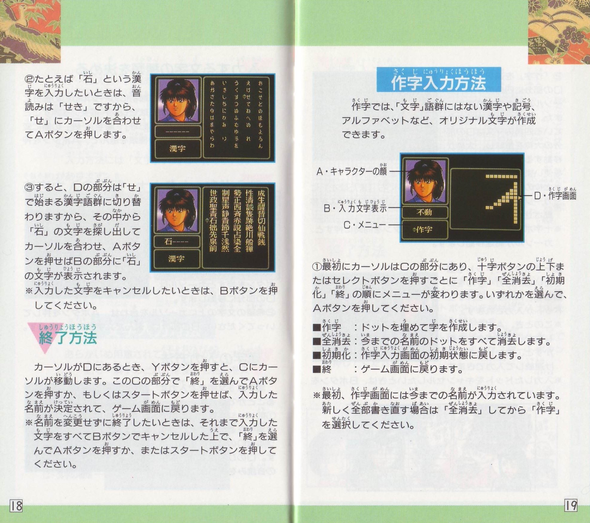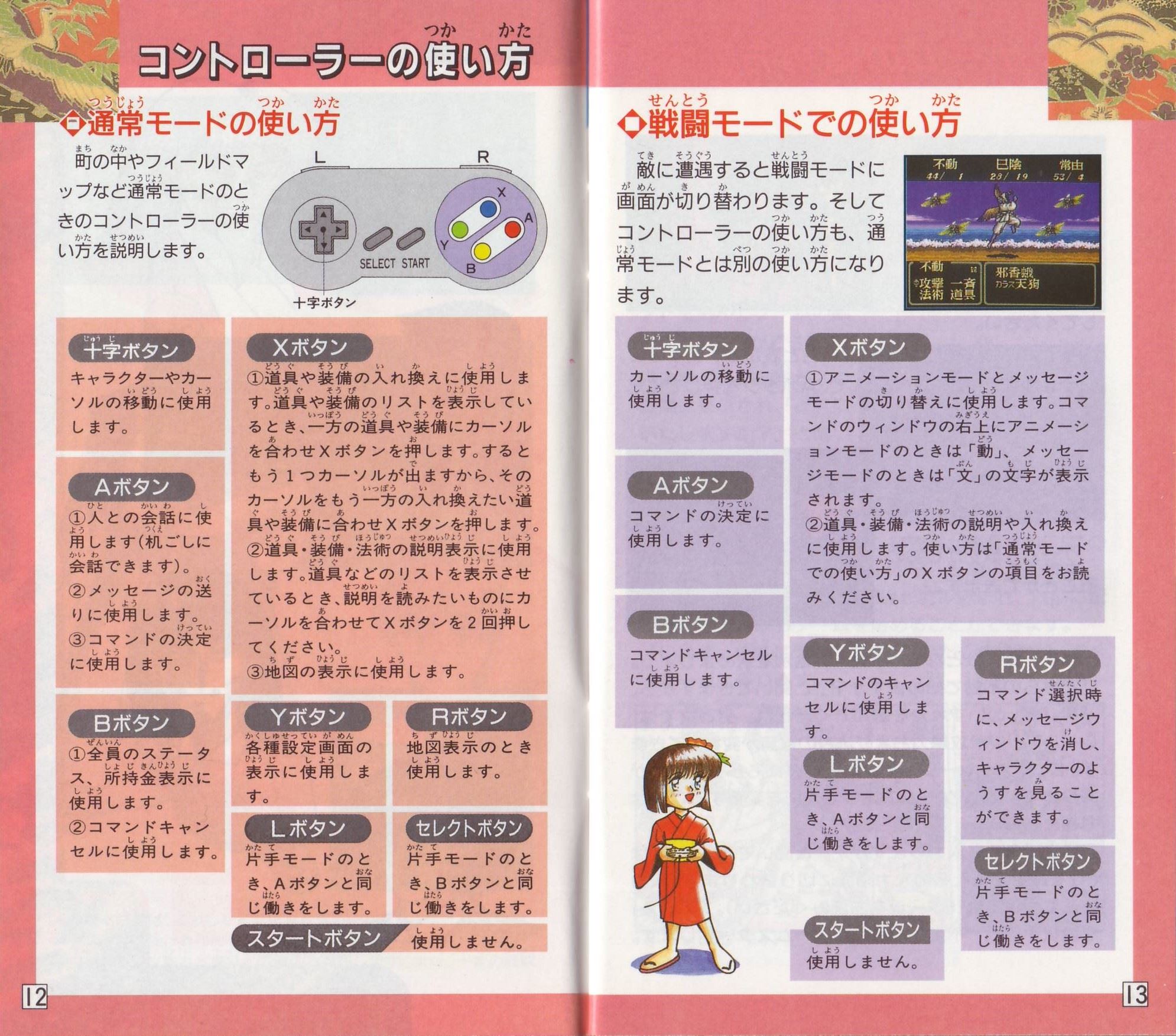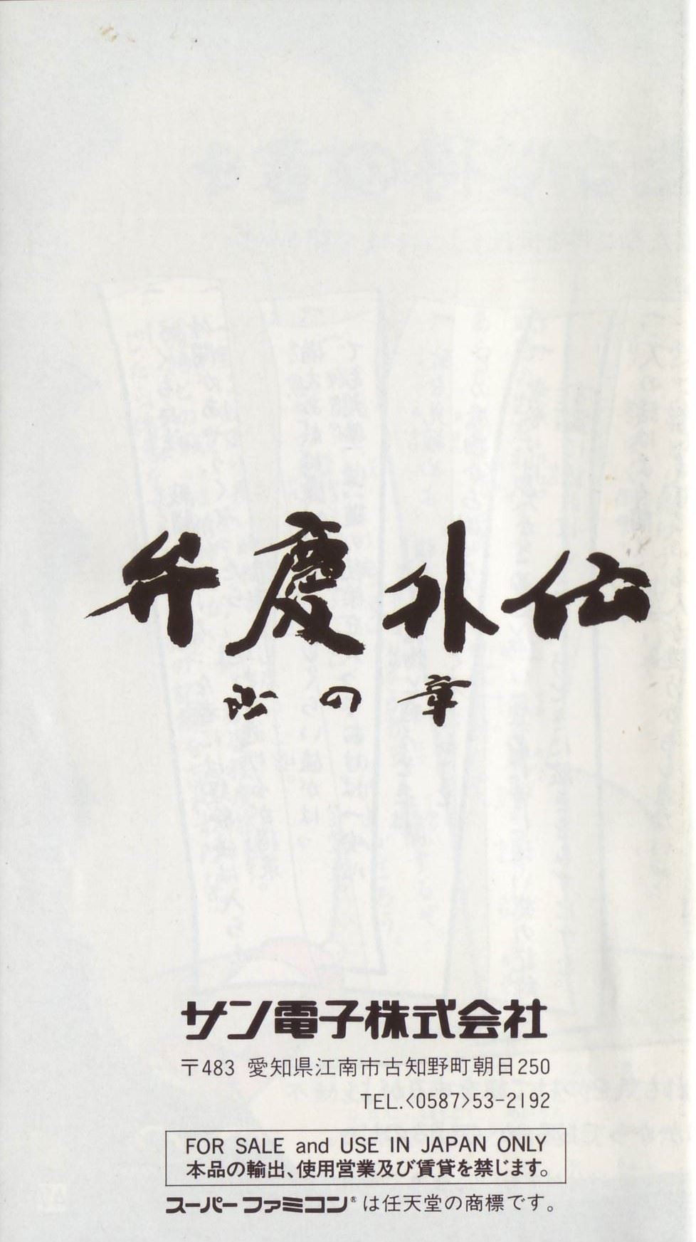 ごあいさつ歴史音痴だったぼくら制作スタッフが、"弁慶"さんとおつきあいするようになってから、もう五年になります。で、中国大陸への取材旅行から始まった今回の<冒険>でも二年以上。 少しでもよい作品を作るために七転八倒の試行錯誤を繰り返して、やっとここに『弁慶外伝 沙の章』をお届けできるまでに至りました。 善悪の判断すら難しい混乱の時代の中で信じるもののために、ひたむきに生きる兵たちの姿をお楽しみください。 そして、"弁慶"さんをはじめとする、この物語のすべての住人たちがみせる喜怒哀楽を、みなさんに少しでも受け止めて頂ければ、ぼくらスタッフ一同にとってこれに勝る喜びはありません。 また、感想・御意見等ありましたら、どんどんお手紙ください。そなえつけのアンケートハガキでもかまいません(これなら切手不要だよ!)。 すべてのお手紙にみんなが目を通しますからね。 平成4年12月 脚本担当 中村一朗 ゲームストーリー闇に葬られた歴史鎌倉に都が開かれて八十二年。最大の国難が日本を襲った。 文永十一年(西暦1274年)……文永の役 中国大陸全土の統一をもくろむ最強の大国「元」の蒙古軍襲来。 軍船九百隻、兵力三万三千という圧倒的な武力で守備隊を打ち破り、九州・博多を制圧した。 しかしその時、突然吹き荒れた暴風によって蒙古軍は壊滅的な打撃を受け、撤退を余儀なくされた。 その風が、強力な呪法によるものであったことを察した「元」の皇帝フビライ・カンは、配下の四界将"呪魂"を日本に送った… これを知った将軍・時宗は、呪魂の率いる呪界衆を迎え討つべく全国の法力者に発令した。 "源義経"と"武蔵坊弁慶"が平泉の合戦で討ち果たされたといわれてから八十余年が流れていた。 やがて、呪魂の手により発掘される吉野里の遺跡と呪法技術。 そして、四界将をも脅かす不死身の戦鬼・武蔵坊弁慶が、永き眠りより目覚めた時、彼らの真の旅が始まる…。 はたして、呪魂を日本に送ったフビライ・カンの目的とは? さらに、記憶を失って港に流れ着いた異国の少女"鳴沙"の正体は? すべての謎を解くべく、"沙"の血に導かれ"不動"たちは、八十余年前に平泉で消えた源義経の航路を追って、はるか中国大陸へとおもむいて行く。 闇に葬られた歴史を背景に、不動たちと呪界衆との血みどろの死闘が展開される。弁慶外伝 沙の章。ここに覚醒! キャラクター紹介不動(ふどう) 16歳『弁慶外伝 沙の章』の主人公。才蔵にひろわれ、日本を襲うもう一つの蒙古に備えるべく、四国の修門砦で修行をかさねていた若者。"沙"の血を引いている。 巳陰(みかげ) 18歳 長門の練武館で修行を積む。"沙"の血により、幻術を主に操る。礼節を重んじ、沈着冷静な好青年。 常世(とこよ) 20歳 巳陰とともに練武館で修行を積む。"沙"の血により、豪快な剣による必殺技、剣技を使う。一本気で負けん気が強く、曲がったことが大っきらいな快男子。 鳴沙(めいさ) 10歳 中国大陸より、ある男の意を伝えに日本にやってきた少女。だが途中、船が沈み博多湾に漂着、その際に記憶を失ってしまう。神秘的で謎の多い美少女。 忍(しのぶ) 18歳 薩摩を治める仁海堂春次の娘。呪魂と手を組んだ父・春次とたもとをわかち、不動らとともに戦うことを決意する。隻眼の女性。 弁慶(べんけい) ?歳 "弁慶の七つ道具"を集めることにより、不動たちの戦いをサポートしてくれる心強い男。親父のように広い心を持つ。 白蓮(びゃくれん) 10歳 父の意を継ぎ、不動とともに旅をすることになった、拳法少年。 ※弁慶と白蓮は、こちらからコマンドすることはできません。また、ダメージを受けることもありません。 ※白蓮には、攻撃力と素早さの値のみ存在します。また、一定の経験値になるとレベルアップします。 ※年齢は、旅の当初のものです。 才蔵(さいぞう) 四国・修門砦の長。幼かった不動の"沙"の血を見抜き、修門砦にて育てた。自らも法力を使う。 ハヤテ かつて才蔵の元で修行を積んだ男。現在は帝の元で諜報活動を中心に働いている。 羅観(らかん) 大陸より四界将・呪魂とともに日本に来た男。九州にて神獣鏡発掘が目的。 羅覚(らかく) 羅観の弟。兄の意を追い、それを越えようとする者。 コントローラーの使い方通常モードの使い方町の中やフィールドマップなど通常モードのときのコントローラーの使い方を説明します。 十字ボタン キャラクターやカーソルの移動に使用します。 Aボタン 1 人との会話に使用します(机ごしに会話できます)。 2 メッセージの送りに使用します。 3 コマンドの決定に使用します。 Bボタン 1 全員のステータス、所持金表示に使用します。 2 コマンドキャンセルに使用します。 Xボタン 1 道具や装備の入れ換えに使用します。道具や装備のリストを表示しているとき、一方の道具や装備にカーソルを合わせXボタンを押します。 するともう1つのカーソルが出ますから、そのカーソルをもう一方の入れ換えたい道具や装備に合わせXボタンを押します。 2 道具