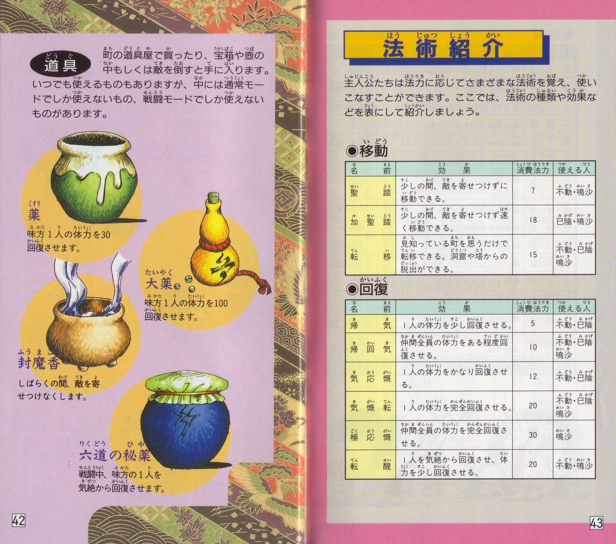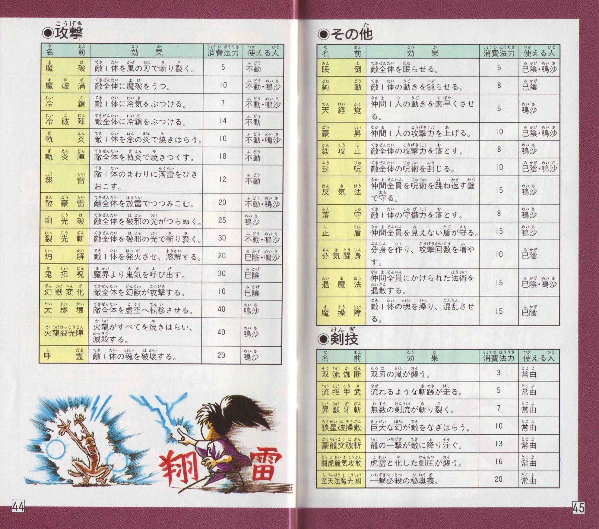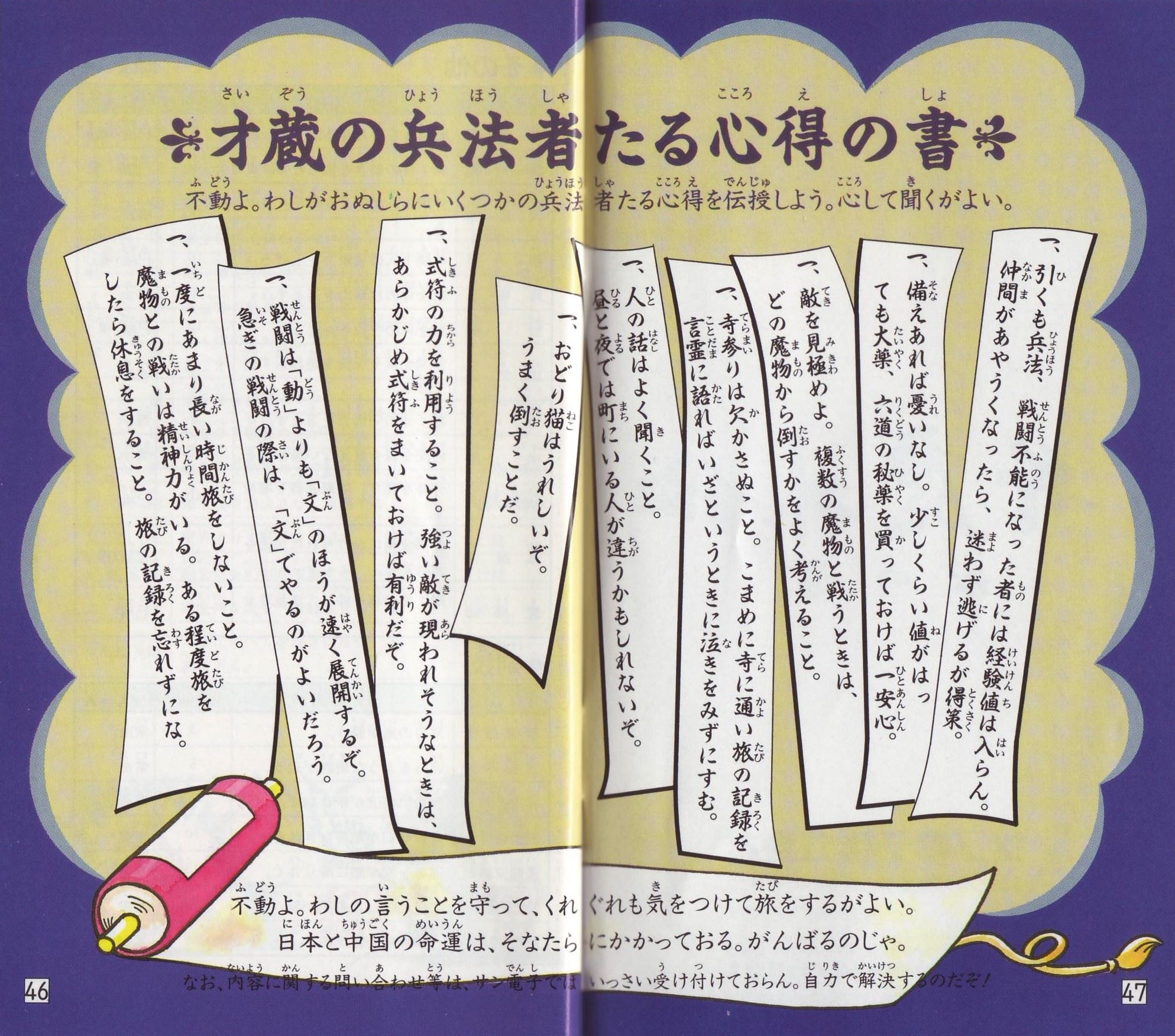 才蔵の兵法者たる心得の書不動よ。わしがおぬしらにいくつかの兵法者たる心得を伝授しよう。心して聞くがよい。一、一度にあまり長い時間旅をしないこと。魔物との戦いは精神力がいる。ある程度旅をしたら休息をすること。旅の記録を忘れずにな。 一、戦闘は「動」よりも「文」のほうが速く展開するぞ。急ぎの戦闘の際は、「文」でやるのがよいだろう。 一、式符の力を利用すること。強い敵が現れそうなときは、あらかじめ式符をまいておけば有利だぞ。 一、おどり猫はうれしいぞ。うまく倒すことだ。 一、人の話はよく聞くこと。昼と夜では町にいる人が違うかもしれないぞ。 一、寺参りは欠かさぬこと。こまめに寺に通い旅の記録を言霊に語ればいざというときに泣きをみずにすむ。 一、敵を見極めよ。複数の魔物と戦うときは、どの魔物から倒すかをよく考えること。 一、備えあれば憂いなし。少しくらい値がはっても大薬、六道の秘薬を買っておけば一安心。 一、引くも兵法、戦闘不能になった者には経験値は入らん。仲間があやうくなったら、迷わず逃げるが得策。 不動よ。わしの言うことを守って、くれぐれも気をつけて旅をするがよい。日本と中国の命運は、そなたらにかかっておる。がんばるのじゃ。 なお、内容に関する問い合わせ等は、サン電子ではいっさい受け付けておらん。自力で解決するのだぞ! |