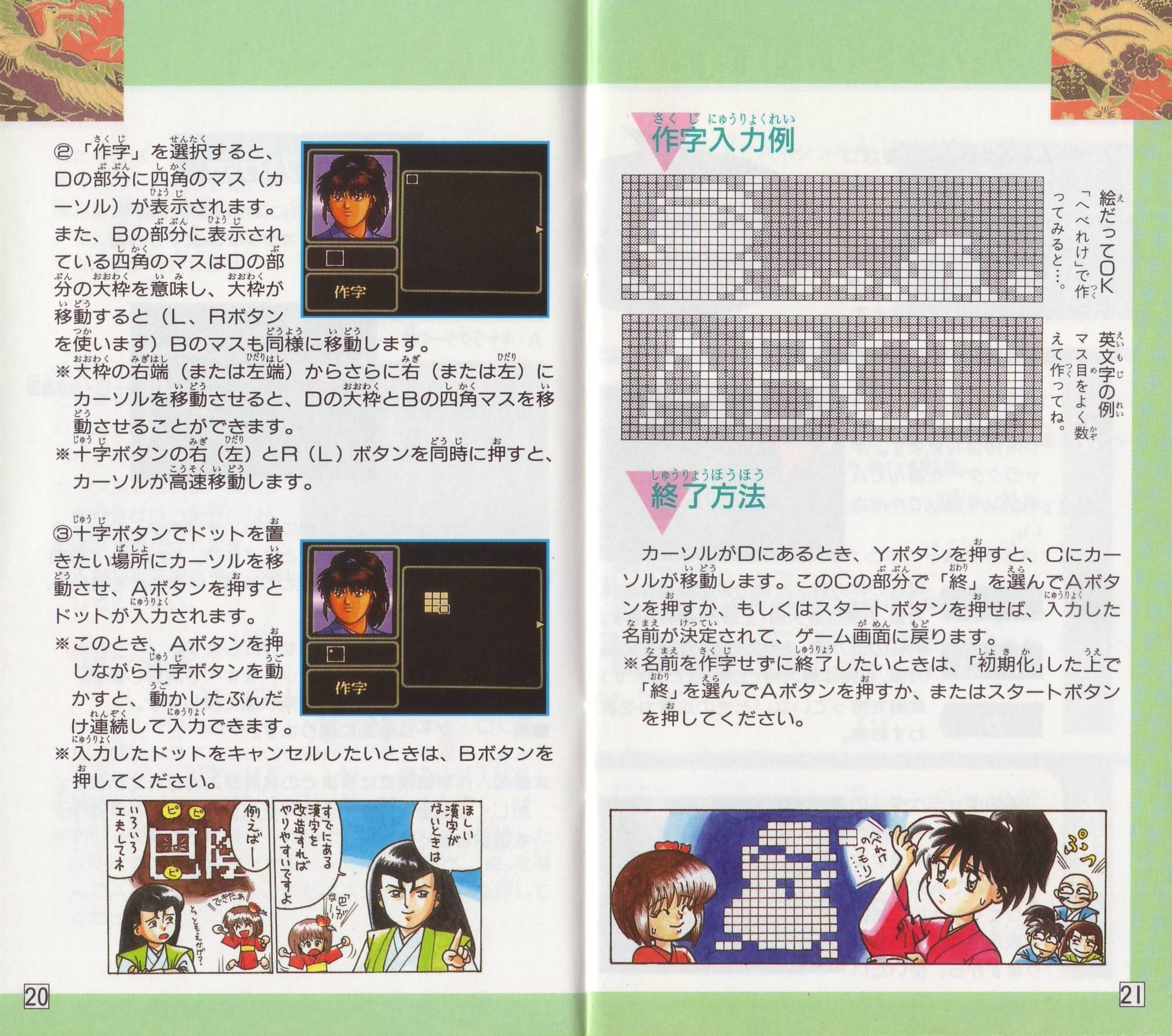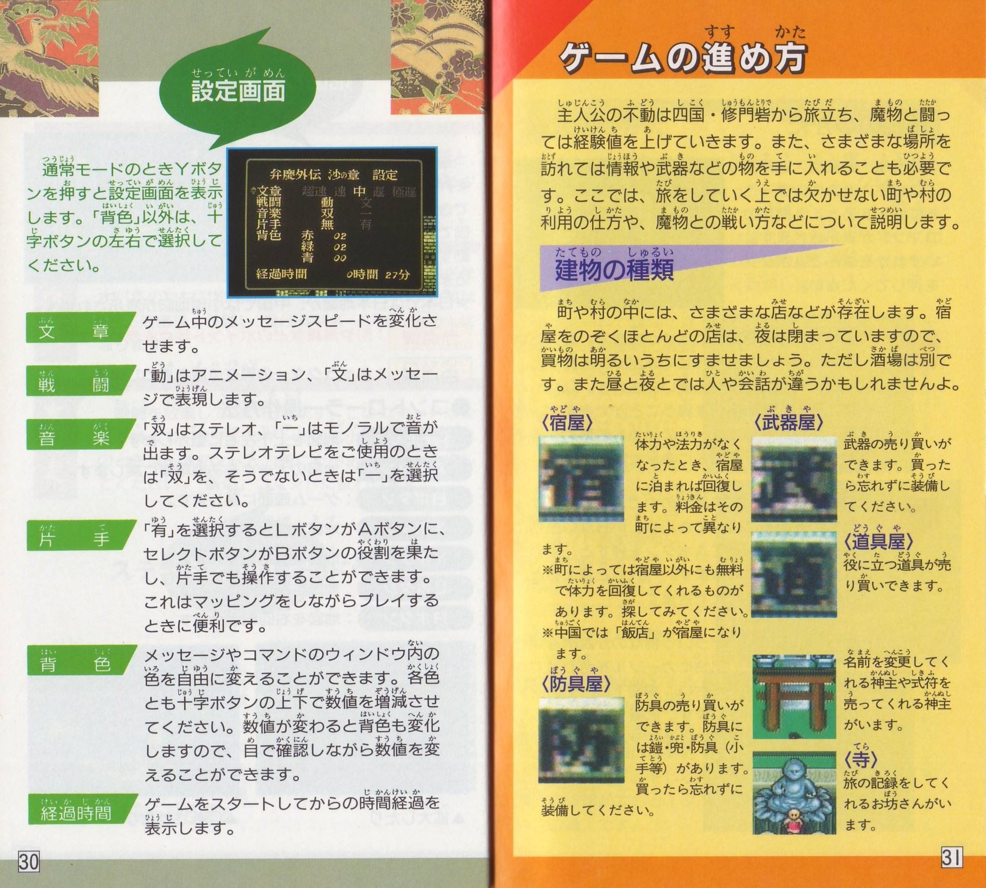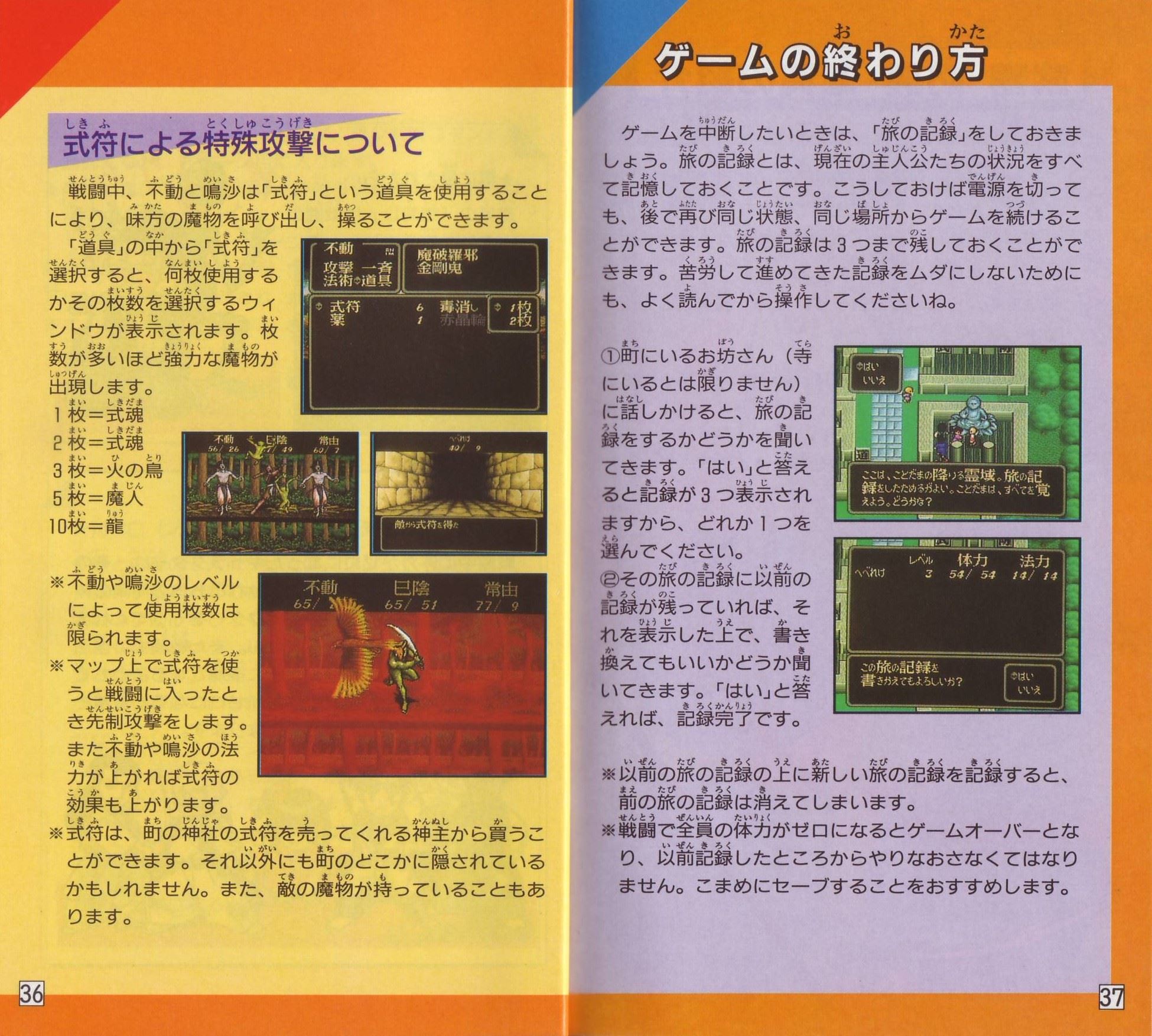 才蔵の兵法者たる心得の書不動よ。わしがおぬしらにいくつかの兵法者たる心得を伝授しよう。心して聞くがよい。一、一度にあまり長い時間旅をしないこと。魔物との戦いは精神力がいる。ある程度旅をしたら休息をすること。旅の記録を忘れずにな。 一、戦闘は「動」よりも「文」のほうが速く展開するぞ。急ぎの戦闘の際は、「文」でやるのがよいだろう。 一、式符の力を利用すること。強い敵が現れそうなときは、あらかじめ式符をまいておけば有利だぞ。 一、おどり猫はうれしいぞ。うまく倒すことだ。 一、人の話はよく聞くこと。昼と夜では町にいる人が違うかもしれないぞ。 一、寺参りは欠かさぬこと。こまめに寺に通い旅の記録を言霊に語ればいざというときに泣きをみずにすむ。 一、敵を見極めよ。複数の魔物と戦うときは、どの魔物から倒すかをよく考えること。 一、備えあれば憂いなし。少しくらい値がはっても大薬、六道の秘薬を買っておけば一安心。 一、引くも兵法、戦闘不能になった者には経験値は入らん。仲間があやうくなったら、迷わず逃げるが得策。 不動よ。わしの言うことを守って、くれぐれも気をつけて旅をするがよい。日本と中国の命運は、そなたらにかかっておる。がんばるのじゃ。 なお、内容に関する問い合わせ等は、サン電子ではいっさい受け付けておらん。自力で解決するのだぞ! |