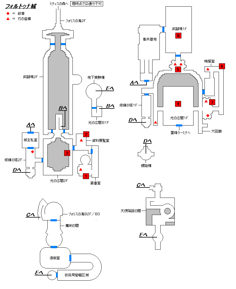 | 紋章を動かす ↓ 鉄格子が降りて通路ができる ↓ 刃の歯車を動かして反対側に運ぶ (中央にある台座には乗せないこと) ↓ 2台の刃の歯車を乗せると結界が解かれる ↓ 武闘場へ行くとボス戦闘 |