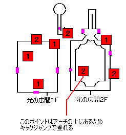 | 制限時間2分以内に合計99個のレッドオーブを入手する レッドオーブは見えずその場所に行く事で出現して入手できる 2箇所ランダムで配置されるため下記のマップの通りに入手していこう 例 1のポイントで出現すれば全て1のポイントで出現する 1のポイントで出現しなければ2のポイントで出現する ![]() |