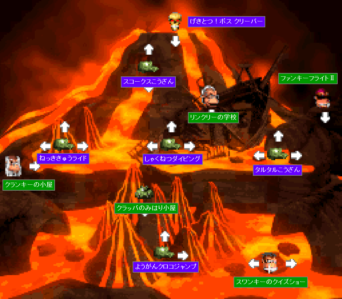 触れると水面にクロコが顔を出して出現する 一度出現すると常に顔を出しているクロコと一定時間経過すると沈んでしまうクロコがいる 緑色のクロコは単なる足場で 茶色のクロコは頭の上に乗るとコングをジャンプさせて放り投げる |
