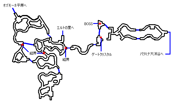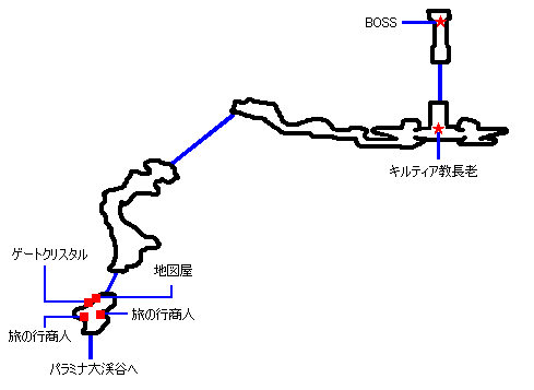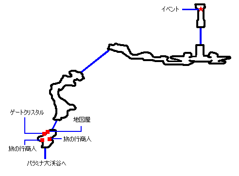 | 地図屋で【パラミナ大渓谷の地図】【神都ブルオミシェイスの地図】を買う ↓ 大僧正の所へ行くとイベント ↓ ラーサーがゲストから離脱 ↓ パラミナ大渓谷へ戻る 出現する敵 なし 入手するアイテム なし ポイント ラーサーは攻撃力が高めなのでパーティから離脱する前に40レベルはあげておこう マップを参考にしてチョコボに乗っていこう |