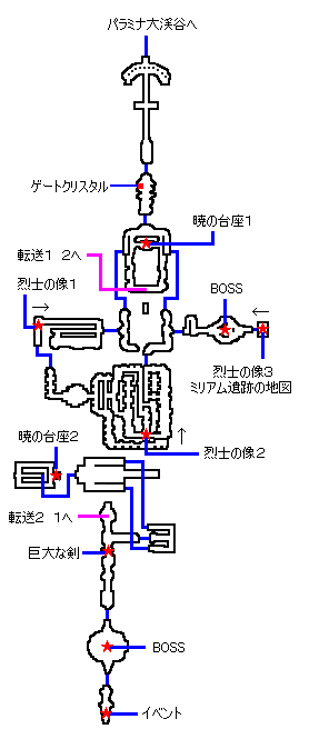 | 暁の断片を装備して【暁の台座1】に触れる ↓ 次の【暁の台座2】に触れる ↓ 隠し階段が出現するので降りる ↓ マップを参考に巨大な剣の所で調べる ↓ 後ろの扉が開くので転送装置で戻る ↓ 烈士の像1のある場所へ行く ↓ マップを参考に【烈士の像1】【烈士の像2】を矢印方向に回す (全部で3体) ↓ 【烈士の像3】へ向かう ↓ BOSS【ヴィヌスカラ】と戦闘 ↓ 奥の扉へ進む ↓ トレジャーボックスから【ミリアム遺跡の地図】を入手 ↓ マップを参考に【烈士の像3】を矢印方向へ回す ↓ 巨大な剣が上がり通路が出現 ↓ BOSS【マティウス】と戦闘 ↓ マティウスの召喚を授かる ↓ 奥の扉へ入る ↓ イベント ↓ 【覇王の剣】を入手する ↓ 外へ出る ↓ ゲートクリスタルで神都ブルオミシェイスへ戻る 出現する敵 レッドマウス ゾンビファイター ヒルギガース ダークメア フェイス バルーン ミリアムガード グール ミリアムフェイス ドラゴンエイビス ガスト クリスタルバグ 出現するBOSS ヴィヌスカラ マティウス 入手するアイテム 覇王の剣(イベント) ポイント 暁の断片を装備したキャラのMPが0になってしまうので 戦闘に参加させないキャラに装備させよう ヴィヌスカラ戦ではレベルが40以上あれば弱いボスなので袋叩きにしてしまおう マティウス戦では攻撃する際はまず 周辺のザコを先に倒そう マティウスの攻撃でスリップになったらエスナですぐに治そう 時々、ブリザジャを使ってくるので喰らってしまったら ケアルラやケアルガで回復しよう 回復しないとGAMEOVERになる恐れがあるので気をつけよう ミリアム遺跡を出たあとテレポストーンに余裕があれば ゲートクリスタルで神都ブルオミシェイスへ素早く戻ろう |
