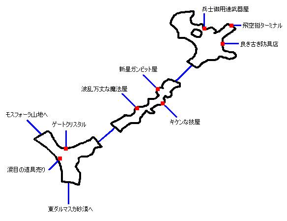 | マップを参考に進む ↓ ハンターズキャンプへ行く ↓ 会話イベント ↓ 地図屋から【フォーン海岸の地図】を買う ↓ ツィッタ大草原へ向かう 出現する敵 シルバリオ ピラニア マンドラゴラ シュメルケ ピロリスク バドゥ 入手するアイテム 特になし ポイント ハンターズキャンプで装備を整えよう またギルに余裕があればチョコボ屋でチョコボを借りてツィッタ大草原へ向かおう |