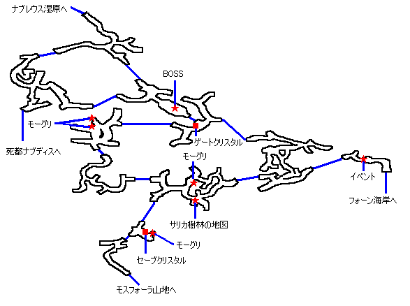 | 地図屋から【モスフォーラ山地の地図】を買う ↓ マップを参考にサリカ樹林を目指す 出現する敵 ウォーグウルフ フンババ バイソン ヴァルチャー ディコタイタス 入手するアイテム モスフォーラ山地の地図(地図屋) ポイント 敵が手ごわいのでここの敵を十分に倒せるようになるまでレベル上げしよう 商人ルシオから装備を整えてからサリカ樹林へ行こう |