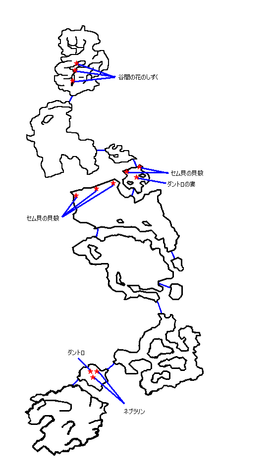 | モブ 花サボテンを討伐・依頼人のダントロに報告 ↓ もう一度、ダントロに話しかけて入手した花サボテンを妻に届けるように頼まれる ↓ ダントロの妻にセム貝の貝殻を頼まれる ↓ 砂浜で光っているセム貝の貝殻を拾ってきて渡す ↓ ダントロの妻にセム貝の貝殻を渡すとネブラリンを頼まれる ↓ ダントロの所へ戻って近くの荷物の山を調べてネブラリンを入手する ↓ ダントロの妻にネブラリンを渡すと谷間の花のしずくを頼まれる ↓ マップを参考に桜の花から谷間の花のしずくを入手する ↓ 谷間の花のしずくをダントロの妻に渡す ↓ 画面を何度も切り替えると旅人が回復してバルハイムのカギがもらえる ※セム貝の貝殻5個 ネブラリン2個 谷間の花のしずく3個 大蛇の抜け殻を渡すと金のアミュレットを入手 ※セム貝の貝殻3個以上拾って谷間の花のしずくと同時に大蛇の抜け殻を渡すと魔法の手袋を入手 ※それ以外はバランスの魔片を入手 ※何か3つあげれば病人は回復するのでまとめてあげる時は一度に渡す必要がある ※大蛇の抜け殻はモブ 【ニーズヘッグ】を討伐後に入手できるが 二度と入手不能なので売らないように気をつけよう |
