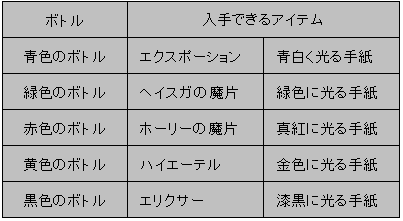 | 黄色のボトル(サブイベント竜の研究家をクリア後に可能) | ||||||||||||||||||||||||||||||||||||