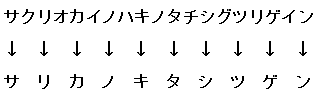 | 暗号文 飛び石にて川をわたり飛び石にて岸へ帰る サクリオカイノハキノタチシグツリゲイン 解答 飛び石の様に1文字を飛び越えて読んでみよう