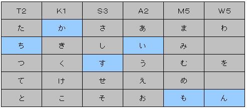 | 暗号文 文字は扉数はカギ小さき者に導かれん T2K1S3A2M5W5 解答 ガラムサイズ水路の水門のこと 下記の表の様にT2の場合、た行の2番目で「ち」となる