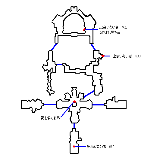 | 王都ラバナスタ・南門にいるであいたい者に話しかける※1 ↓ ヤムラのガンビット店に行き、また話しかける※2 ↓ 砂海邸に行き、再び話しかける※3 ↓ 外門前広場にいる愛を求める男 ヤムラのガンビットショップにいるうぬぼれ屋さんのどちらかの依頼を引き受ける ↓ 砂海邸にいるであいたい者に話しかけた愛を求める男またはうぬぼれ屋さんどちらかを紹介 ※両方ともに話しかけた場合は、どちらかを選択 ↓ であえた者または彼氏に話しかけて報酬をもらおう 報酬 ★愛を求める男の場合 ロクスリーの矢/ハイポーション×2 ★うぬぼれ屋さんの場合 ロクスリーの矢 |
