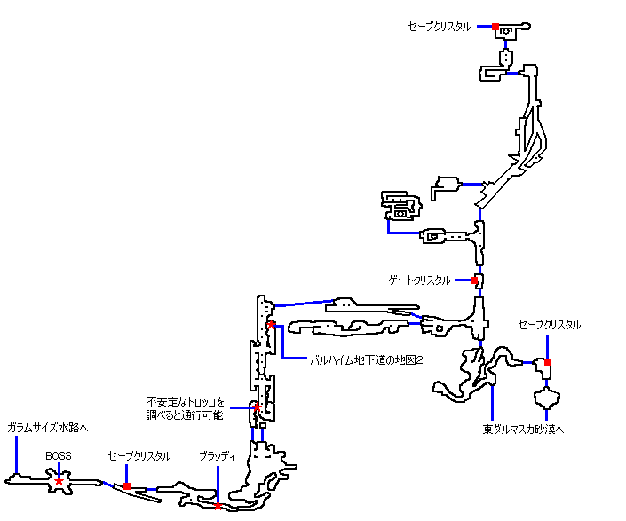 | 東ダルマスカ砂漠(南側集落)へ行く ↓ 海岸付近にいる囚人381号から情報を聞く ↓ ネブラ河の周辺にあるバルハイム地下道から入る 【サブイベントの砂漠の病人をクリアしたあと通行可能】 ※ サブイベント【砂漠の病人】はコチラ ↓ 途中でバルハイム地下道の地図2を入手 ↓ 不安定なトロッコを調べて道を作る ↓ ブラッディを倒す ↓ 囚人381号に報告 ドンムブにして動けなくしてから味方全員にリフレクをかけて 魔法攻撃のファイガを味方に放って跳ね返そう HPが減ると【吸血】をして回復するので長期戦になりやすい 注意! 下記のマップでガラムサイズ水路へ通じる所では ボス召還獣の【ザルエラ】と戦闘になるので行きすぎないように気をつけよう |
