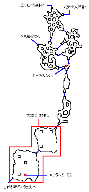 | ダウンタウン(ダランの家)へ行く ↓ ココミンから情報を聞く ↓ 幻妖の森へ行く ↓ キングヘビーモスを倒す ↓ ココミンに報告 キングヘビーモスは周囲の敵を倒すと出現するので【英知の氷原】【思の最果て】にいるザコを全滅させよう この時、関係ないマップはいかないこと 全滅させるとキングヘビーモスが出現するので戦闘開始前に プロテス・シェル・リジュネ・ヘイストの補助魔法をかけておこう 物理攻撃無効と魔法攻撃無効を切り替えるので 魔法攻撃が無効になったら普通の集中攻撃を 物理攻撃が無効になったら魔法攻撃というように攻撃していこう またアレイズ2回かバランス3回をキングヘビーモスに使うと 魔法攻撃無効の状態に戻せるので魔法より普通に集中攻撃したい場合はオススメ ココミンに討伐報告後、神都ブルオミシェイシスへ行ってみよう ヴァンの装備を外して【竜の鼻】を調べて【叩く】をしてみると アイテム【50万ギル】【フェイスロッド】を入手できる 竜の鼻がある位置はこちら |