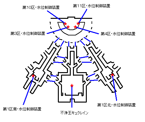 | 下記マップを参考に水位制御装置を操作する ※ この時点で1つでも閉鎖されている水門がある場合は全て開放しておこう 1 第3区・水位制御装置と第10区・制御装置を操作して水門を閉鎖する 2 第1区南・水位制御装置を操作して水門を閉鎖する 3 第4区・水位制御装置と第11区・水位制御装置を操作して水門を閉鎖する 4 第1区北・水位制御装置を操作して水門を閉鎖する 5 第3区・水位制御装置と第4区・水位制御装置を操作して水門を閉鎖する |