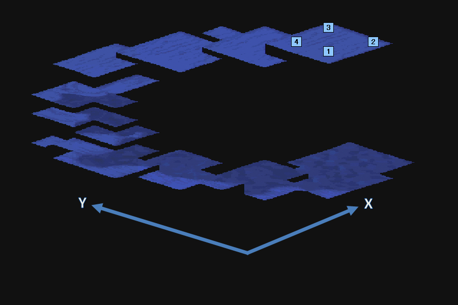 | マップ(階段とアイテムの位置) アイテム位置は数字アイコン/階段は階段アイコンで記している |