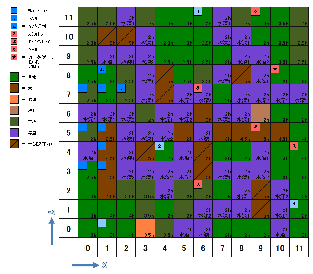 HOME > ファイナルファンタジータクティクス攻略TOP > エリアマップ【CHAPTER2】ツィゴリス湿原(アイテムと敵の配置)
