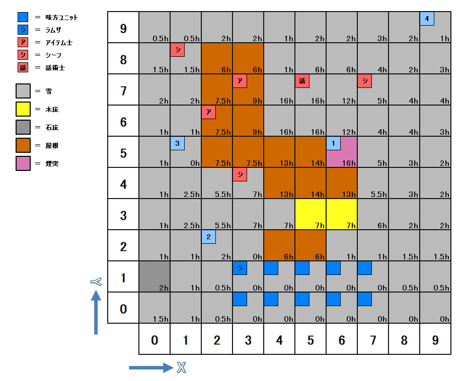 | 座標 | キャラ | パラメータ | 装備 | アビリティ | Wep.Power | AT | C-EV | S-EV | A-EV | ||