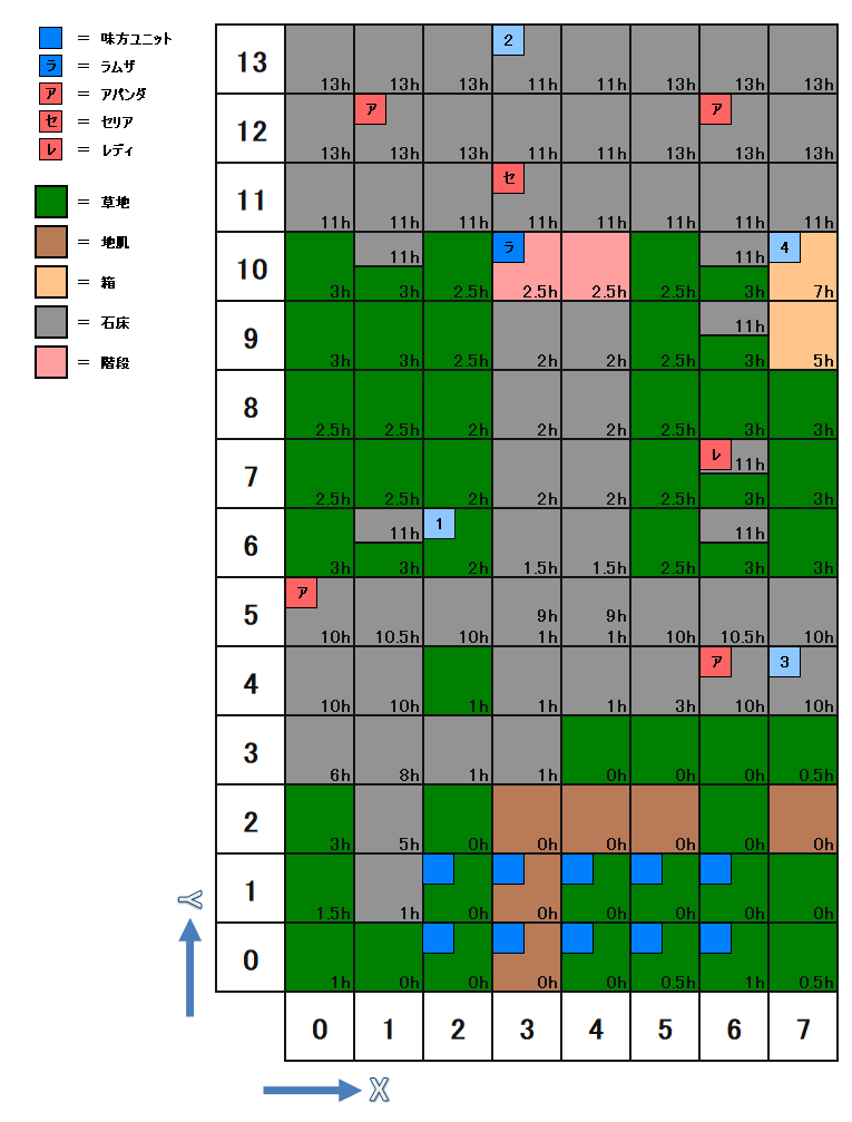 | 座標 | キャラ | パラメータ | 装備 | アビリティ | Wep.Power | AT | C-EV | S-EV | A-EV | ||