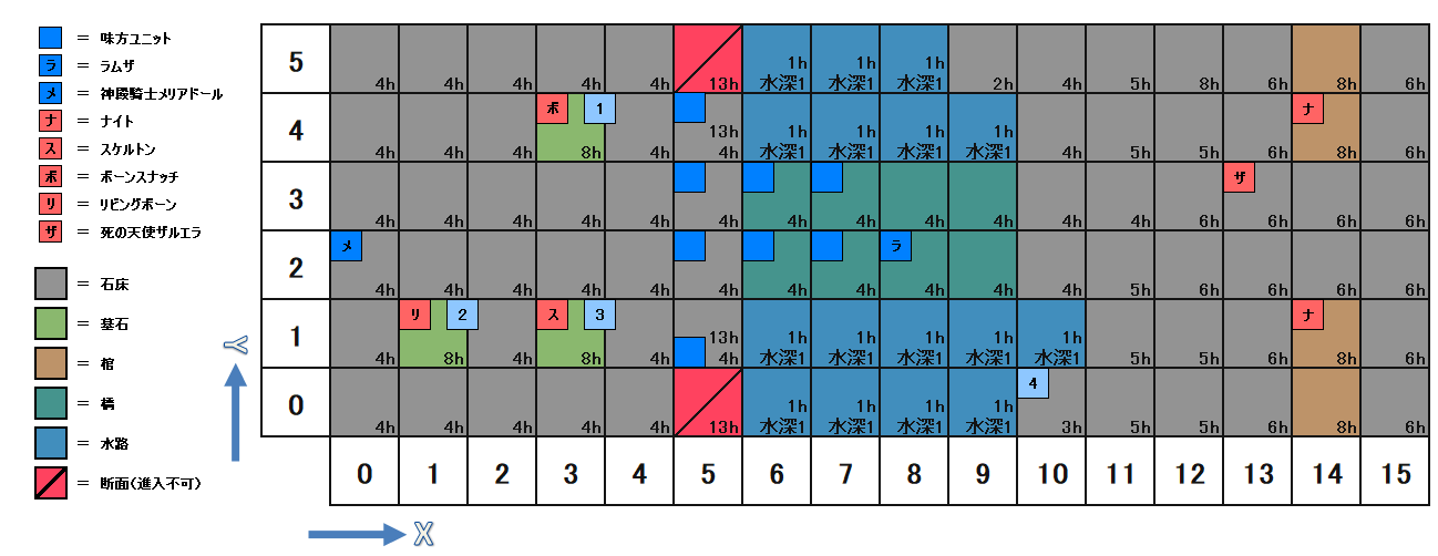 HOME > ファイナルファンタジータクティクス攻略TOP > エリアマップ【CHAPTER4】ランベリー城地下墓地【ランベリー城】(アイテムと敵の配置)