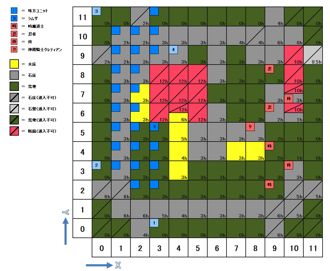 | 座標 | キャラ | パラメータ | 装備 | アビリティ | Wep.Power | AT | C-EV | S-EV | A-EV | ||