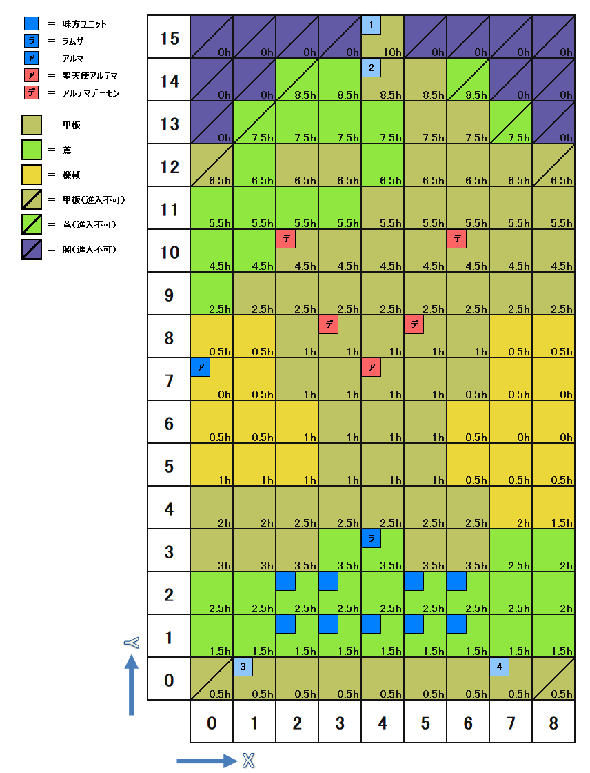 | 座標 | キャラ | パラメータ | 装備 | アビリティ | Wep.Power | AT | C-EV | S-EV | A-EV | ||
