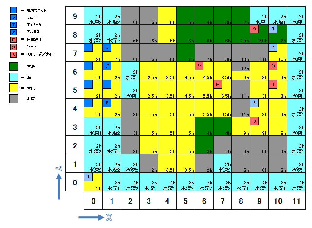 | 座標 | キャラ | パラメータ | 装備 | アビリティ | Wep.Power | AT | C-EV | S-EV | A-EV | ||