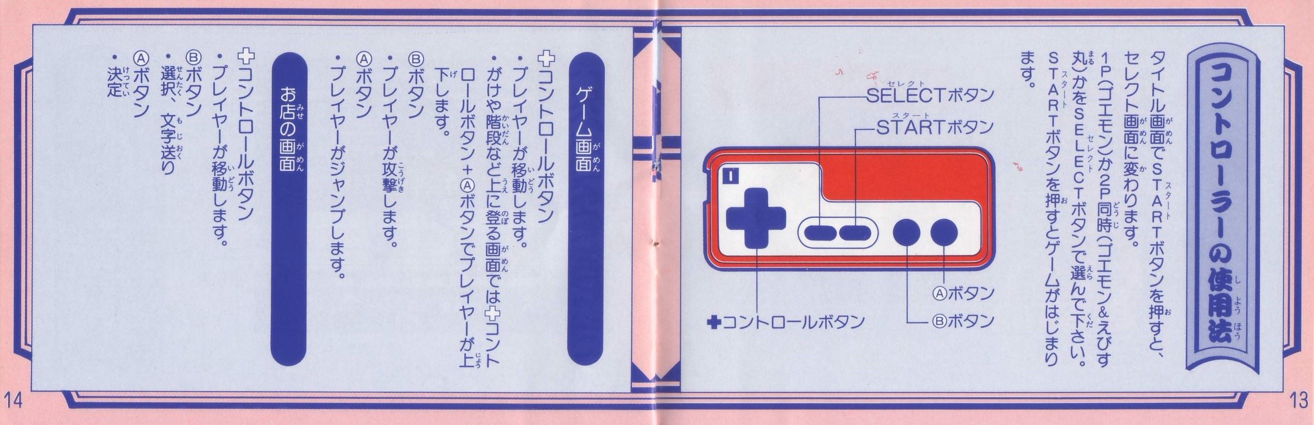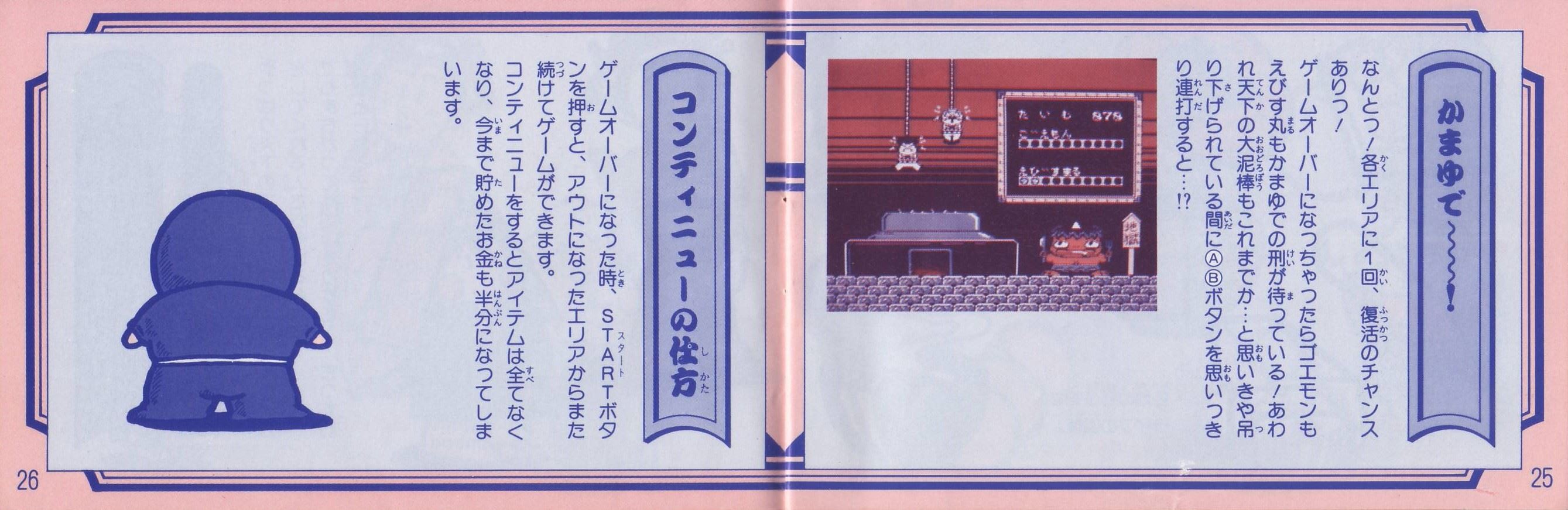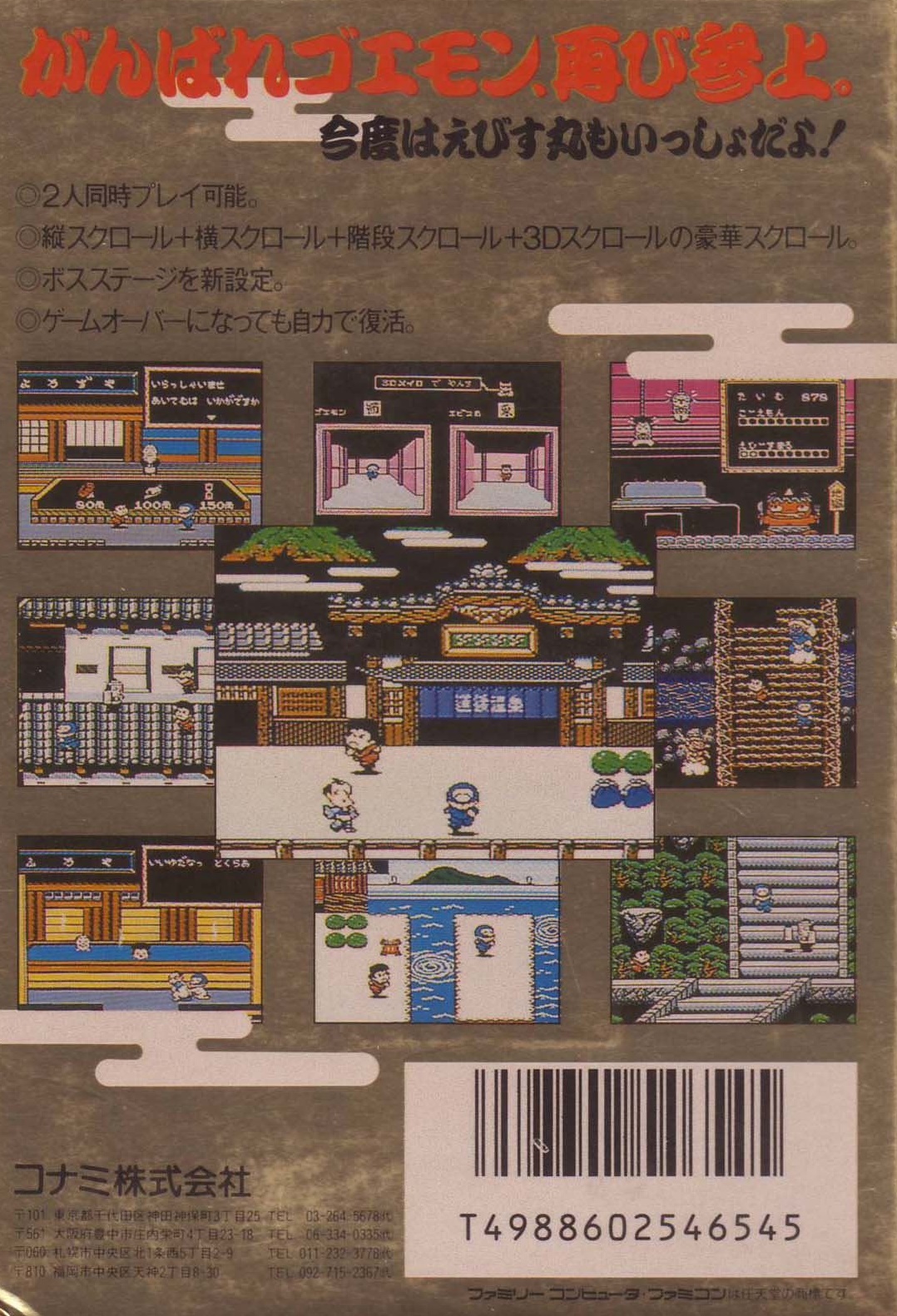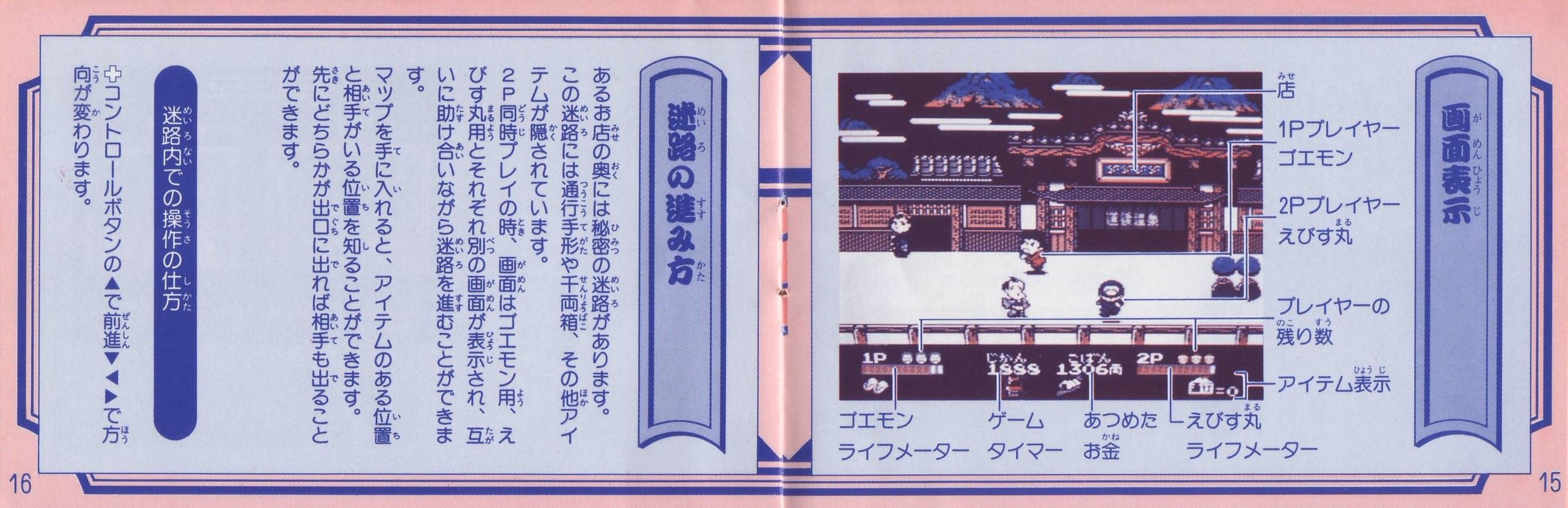 ものがたり弱きを助け、強きをくじく、天下の大泥棒、石川ゴエモンたぁオイラの事でい!世の中のくさった大名たちから小判を盗み、貧しい者に分け与える、そんなオイラも失敗はあらあね。 ちっとばっかり魔がさしたのか、へっぽこ十手持ちに捕まっちまった。ごらんの通り、九州は肥後の国まで送られて牢獄暮らしたぁなさけねえ。 こんなオンボロ牢屋ぬけ出すなんぞ朝飯前。だけどもしばらくはのんびり羽をのばすもよし、と昼寝をきめ込んでたら、大胆にもこのオレ様をたたきおこすヤツがいる。 ナンダナンダと起きてみてこりゃまたオドロイた。ねずみ小僧えびす丸じゃねえか。えびす丸の話を聞いてまたまたオドロイた。 ヤツは『カラクリ城』に隠されている殿様の財宝を盗もうとして捕まっちまったらしい。 『カラクリ城』の財宝と聞いてノンビリ昼寝をしてられるオイラじゃねえ。こんな牢獄ぬけ出して、男ゴエモン一世一代の大仕事。 いっちょやってやろうじゃあねぇか! 定め書き 日本諸国を旅してカラクリ城を探し出し、財宝を手に入れろ! 一、関所を通るには、通行手形を三つ集めるんだ。 二、がまぐちやひょうたんを跳び越えて小判やアイテムを手に入れるんだ。 三、店で品物を買ってパワーアップするんだ。 四、2人同時でプレイができるぞ。ゴエモン(1P)とえびす丸(2P)の2人で力をあわせてがんばれ! カラクリ城をめざせ!またまたはじまるゴエモンの珍道中。からくり城はどこなんだ!?石川ゴエモンやいやいやい! オレ様をだれだと思ってやがるんでい。天下の大泥棒ゴエモン様でい!オレ様のプロフィールとか言うモンを教えてやるから耳の穴かっぽじってよく聞きやがれよっ! 身長:一六九センチ 体重:五九キロ 星座:お羊座 血液型:A型 趣味:金を集めること。 特技:耳からタバコの煙を出す。 性格:かなりエッチなヤツ。でも正義感は人一倍! ねずみ小僧えびす丸あっあんなぁ、わて えびす丸って言いますねん。こんどはじめてゴエモン兄さんとゲームに出させてもらってますねん。あんじょう たのんまっせー! 身長:一六五センチ 体重:七〇キロ 星座:おとめ坐 血液型:AB型 趣味:食う 眠る 遊ぶ 特技:鼻で笛をふける! 性格:めちゃくちゃ明るいヤツ。何を考えてんだか… はっきり言っておまぬけさんだったりする。 2P同時プレイの時どちらかが先にやられてしまっても残りの1人に、プレイヤーの残り数が2人以上あればだいじょうぶ! コントローラーのAボタンでまたまた2P同時プレイだい! 1Pの時プレイヤーの残り数が2人以上あったらAボタンで割り込み2P同時プレイもできちゃうんだ! コントローラーの使用法タイトル画面でSTARTボタンを押すと、セレクト画面に変わります。1P(ゴエモン)か2P同時(ゴエモン&えびす丸)かとをSELECTボタンで選んで下さい。 STARTボタンを押すとゲームがはじまります。 ゲーム画面 コントロールボタン ・プレイヤーが移動します。 ・がけや階段など上に登る画面ではコントロールボタン+Aボタンでプレイヤーが上下します。 Bボタン ・プレイヤーが攻撃します。 Aボタン ・プレイヤーがジャンプします。 お店の画面 コントロールボタン ・プレイヤーが移動します。 Bボタン ・選択、文字送り Aボタン ・決定 画面表示説明書の写真を見てください。迷路の進み方あるお店の奥には秘密の迷路があります。この迷路には通行手形や千両箱、その他アイテムが隠されています。2P同時プレイの時、画面はゴエモン用、えびす丸用とそれぞれ別の画面が表示され、互いに助け合いながら迷路を進むことができます。 マップを手に入れると、アイテムのある位置と相手がいる位置を知ることができます。先にどちらかが出口に出れば相手も出ることができます。 迷路内での操作の仕方 コントロールボタンの↑で前進 ↓←→で方向が変わります。 迷路内でマップを手に入れればAボタンでマップが表示され自分のいる場所がわかるようになります。 アイテムの「これ象君」を持っていれば、道に迷った時もSELECTボタンで出口に出ることができます。 お店の説明途中には色々なお店があり、アイテムを売ってくれたり、ライフを回復してくれたりします。2P同時の場合は、両方のコントローラーで操作できます。店によっては、お金をはらって奥の部屋に行くことができます。 アイテムの説明がまぐち:飛びこえるとお金が出てきます。 まねきねこ:パワーアップします。 おたふく:スピードアップします。 こま:一定時間無敵になります。 うんち:パワーダウンします。 おにぎり:ライフが0になるとライフを補充してくれます。 お守り:カゴ屋よけ。 三度笠:岩やフンなど、おちてくる物から身を守ります。 よろい:バリア。 通行手形:3つ集めると関所を通れます。 ろうそく:隠されている地下迷路の階段が見えます。 砂時計:残り時間が増えます。 やじるし君:迷路で出口の方向を教えてくれます。 これを持っていると出口まで出れるんだ象君:迷路で出口までつれて行ってくれます。 千両箱:お金がふえ