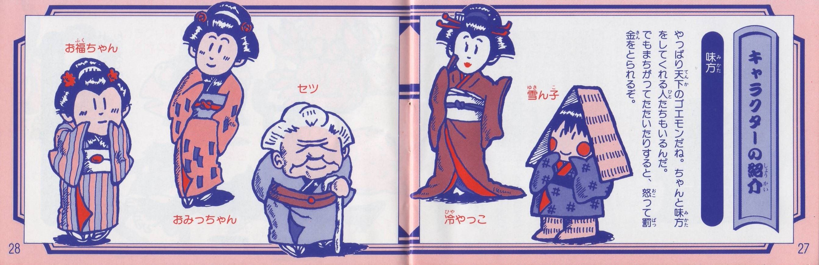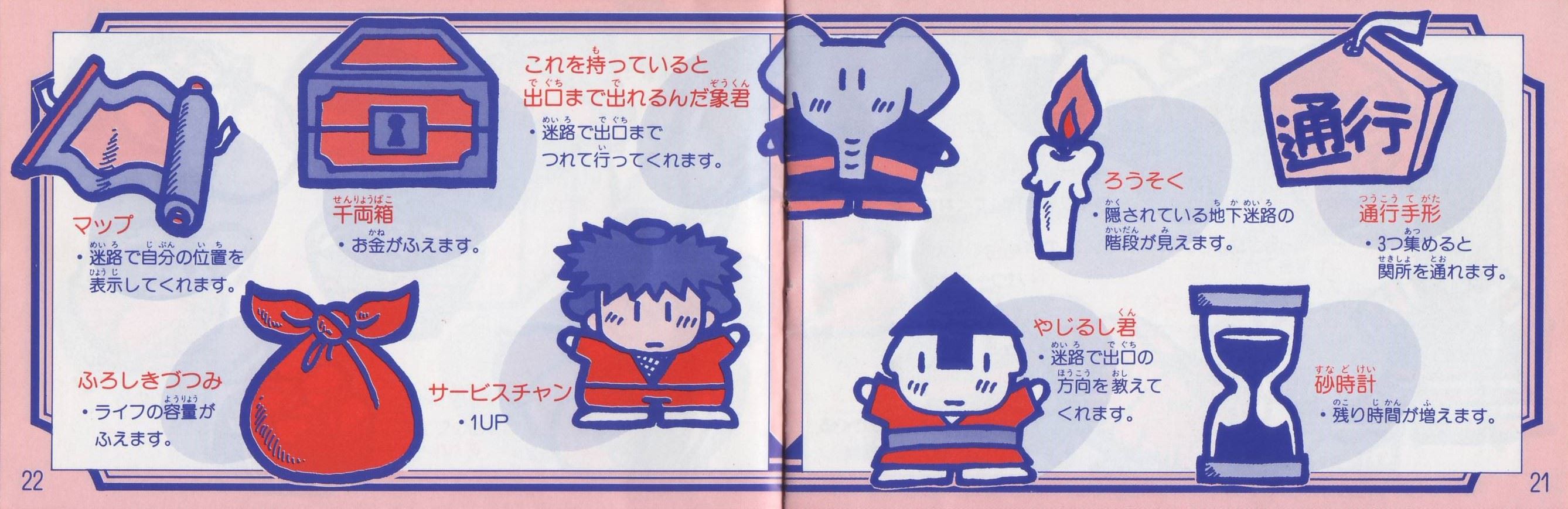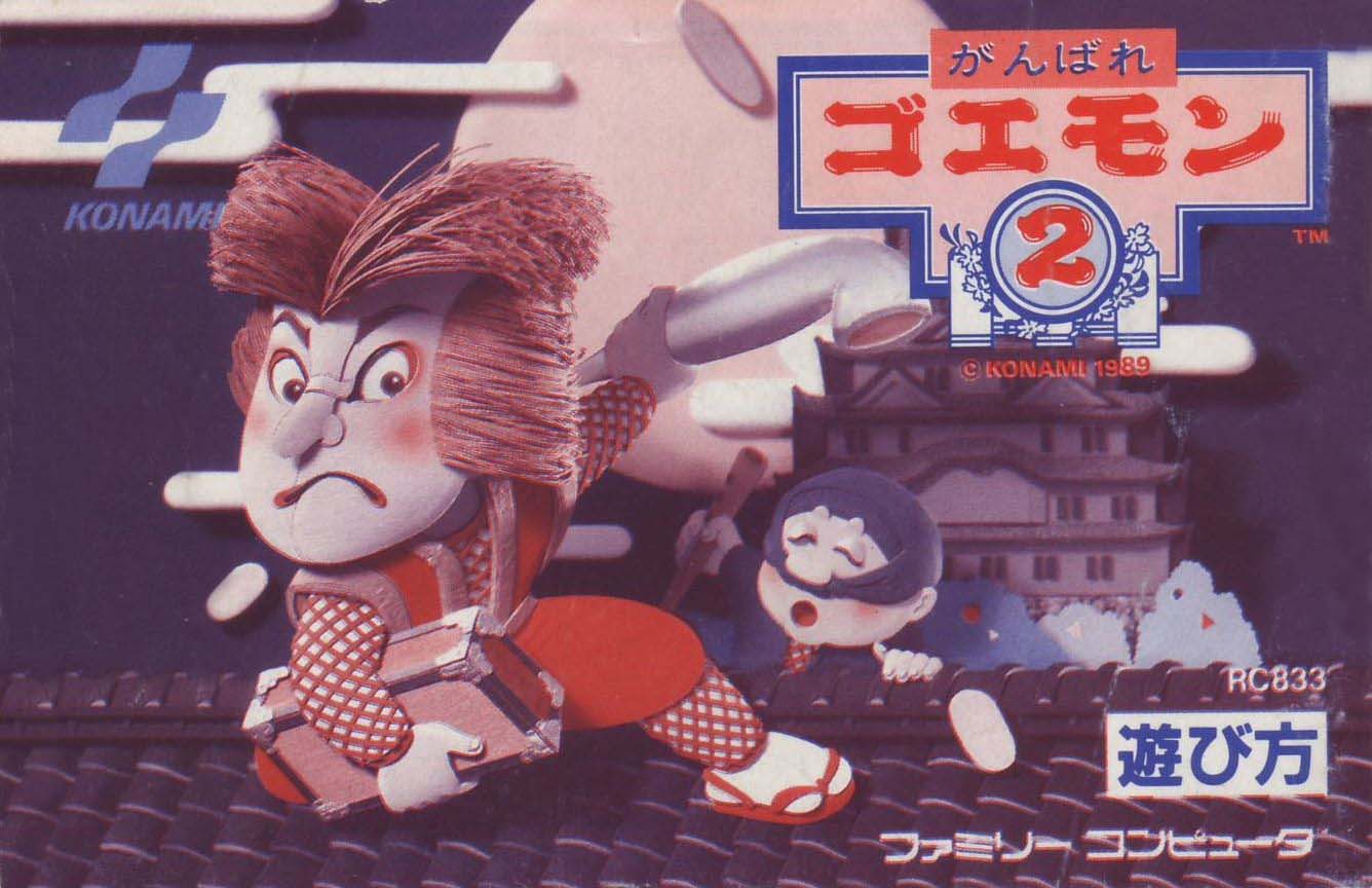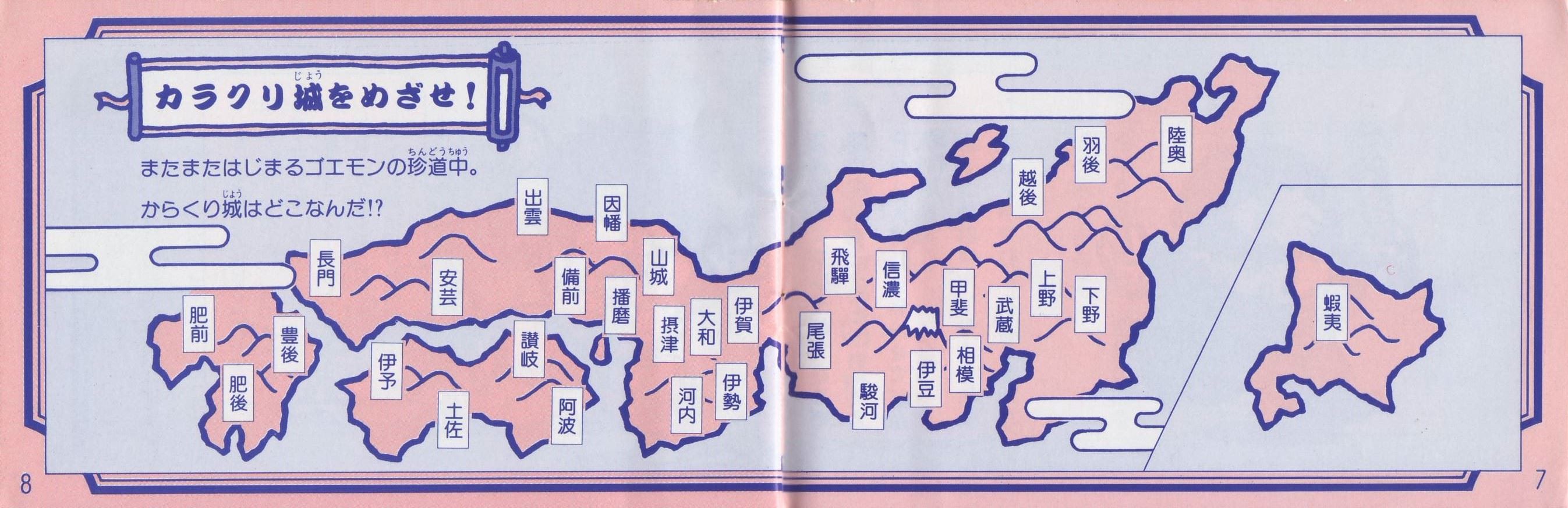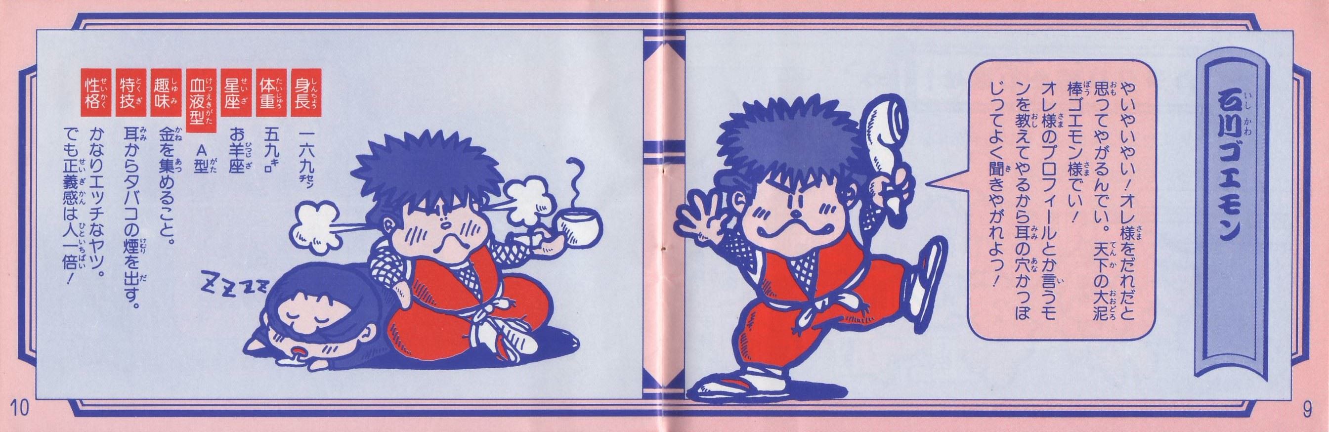ものがたり弱きを助け、強きをくじく、天下の大泥棒、石川ゴエモンたぁオイラの事でい!世の中のくさった大名たちから小判を盗み、貧しい者に分け与える、そんなオイラも失敗はあらあね。 ちっとばっかり魔がさしたのか、へっぽこ十手持ちに捕まっちまった。ごらんの通り、九州は肥後の国まで送られて牢獄暮らしたぁなさけねえ。 こんなオンボロ牢屋ぬけ出すなんぞ朝飯前。だけどもしばらくはのんびり羽をのばすもよし、と昼寝をきめ込んでたら、大胆にもこのオレ様をたたきおこすヤツがいる。 ナンダナンダと起きてみてこりゃまたオドロイた。ねずみ小僧えびす丸じゃねえか。えびす丸の話を聞いてまたまたオドロイた。 ヤツは『カラクリ城』に隠されている殿様の財宝を盗もうとして捕まっちまったらしい。 『カラクリ城』の財宝と聞いてノンビリ昼寝をしてられるオイラじゃねえ。こんな牢獄ぬけ出して、男ゴエモン一世一代の大仕事。 いっちょやってやろうじゃあねぇか! 定め書き 日本諸国を旅してカラクリ城を探し出し、財宝を手に入れろ! 一、関所を通るには、通行手形を三つ集めるんだ。 二、がまぐちやひょうたんを跳び越えて小判やアイテムを手に入れるんだ。 三、店で品物を買ってパワーアップするんだ。 四、2人同時でプレイができるぞ。ゴエモン(1P)とえびす丸(2P)の2人で力をあわせてがんばれ! カラクリ城をめざせ!またまたはじまるゴエモンの珍道中。からくり城はどこなんだ!?石川ゴエモンやいやいやい! オレ様をだれだと思ってやがるんでい。天下の大泥棒ゴエモン様でい!オレ様のプロフィールとか言うモンを教えてやるから耳の穴かっぽじってよく聞きやがれよっ! 身長:一六九センチ 体重:五九キロ 星座:お羊座 血液型:A型 趣味:金を集めること。 特技:耳からタバコの煙を出す。 性格:かなりエッチなヤツ。でも正義感は人一倍! ねずみ小僧えびす丸あっあんなぁ、わて えびす丸って言いますねん。こんどはじめてゴエモン兄さんとゲームに出させてもらってますねん。あんじょう たのんまっせー! 身長:一六五センチ 体重:七〇キロ 星座:おとめ坐 血液型:AB型 趣味:食う 眠る 遊ぶ 特技:鼻で笛をふける! 性格:めちゃくちゃ明るいヤツ。何を考えてんだか… はっきり言っておまぬけさんだったりする。 2P同時プレイの時どちらかが先にやられてしまっても残りの1人に、プレイヤーの残り数が2人以上あればだいじょうぶ! コントローラーのAボタンでまたまた2P同時プレイだい! 1Pの時プレイヤーの残り数が2人以上あったらAボタンで割り込み2P同時プレイもできちゃうんだ! コントローラーの使用法タイトル画面でSTARTボタンを押すと、セレクト画面に変わります。1P(ゴエモン)か2P同時(ゴエモン&えびす丸)かとをSELECTボタンで選んで下さい。 STARTボタンを押すとゲームがはじまります。 ゲーム画面 コントロールボタン ・プレイヤーが移動します。 ・がけや階段など上に登る画面ではコントロールボタン+Aボタンでプレイヤーが上下します。 Bボタン ・プレイヤーが攻撃します。 Aボタン ・プレイヤーがジャンプします。 お店の画面 コントロールボタン ・プレイヤーが移動します。 Bボタン ・選択、文字送り Aボタン ・決定 画面表示説明書の写真を見てください。迷路の進み方あるお店の奥には秘密の迷路があります。この迷路には通行手形や千両箱、その他アイテムが隠されています。2P同時プレイの時、画面はゴエモン用、えびす丸用とそれぞれ別の画面が表示され、互いに助け合いながら迷路を進むことができます。 マップを手に入れると、アイテムのある位置と相手がいる位置を知ることができます。先にどちらかが出口に出れば相手も出ることができます。 迷路内での操作の仕方 コントロールボタンの↑で前進 ↓←→で方向が変わります。 迷路内でマップを手に入れればAボタンでマップが表示され自分のいる場所がわかるようになります。 アイテムの「これ象君」を持っていれば、道に迷った時もSELECTボタンで出口に出ることができます。 お店の説明途中には色々なお店があり、アイテムを売ってくれたり、ライフを回復してくれたりします。2P同時の場合は、両方のコントローラーで操作できます。店によっては、お金をはらって奥の部屋に行くことができます。 アイテムの説明がまぐち:飛びこえるとお金が出てきます。 まねきねこ:パワーアップします。 おたふく:スピードアップします。 こま:一定時間無敵になります。 うんち:パワーダウンします。 おにぎり:ライフが0になるとライフを補充してくれます。 お守り:カゴ屋よけ。 三度笠:岩やフンなど、おちてくる物から身を守ります。 よろい:バリア。 通行手形:3つ集めると関所を通れます。 ろうそく:隠されている地下迷路の階段が見えます。 砂時計:残り時間が増えます。 やじるし君:迷路で出口の方向を教えてくれます。 これを持っていると出口まで出れるんだ象君:迷路で出口までつれて行ってくれます。 千両箱:お金がふえ