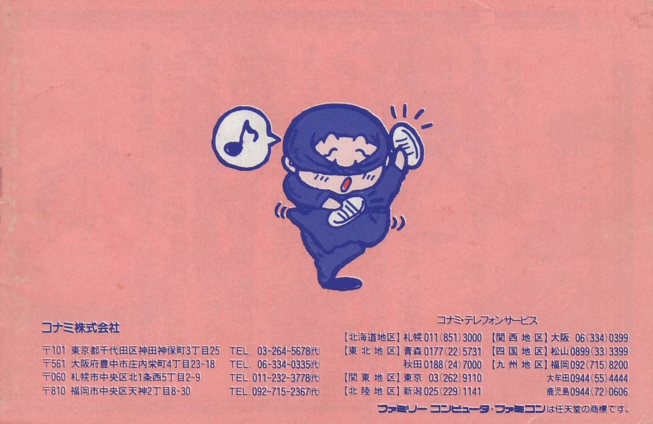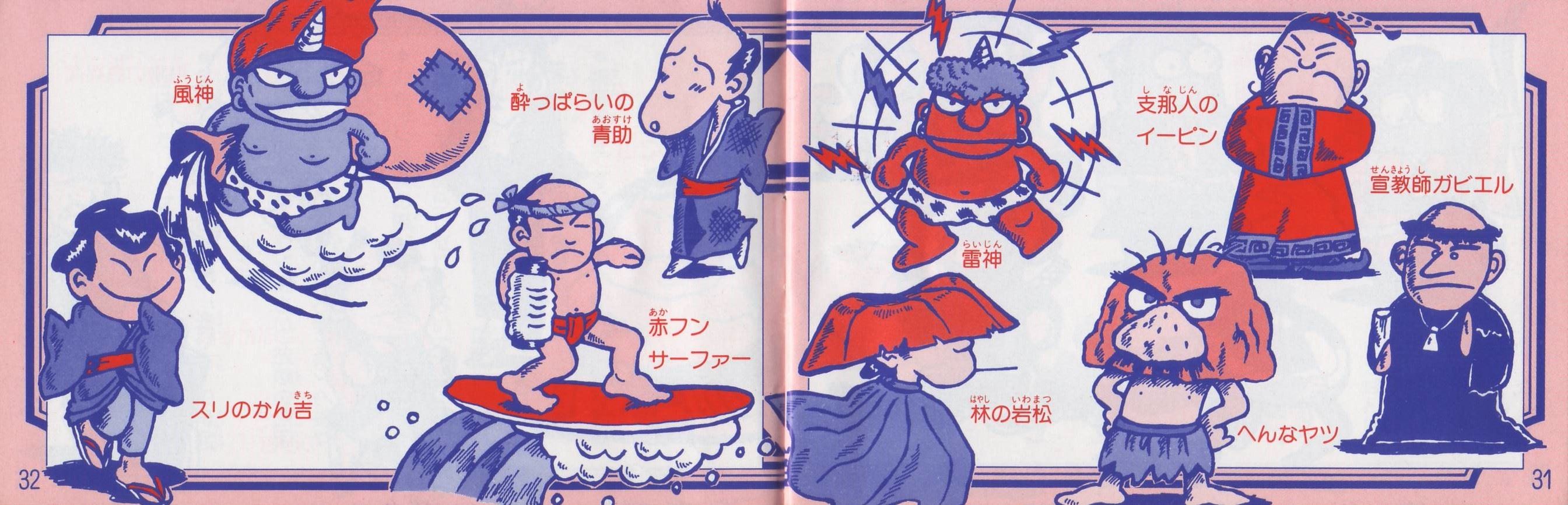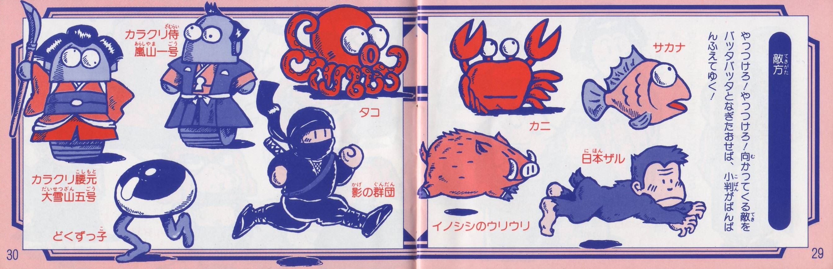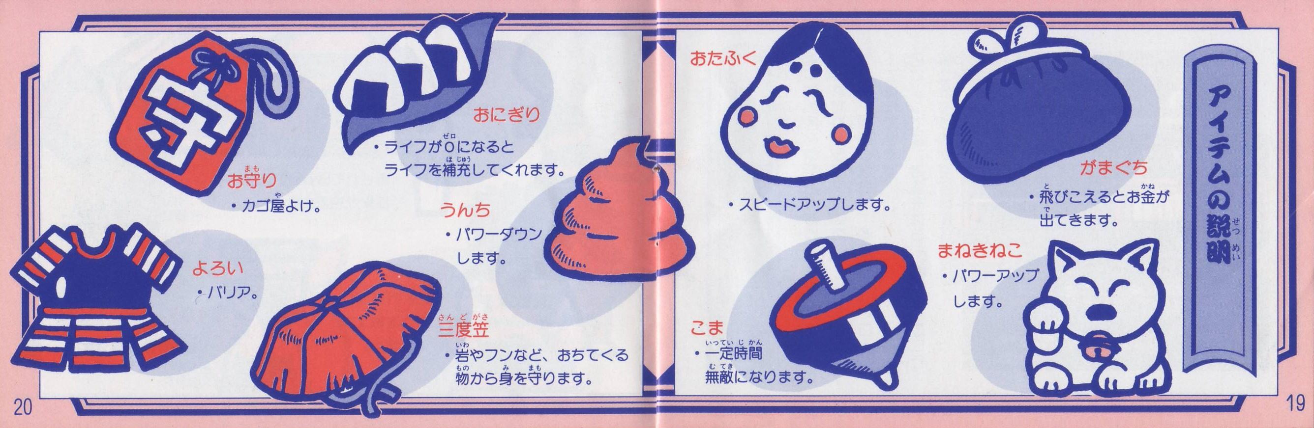 ものがたり弱きを助け、強きをくじく、天下の大泥棒、石川ゴエモンたぁオイラの事でい!世の中のくさった大名たちから小判を盗み、貧しい者に分け与える、そんなオイラも失敗はあらあね。 ちっとばっかり魔がさしたのか、へっぽこ十手持ちに捕まっちまった。ごらんの通り、九州は肥後の国まで送られて牢獄暮らしたぁなさけねえ。 こんなオンボロ牢屋ぬけ出すなんぞ朝飯前。だけどもしばらくはのんびり羽をのばすもよし、と昼寝をきめ込んでたら、大胆にもこのオレ様をたたきおこすヤツがいる。 ナンダナンダと起きてみてこりゃまたオドロイた。ねずみ小僧えびす丸じゃねえか。えびす丸の話を聞いてまたまたオドロイた。 ヤツは『カラクリ城』に隠されている殿様の財宝を盗もうとして捕まっちまったらしい。 『カラクリ城』の財宝と聞いてノンビリ昼寝をしてられるオイラじゃねえ。こんな牢獄ぬけ出して、男ゴエモン一世一代の大仕事。 いっちょやってやろうじゃあねぇか! 定め書き 日本諸国を旅してカラクリ城を探し出し、財宝を手に入れろ! 一、関所を通るには、通行手形を三つ集めるんだ。 二、がまぐちやひょうたんを跳び越えて小判やアイテムを手に入れるんだ。 三、店で品物を買ってパワーアップするんだ。 四、2人同時でプレイができるぞ。ゴエモン(1P)とえびす丸(2P)の2人で力をあわせてがんばれ! カラクリ城をめざせ!またまたはじまるゴエモンの珍道中。からくり城はどこなんだ!?石川ゴエモンやいやいやい! オレ様をだれだと思ってやがるんでい。天下の大泥棒ゴエモン様でい!オレ様のプロフィールとか言うモンを教えてやるから耳の穴かっぽじってよく聞きやがれよっ! 身長:一六九センチ 体重:五九キロ 星座:お羊座 血液型:A型 趣味:金を集めること。 特技:耳からタバコの煙を出す。 性格:かなりエッチなヤツ。でも正義感は人一倍! ねずみ小僧えびす丸あっあんなぁ、わて えびす丸って言いますねん。こんどはじめてゴエモン兄さんとゲームに出させてもらってますねん。あんじょう たのんまっせー! 身長:一六五センチ 体重:七〇キロ 星座:おとめ坐 血液型:AB型 趣味:食う 眠る 遊ぶ 特技:鼻で笛をふける! 性格:めちゃくちゃ明るいヤツ。何を考えてんだか… はっきり言っておまぬけさんだったりする。 2P同時プレイの時どちらかが先にやられてしまっても残りの1人に、プレイヤーの残り数が2人以上あればだいじょうぶ! コントローラーのAボタンでまたまた2P同時プレイだい! 1Pの時プレイヤーの残り数が2人以上あったらAボタンで割り込み2P同時プレイもできちゃうんだ! コントローラーの使用法タイトル画面でSTARTボタンを押すと、セレクト画面に変わります。1P(ゴエモン)か2P同時(ゴエモン&えびす丸)かとをSELECTボタンで選んで下さい。 STARTボタンを押すとゲームがはじまります。 ゲーム画面 コントロールボタン ・プレイヤーが移動します。 ・がけや階段など上に登る画面ではコントロールボタン+Aボタンでプレイヤーが上下します。 Bボタン ・プレイヤーが攻撃します。 Aボタン ・プレイヤーがジャンプします。 お店の画面 コントロールボタン ・プレイヤーが移動します。 Bボタン ・選択、文字送り Aボタン ・決定 画面表示説明書の写真を見てください。迷路の進み方あるお店の奥には秘密の迷路があります。この迷路には通行手形や千両箱、その他アイテムが隠されています。2P同時プレイの時、画面はゴエモン用、えびす丸用とそれぞれ別の画面が表示され、互いに助け合いながら迷路を進むことができます。 マップを手に入れると、アイテムのある位置と相手がいる位置を知ることができます。先にどちらかが出口に出れば相手も出ることができます。 迷路内での操作の仕方 コントロールボタンの↑で前進 ↓←→で方向が変わります。 迷路内でマップを手に入れればAボタンでマップが表示され自分のいる場所がわかるようになります。 アイテムの「これ象君」を持っていれば、道に迷った時もSELECTボタンで出口に出ることができます。 お店の説明途中には色々なお店があり、アイテムを売ってくれたり、ライフを回復してくれたりします。2P同時の場合は、両方のコントローラーで操作できます。店によっては、お金をはらって奥の部屋に行くことができます。 アイテムの説明がまぐち:飛びこえるとお金が出てきます。 まねきねこ:パワーアップします。 おたふく:スピードアップします。 こま:一定時間無敵になります。 うんち:パワーダウンします。 おにぎり:ライフが0になるとライフを補充してくれます。 お守り:カゴ屋よけ。 三度笠:岩やフンなど、おちてくる物から身を守ります。 よろい:バリア。 通行手形:3つ集めると関所を通れます。 ろうそく:隠されている地下迷路の階段が見えます。 砂時計:残り時間が増えます。 やじるし君:迷路で出口の方向を教えてくれます。 これを持っていると出口まで出れるんだ象君:迷路で出口までつれて行ってくれます。 千両箱:お金がふえ