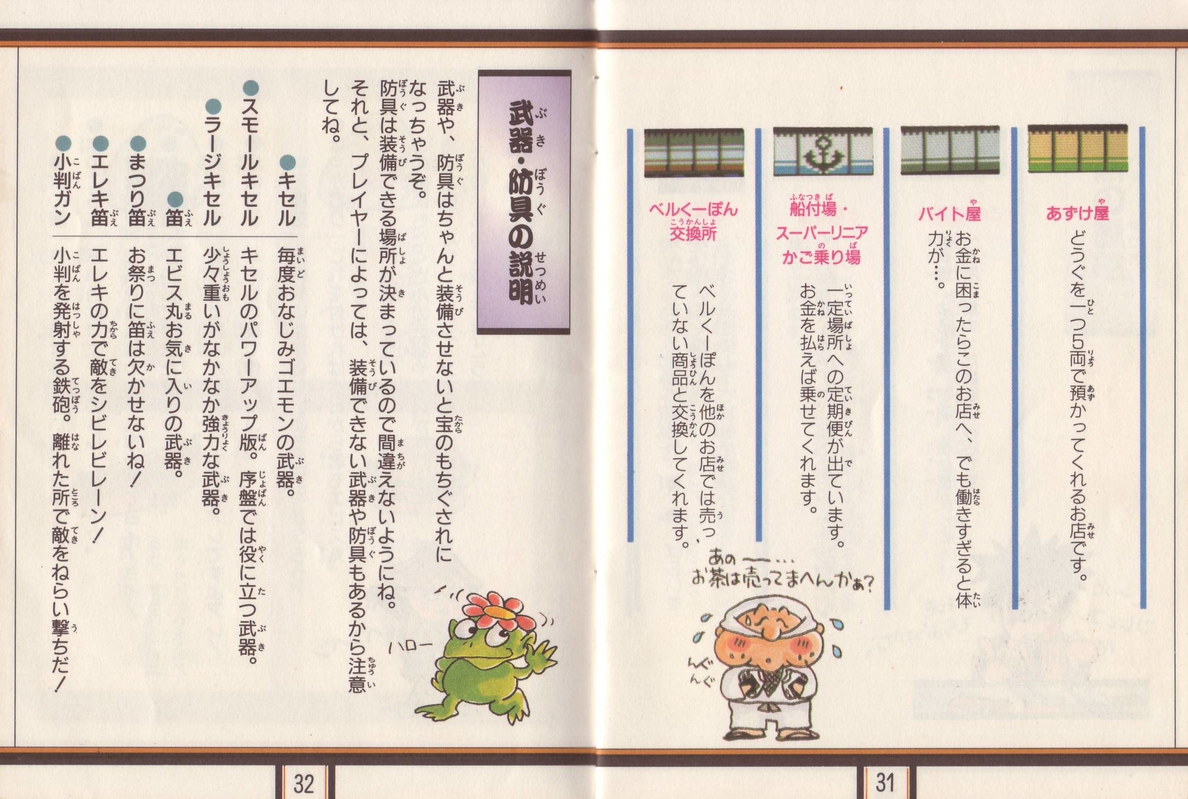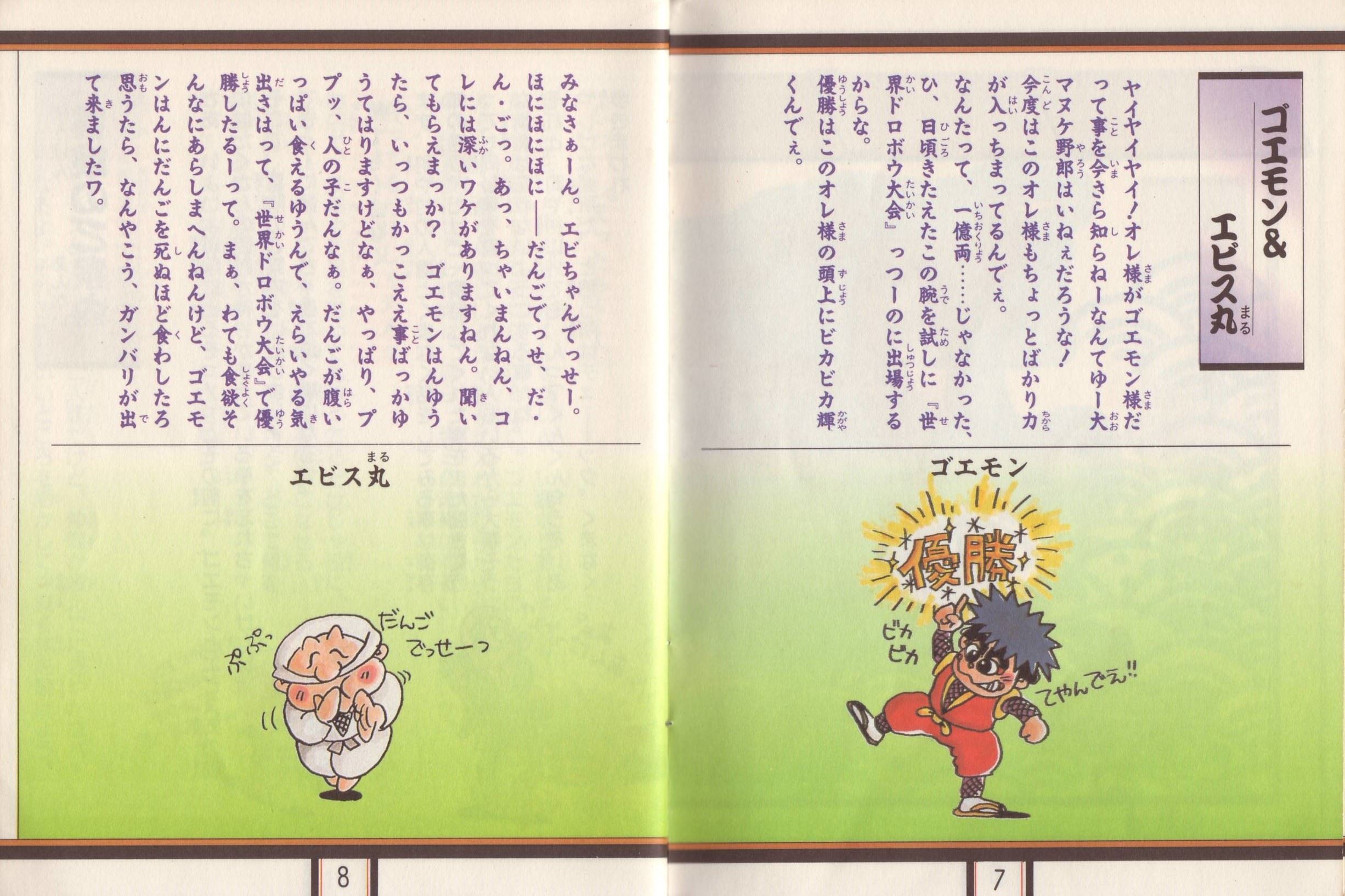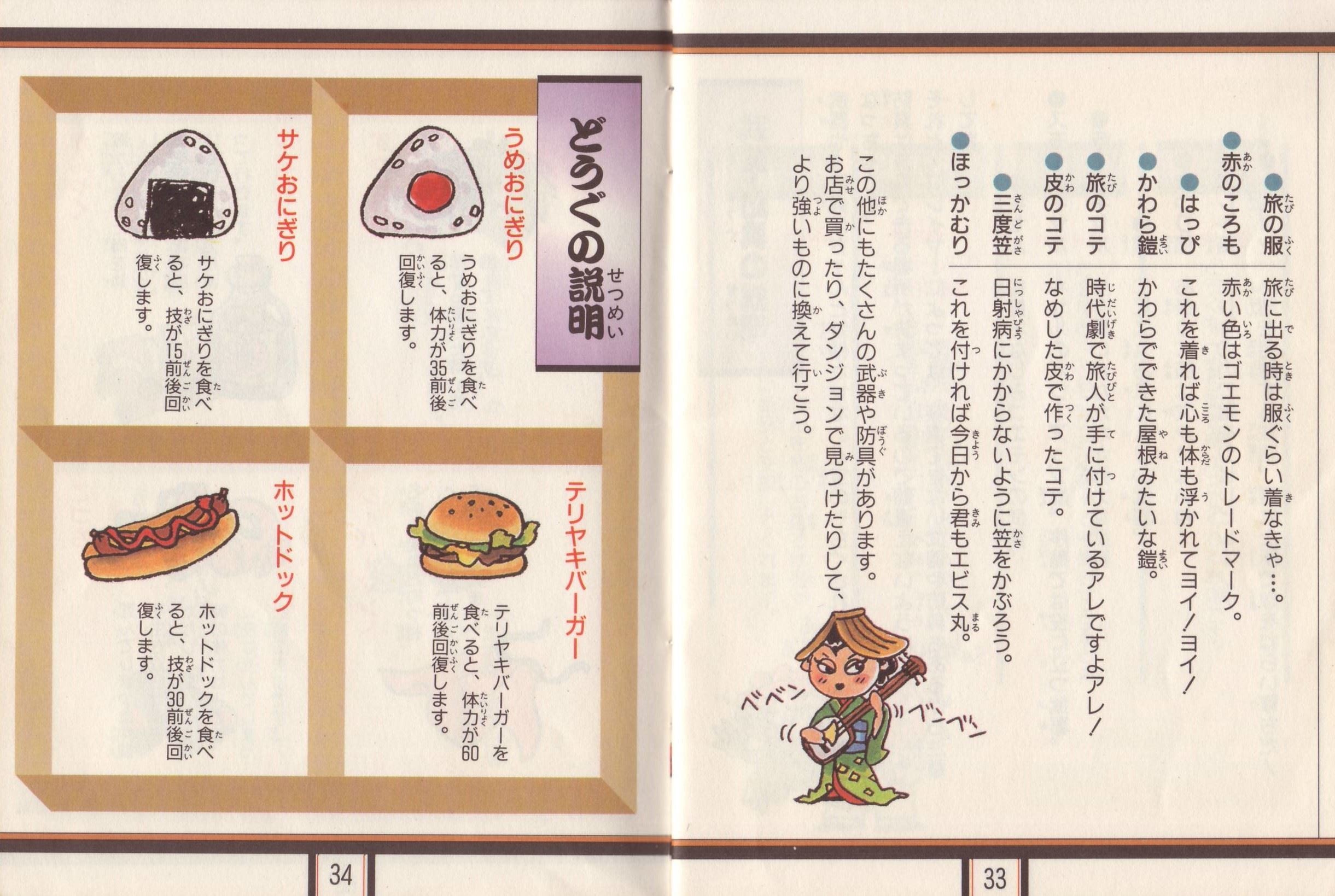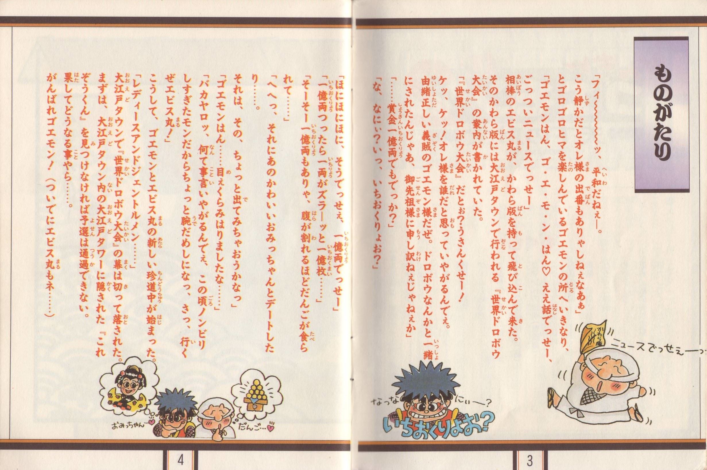 ものがたり「フィーーーーーーッ、平和だねぇー。こう静かだとオレ様の出番もありゃしねぇなあぁ」とゴロゴロヒマを楽しんでいるゴエモンの所へいきなり、 「ゴエモンはん、ゴ・エ・モ・ン・はん♡ ええ話でっせー、ごっついニュースでっせー」 相棒のエビス丸が、かわら版を持って飛び込んで来た。 そのかわら版には大江戸タウンで行われる『世界ドロボウ大会』の案内が書かれていた。 「『世界ドロボウ大会』だとぉ?うさんくせー! ケッ、ケッ! オレ様を誰だと思っていやがるんでぇ。 由緒正しい義賊のゴエモン様だぜ。ドロボウなんかと一緒にされたんじゃあ、御先祖様に申し訳ねぇじゃねぇか」 「……賞金一億両でもでっか?」 「な、なにぃ?いっ、いちおくりょお?」 「ほにほにほに、そうでっせぇ、一億両でっせー」 「一億両つったら一両がズラーッと一億枚……」 「そーそー 一億両もありゃ、腹が割れるほどだんごが食べられて……」 「へへっ、それにあのかわいいおみっちゃんとデートしたり……。」 「それは、その、ちょっと出てみちゃおうかなっ」 「ゴエモンはん……目ぇくらみはりましたな……」 「バカヤロッ、何て事言いやがるんでぇ、この頃ノンビリしすぎたモンだからちょっと腕だめしになっ、さっ、行くぜエビス丸!」 こうして、ゴエモンとエビス丸の新しい珍道中が始まった。 「レディースアンドジェントルメン……」 大江戸タウンで『世界ドロボウ大会』の幕は切って落された。 まずは、大江戸タウン内の大江戸タワーに隠された「これぞうくん」を見つけなければ予選は通過できない。 果たしてどうなる事やら……。 がんばれゴエモン!(ついでにエビス丸もネ……) べりーべんりー地図説明書の写真をご確認ください。ゴエモン&エビス丸ヤイヤイヤイ! オレ様がゴエモン様だって事を今さら知らねーなんてゆー大マヌケ野郎はいねぇだろうな!今度はこのオレ様もちょっとばかり力が入っちまってるんでぇ。 なんたって、一億両……じゃなかった、ひ、日頃きたえたこの腕を試しに『世界ドロボウ大会』っつーのに出場するからな。 優勝はこのオレ様の頭上にビカビカ輝くんでぇ。 みなさぁーん。エビちゃんでっせー。ほにほにほにーだんごでっせ、だ・ん・ごっ。 あっ、ちゃいまんねん、コレには深いワケがありますねん。聞いてもらえまっか? ゴエモンはんゆうたら、いっつもかっこええ事ばっかゆうてはりますけどなぁ、やっぱり、ププッ、人の子だんなぁ。 だんごが腹いっぱい食えるゆうんで、えらいやる気出さはって、『世界ドロボウ大会』で優勝したるーって。 まぁ、わても食欲そんなにあらしまへんねんけど、ゴエモンはんにだんごを死ぬほど食わしたろ思うたら、なんやこう、ガンバリが出て来ましたワ。 冒険のご案内さあ、いよいよ冒険に出るぞっ! っとその前に。ゴエモンとエビス丸の前にはたくさんの困難が待ちかまえている事を忘れちゃいけない。そこで、冒険のご案内をいたしましょう。てきとーに読んでちゃ後で泣く事になるぜ。 何でもくまなく まず、町や村の人達とくまなく話をしてみる事は御存知の通り、だけど一度話してくれた事をまた聞きに行っても同じ事を言ってくれない人もいるから大事そうな情報は忘れないようにする事だね。 それと、町や村以外でも、んっ? くんくん匂うぞ、あやしげな場所だ、と思う所はチェック。くまなく歩きまわれ。 しっ、しまったぁーー。 ほらほら、ちゃんときろくしてないと、いきなり敵にやられちゃったら目も当てられないじゃない。 ゴエモンたちのレベルが上がったり、新しいどうぐを手に入れたりしたら必ずきろく! まっ、習慣にしてしまえば、ほら、キミの未来は明るいじゃないか。 持ってるだけじゃダメッ お店で、武器や防具を買っても持ってるだけじゃ役に立たない。ちゃんとその武器や防具を使いこなせる人が装備してはじめて役に立つ。 それから、どこに何を装備するかも必要だぞ。ガッチガチに装備を固めて、いざ出陣! 仲間と協力して行こう! 初めはゴエモンとエビス丸の二人旅だけど、仲間が増えてにぎやかなパーティーになるよ。 それぞれのいいところを活かして仲良く旅を続けよう。 ゲームの始め方タイトル画面でSELECTボタンか、十字ボタン上下で「はじめる」「つづける」が選べます。はじめる 最初からゲームを始める時は、「はじめる」を選び、STARTボタンかAボタンを押すと名前入力画面に変わります。 十字ボタンで文字を選び、Aボタンで決定します。十字ボタン左右で画面が切り替り、カタカナ入力画面になります。 入力し終わったら、「おわり」にあわせてAボタンを押すとデモが始まります。 つづける ゲームの途中できろくしている場合、その続きからゲームをはじめることが出来ます。 「つづける」を選んでSTARTボタン又はAボタンを押すと、「たびにっき」の選択画面に変わります。 続きをしたいたびにっきを十字ボタンで選んでAボタンでゲームスタートです