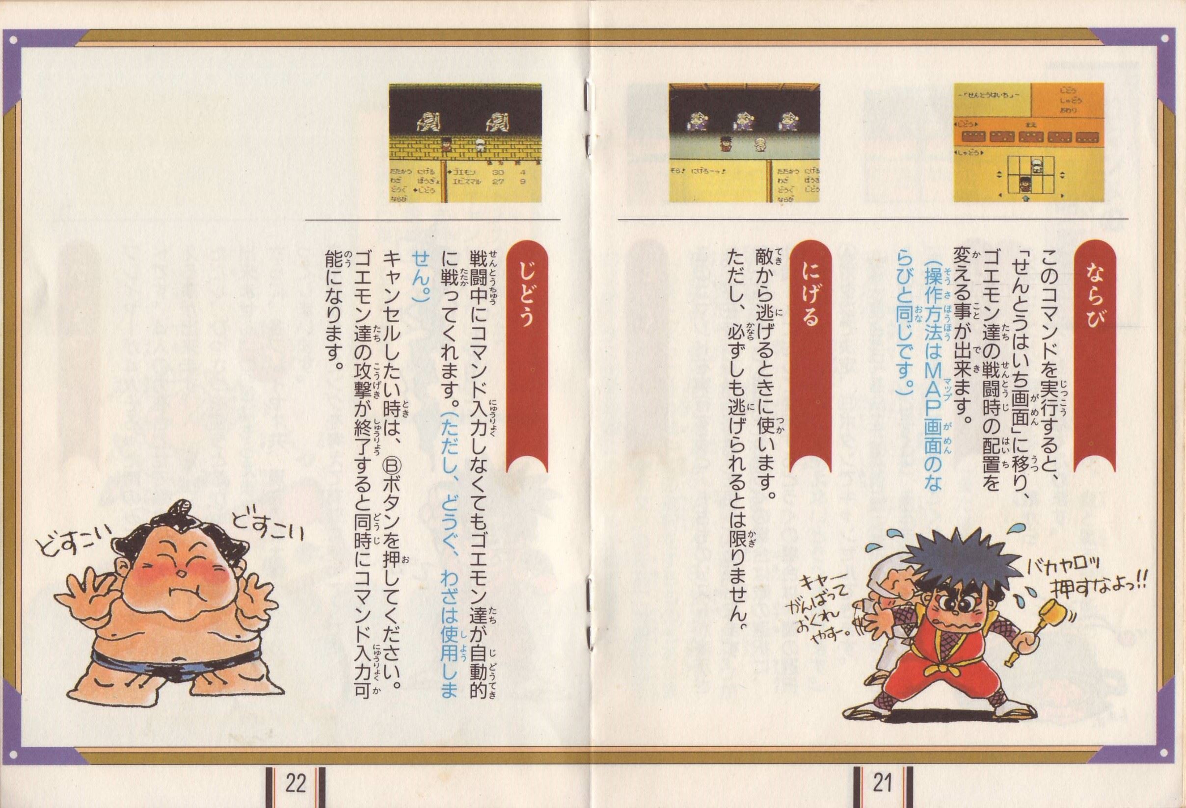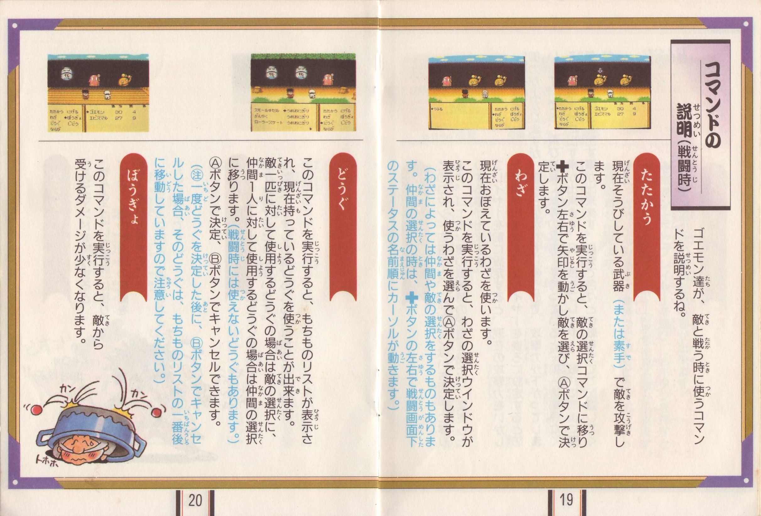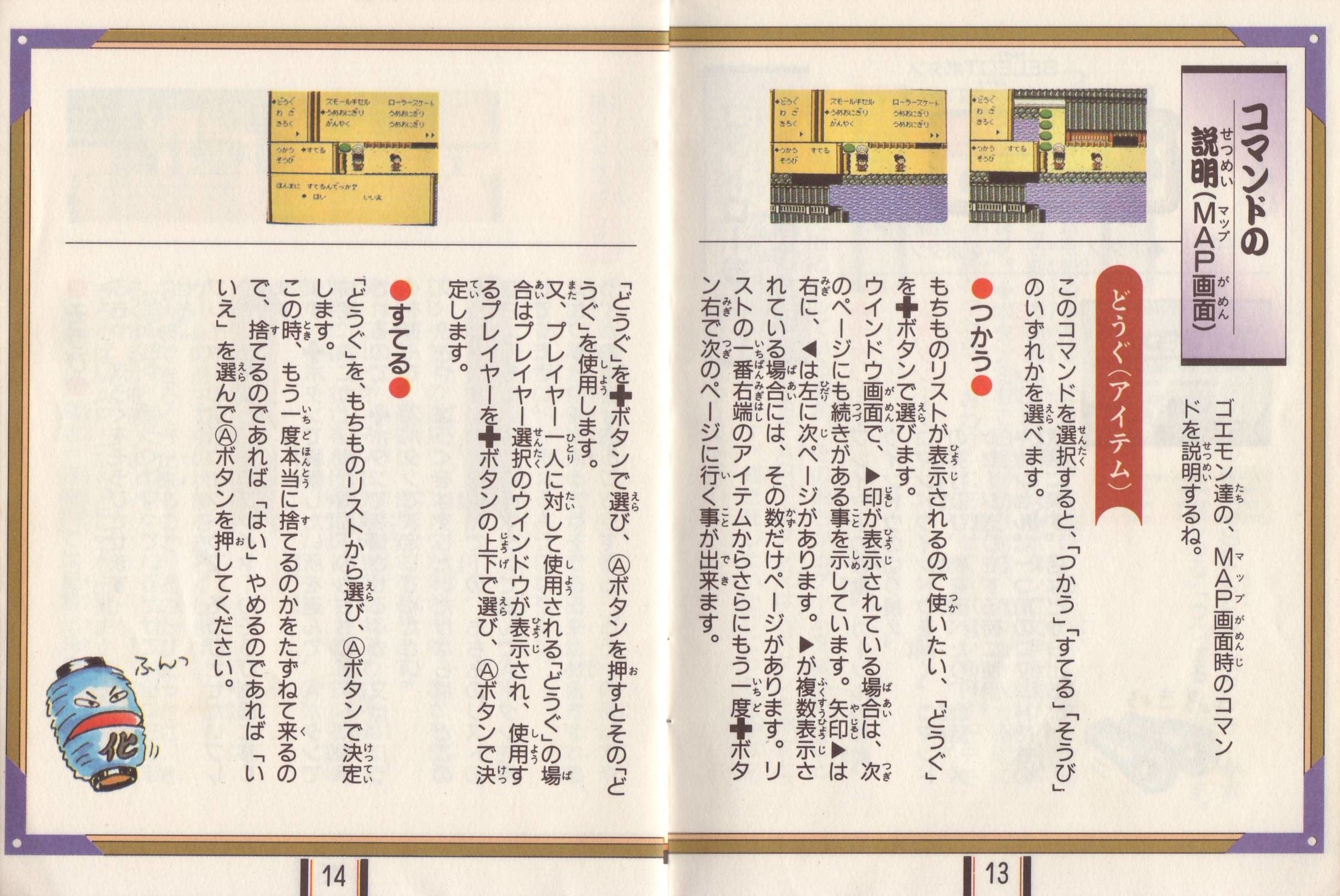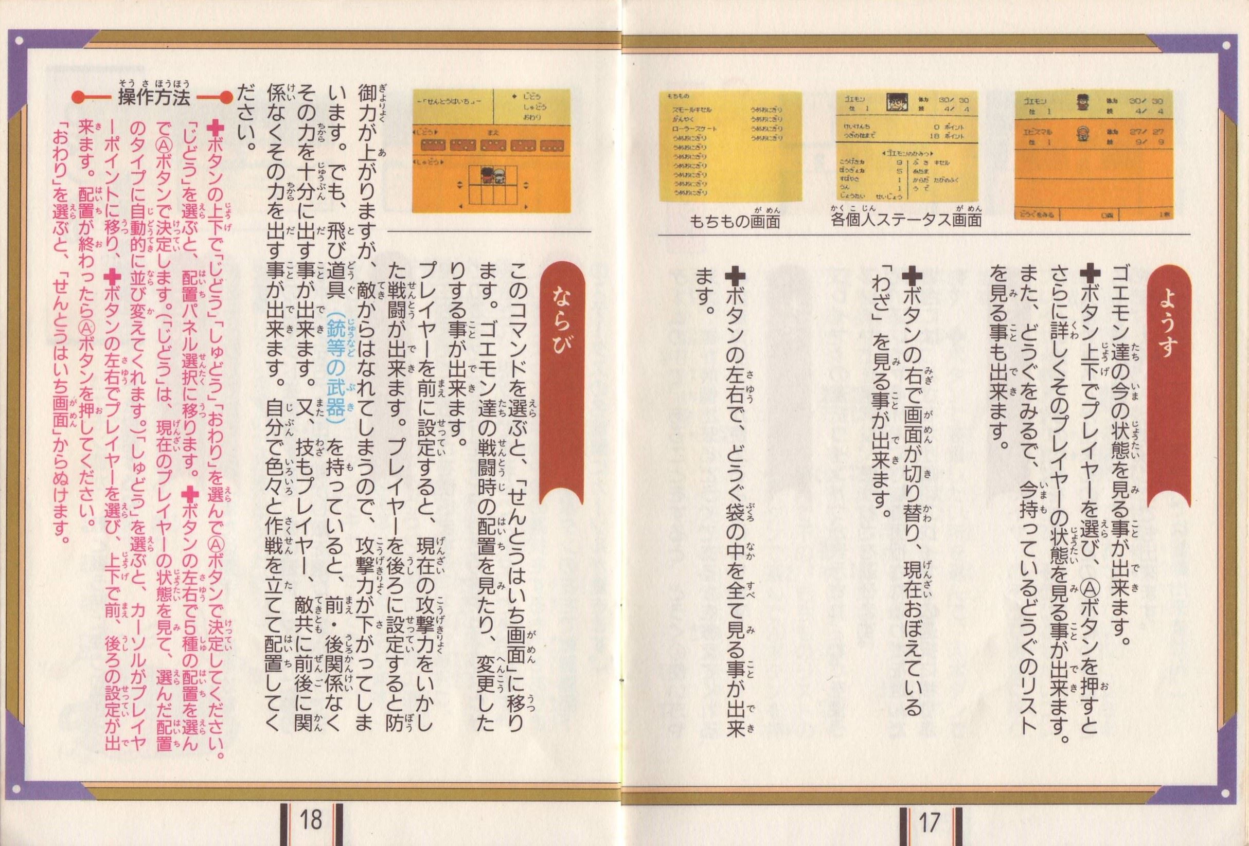 ものがたり「フィーーーーーーッ、平和だねぇー。こう静かだとオレ様の出番もありゃしねぇなあぁ」とゴロゴロヒマを楽しんでいるゴエモンの所へいきなり、 「ゴエモンはん、ゴ・エ・モ・ン・はん♡ ええ話でっせー、ごっついニュースでっせー」 相棒のエビス丸が、かわら版を持って飛び込んで来た。 そのかわら版には大江戸タウンで行われる『世界ドロボウ大会』の案内が書かれていた。 「『世界ドロボウ大会』だとぉ?うさんくせー! ケッ、ケッ! オレ様を誰だと思っていやがるんでぇ。 由緒正しい義賊のゴエモン様だぜ。ドロボウなんかと一緒にされたんじゃあ、御先祖様に申し訳ねぇじゃねぇか」 「……賞金一億両でもでっか?」 「な、なにぃ?いっ、いちおくりょお?」 「ほにほにほに、そうでっせぇ、一億両でっせー」 「一億両つったら一両がズラーッと一億枚……」 「そーそー 一億両もありゃ、腹が割れるほどだんごが食べられて……」 「へへっ、それにあのかわいいおみっちゃんとデートしたり……。」 「それは、その、ちょっと出てみちゃおうかなっ」 「ゴエモンはん……目ぇくらみはりましたな……」 「バカヤロッ、何て事言いやがるんでぇ、この頃ノンビリしすぎたモンだからちょっと腕だめしになっ、さっ、行くぜエビス丸!」 こうして、ゴエモンとエビス丸の新しい珍道中が始まった。 「レディースアンドジェントルメン……」 大江戸タウンで『世界ドロボウ大会』の幕は切って落された。 まずは、大江戸タウン内の大江戸タワーに隠された「これぞうくん」を見つけなければ予選は通過できない。 果たしてどうなる事やら……。 がんばれゴエモン!(ついでにエビス丸もネ……) べりーべんりー地図説明書の写真をご確認ください。ゴエモン&エビス丸ヤイヤイヤイ! オレ様がゴエモン様だって事を今さら知らねーなんてゆー大マヌケ野郎はいねぇだろうな!今度はこのオレ様もちょっとばかり力が入っちまってるんでぇ。 なんたって、一億両……じゃなかった、ひ、日頃きたえたこの腕を試しに『世界ドロボウ大会』っつーのに出場するからな。 優勝はこのオレ様の頭上にビカビカ輝くんでぇ。 みなさぁーん。エビちゃんでっせー。ほにほにほにーだんごでっせ、だ・ん・ごっ。 あっ、ちゃいまんねん、コレには深いワケがありますねん。聞いてもらえまっか? ゴエモンはんゆうたら、いっつもかっこええ事ばっかゆうてはりますけどなぁ、やっぱり、ププッ、人の子だんなぁ。 だんごが腹いっぱい食えるゆうんで、えらいやる気出さはって、『世界ドロボウ大会』で優勝したるーって。 まぁ、わても食欲そんなにあらしまへんねんけど、ゴエモンはんにだんごを死ぬほど食わしたろ思うたら、なんやこう、ガンバリが出て来ましたワ。 冒険のご案内さあ、いよいよ冒険に出るぞっ! っとその前に。ゴエモンとエビス丸の前にはたくさんの困難が待ちかまえている事を忘れちゃいけない。そこで、冒険のご案内をいたしましょう。てきとーに読んでちゃ後で泣く事になるぜ。 何でもくまなく まず、町や村の人達とくまなく話をしてみる事は御存知の通り、だけど一度話してくれた事をまた聞きに行っても同じ事を言ってくれない人もいるから大事そうな情報は忘れないようにする事だね。 それと、町や村以外でも、んっ? くんくん匂うぞ、あやしげな場所だ、と思う所はチェック。くまなく歩きまわれ。 しっ、しまったぁーー。 ほらほら、ちゃんときろくしてないと、いきなり敵にやられちゃったら目も当てられないじゃない。 ゴエモンたちのレベルが上がったり、新しいどうぐを手に入れたりしたら必ずきろく! まっ、習慣にしてしまえば、ほら、キミの未来は明るいじゃないか。 持ってるだけじゃダメッ お店で、武器や防具を買っても持ってるだけじゃ役に立たない。ちゃんとその武器や防具を使いこなせる人が装備してはじめて役に立つ。 それから、どこに何を装備するかも必要だぞ。ガッチガチに装備を固めて、いざ出陣! 仲間と協力して行こう! 初めはゴエモンとエビス丸の二人旅だけど、仲間が増えてにぎやかなパーティーになるよ。 それぞれのいいところを活かして仲良く旅を続けよう。 ゲームの始め方タイトル画面でSELECTボタンか、十字ボタン上下で「はじめる」「つづける」が選べます。はじめる 最初からゲームを始める時は、「はじめる」を選び、STARTボタンかAボタンを押すと名前入力画面に変わります。 十字ボタンで文字を選び、Aボタンで決定します。十字ボタン左右で画面が切り替り、カタカナ入力画面になります。 入力し終わったら、「おわり」にあわせてAボタンを押すとデモが始まります。 つづける ゲームの途中できろくしている場合、その続きからゲームをはじめることが出来ます。 「つづける」を選んでSTARTボタン又はAボタンを押すと、「たびにっき」の選択画面に変わります。 続きをしたいたびにっきを十字ボタンで選んでAボタンでゲームスタートです