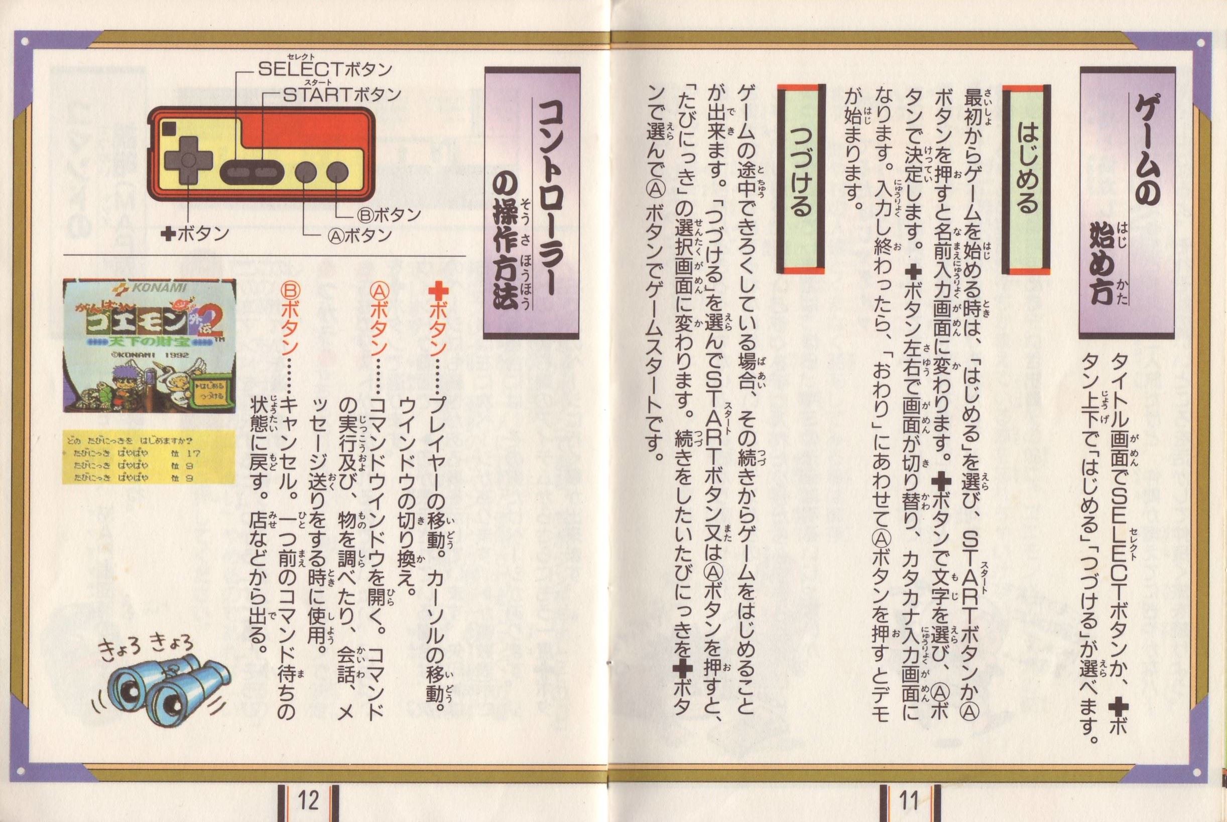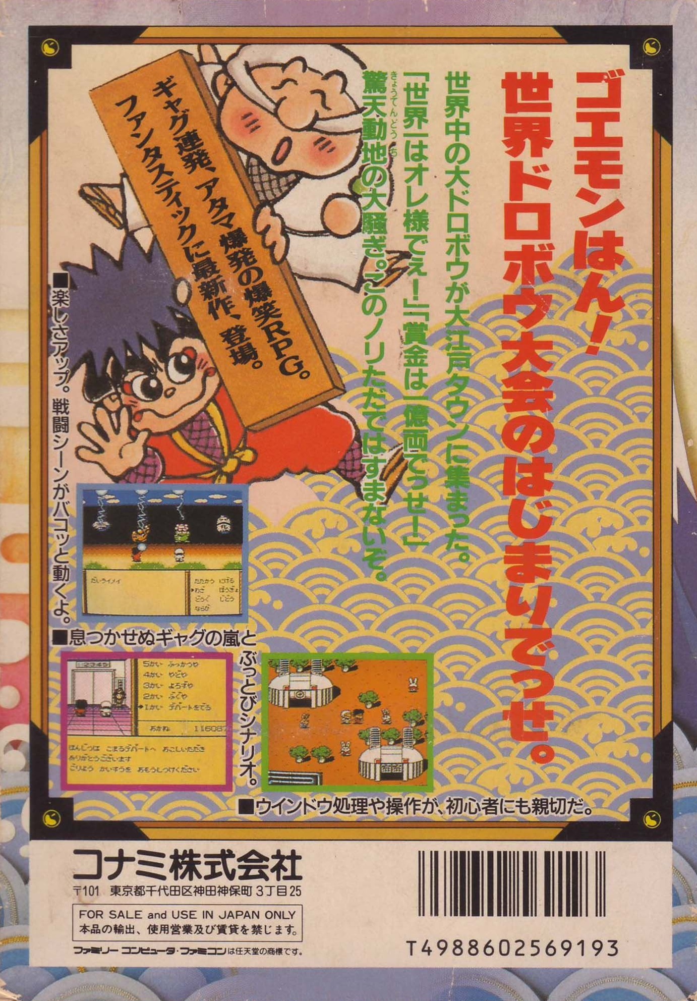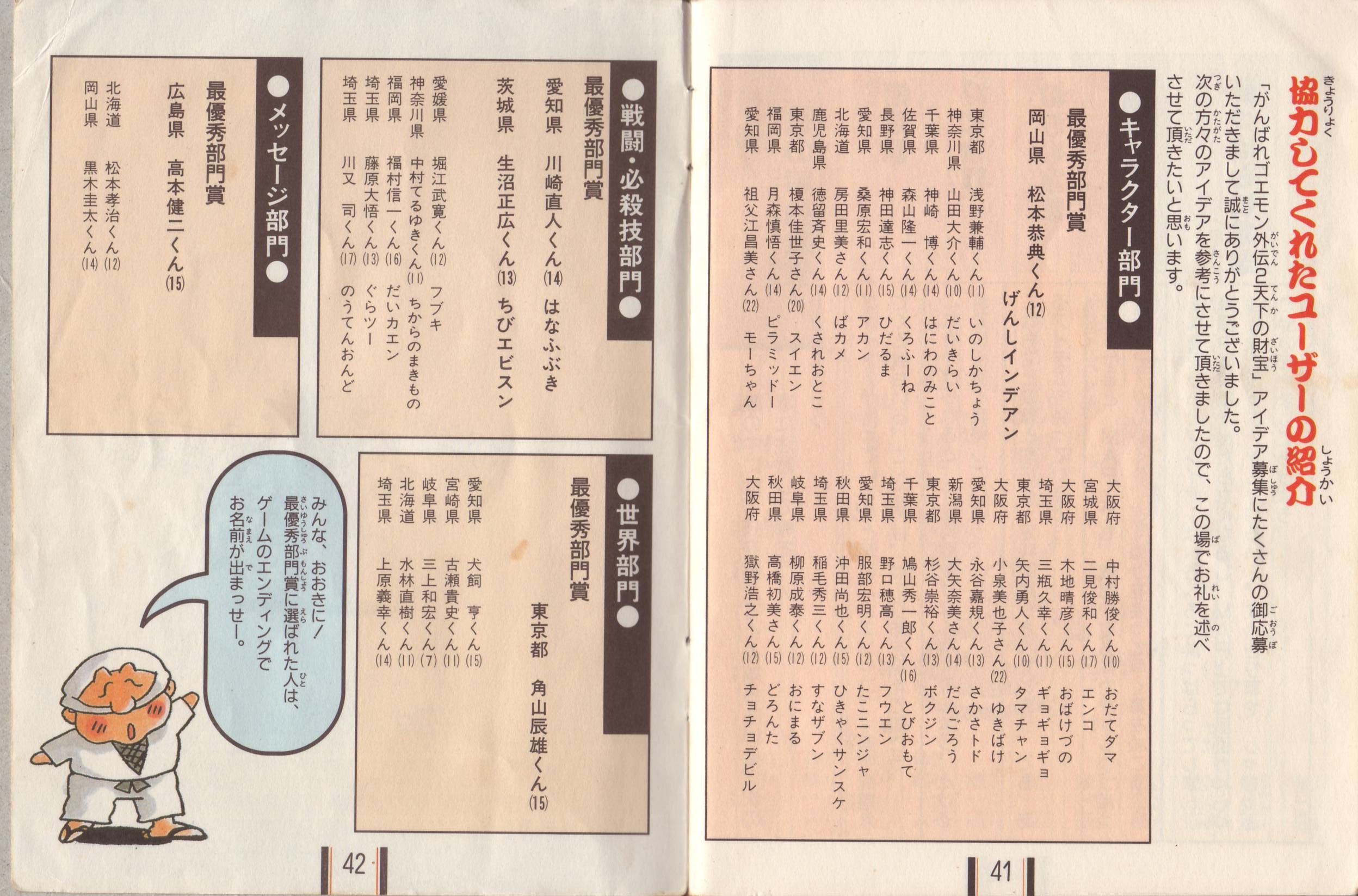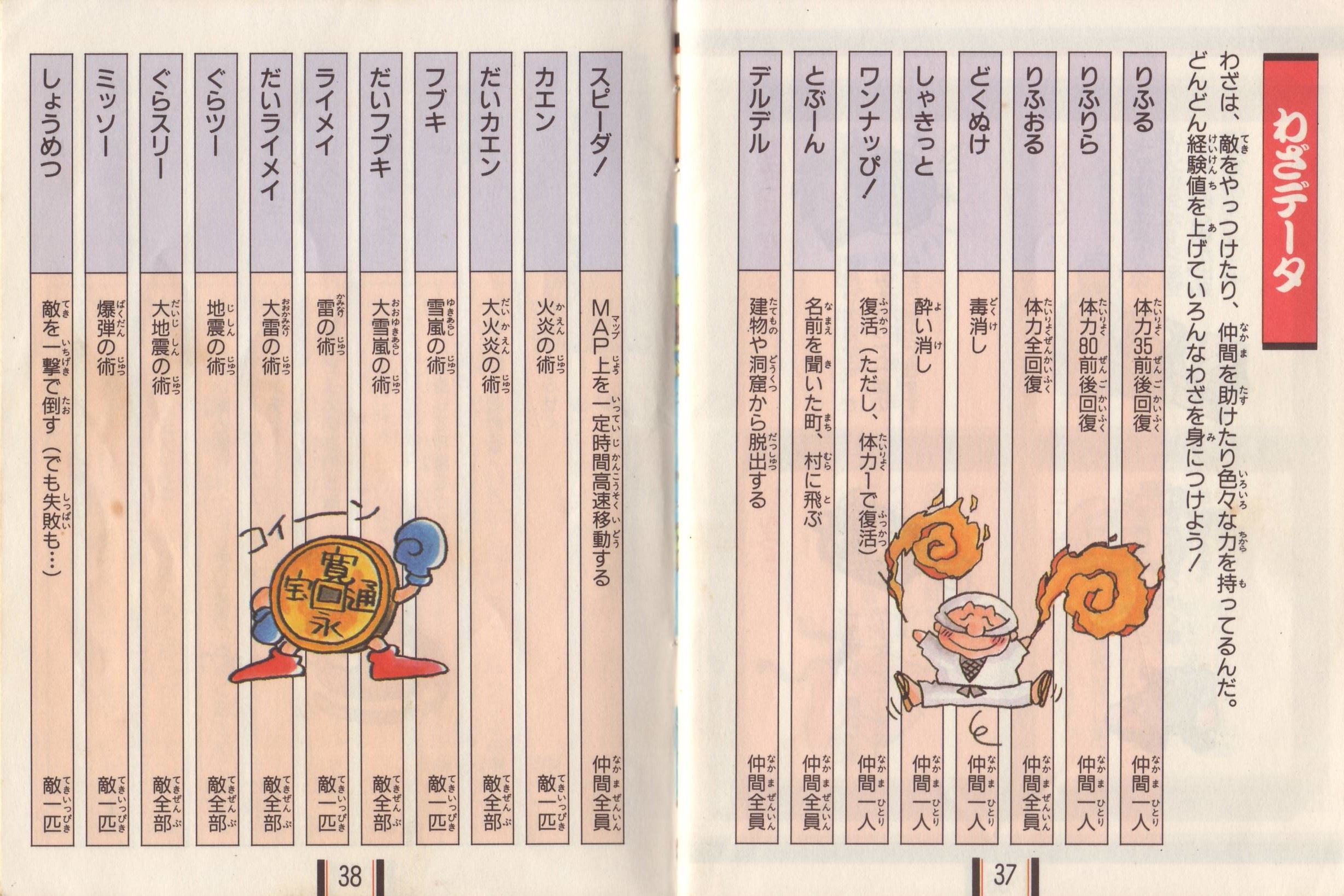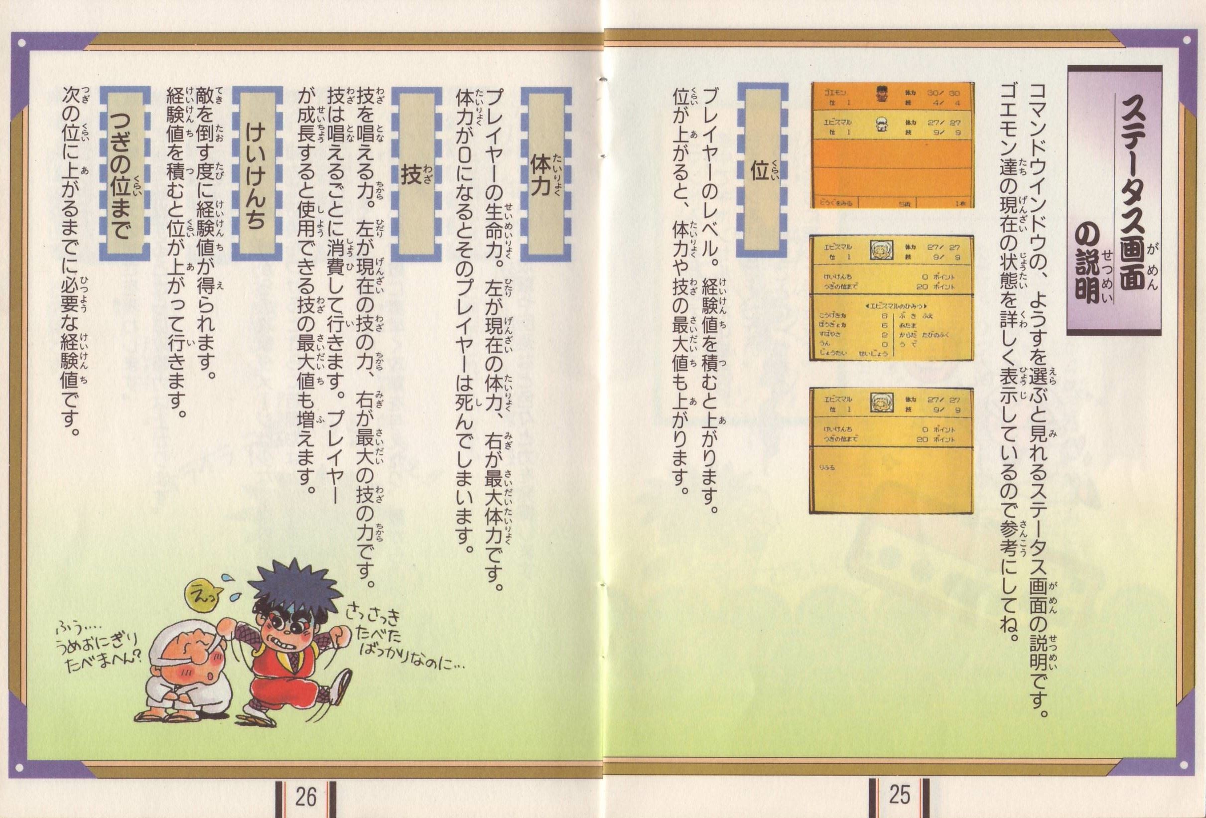 ものがたり「フィーーーーーーッ、平和だねぇー。こう静かだとオレ様の出番もありゃしねぇなあぁ」とゴロゴロヒマを楽しんでいるゴエモンの所へいきなり、 「ゴエモンはん、ゴ・エ・モ・ン・はん♡ ええ話でっせー、ごっついニュースでっせー」 相棒のエビス丸が、かわら版を持って飛び込んで来た。 そのかわら版には大江戸タウンで行われる『世界ドロボウ大会』の案内が書かれていた。 「『世界ドロボウ大会』だとぉ?うさんくせー! ケッ、ケッ! オレ様を誰だと思っていやがるんでぇ。 由緒正しい義賊のゴエモン様だぜ。ドロボウなんかと一緒にされたんじゃあ、御先祖様に申し訳ねぇじゃねぇか」 「……賞金一億両でもでっか?」 「な、なにぃ?いっ、いちおくりょお?」 「ほにほにほに、そうでっせぇ、一億両でっせー」 「一億両つったら一両がズラーッと一億枚……」 「そーそー 一億両もありゃ、腹が割れるほどだんごが食べられて……」 「へへっ、それにあのかわいいおみっちゃんとデートしたり……。」 「それは、その、ちょっと出てみちゃおうかなっ」 「ゴエモンはん……目ぇくらみはりましたな……」 「バカヤロッ、何て事言いやがるんでぇ、この頃ノンビリしすぎたモンだからちょっと腕だめしになっ、さっ、行くぜエビス丸!」 こうして、ゴエモンとエビス丸の新しい珍道中が始まった。 「レディースアンドジェントルメン……」 大江戸タウンで『世界ドロボウ大会』の幕は切って落された。 まずは、大江戸タウン内の大江戸タワーに隠された「これぞうくん」を見つけなければ予選は通過できない。 果たしてどうなる事やら……。 がんばれゴエモン!(ついでにエビス丸もネ……) べりーべんりー地図説明書の写真をご確認ください。ゴエモン&エビス丸ヤイヤイヤイ! オレ様がゴエモン様だって事を今さら知らねーなんてゆー大マヌケ野郎はいねぇだろうな!今度はこのオレ様もちょっとばかり力が入っちまってるんでぇ。 なんたって、一億両……じゃなかった、ひ、日頃きたえたこの腕を試しに『世界ドロボウ大会』っつーのに出場するからな。 優勝はこのオレ様の頭上にビカビカ輝くんでぇ。 みなさぁーん。エビちゃんでっせー。ほにほにほにーだんごでっせ、だ・ん・ごっ。 あっ、ちゃいまんねん、コレには深いワケがありますねん。聞いてもらえまっか? ゴエモンはんゆうたら、いっつもかっこええ事ばっかゆうてはりますけどなぁ、やっぱり、ププッ、人の子だんなぁ。 だんごが腹いっぱい食えるゆうんで、えらいやる気出さはって、『世界ドロボウ大会』で優勝したるーって。 まぁ、わても食欲そんなにあらしまへんねんけど、ゴエモンはんにだんごを死ぬほど食わしたろ思うたら、なんやこう、ガンバリが出て来ましたワ。 冒険のご案内さあ、いよいよ冒険に出るぞっ! っとその前に。ゴエモンとエビス丸の前にはたくさんの困難が待ちかまえている事を忘れちゃいけない。そこで、冒険のご案内をいたしましょう。てきとーに読んでちゃ後で泣く事になるぜ。 何でもくまなく まず、町や村の人達とくまなく話をしてみる事は御存知の通り、だけど一度話してくれた事をまた聞きに行っても同じ事を言ってくれない人もいるから大事そうな情報は忘れないようにする事だね。 それと、町や村以外でも、んっ? くんくん匂うぞ、あやしげな場所だ、と思う所はチェック。くまなく歩きまわれ。 しっ、しまったぁーー。 ほらほら、ちゃんときろくしてないと、いきなり敵にやられちゃったら目も当てられないじゃない。 ゴエモンたちのレベルが上がったり、新しいどうぐを手に入れたりしたら必ずきろく! まっ、習慣にしてしまえば、ほら、キミの未来は明るいじゃないか。 持ってるだけじゃダメッ お店で、武器や防具を買っても持ってるだけじゃ役に立たない。ちゃんとその武器や防具を使いこなせる人が装備してはじめて役に立つ。 それから、どこに何を装備するかも必要だぞ。ガッチガチに装備を固めて、いざ出陣! 仲間と協力して行こう! 初めはゴエモンとエビス丸の二人旅だけど、仲間が増えてにぎやかなパーティーになるよ。 それぞれのいいところを活かして仲良く旅を続けよう。 ゲームの始め方タイトル画面でSELECTボタンか、十字ボタン上下で「はじめる」「つづける」が選べます。はじめる 最初からゲームを始める時は、「はじめる」を選び、STARTボタンかAボタンを押すと名前入力画面に変わります。 十字ボタンで文字を選び、Aボタンで決定します。十字ボタン左右で画面が切り替り、カタカナ入力画面になります。 入力し終わったら、「おわり」にあわせてAボタンを押すとデモが始まります。 つづける ゲームの途中できろくしている場合、その続きからゲームをはじめることが出来ます。 「つづける」を選んでSTARTボタン又はAボタンを押すと、「たびにっき」の選択画面に変わります。 続きをしたいたびにっきを十字ボタンで選んでAボタンでゲームスタートです