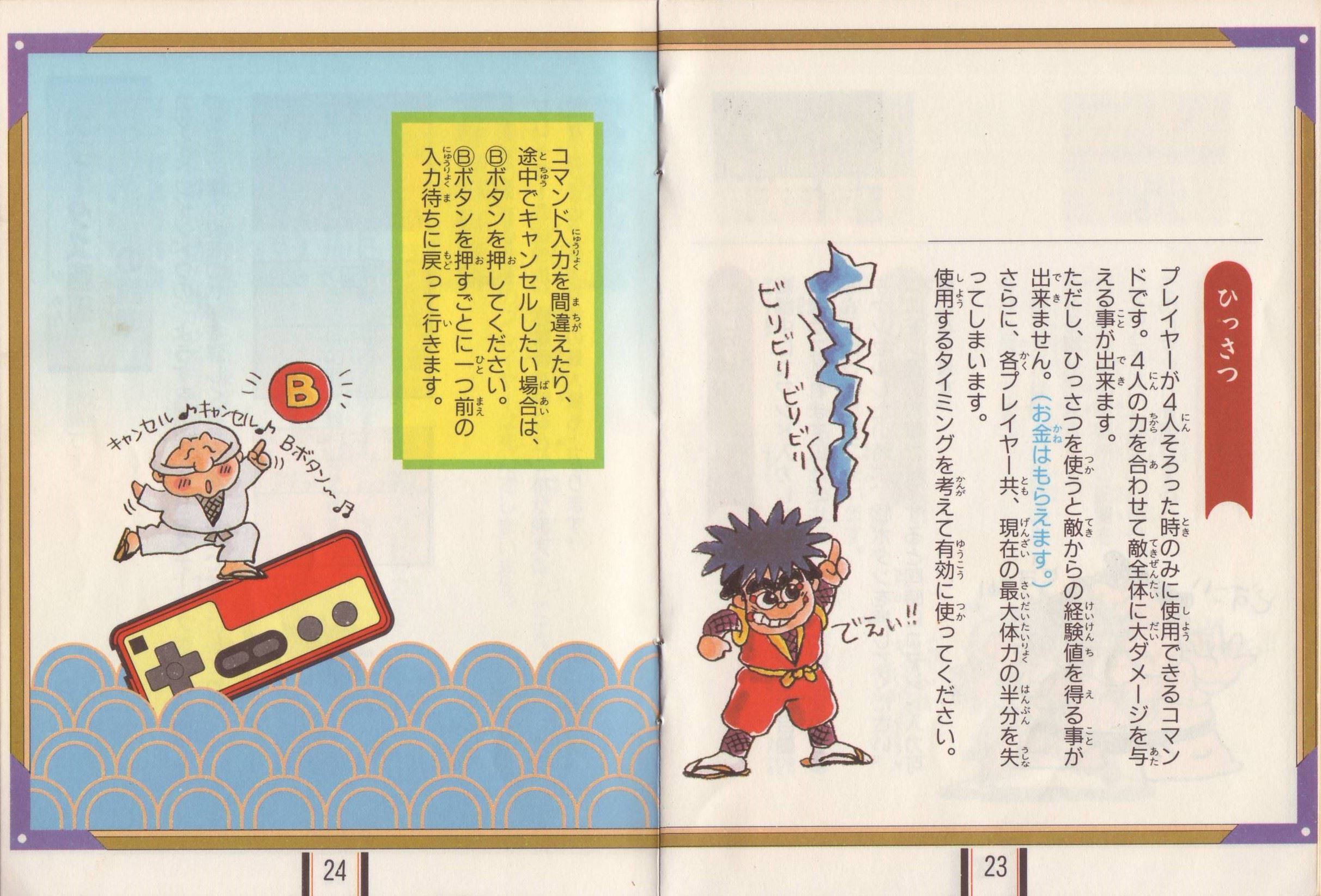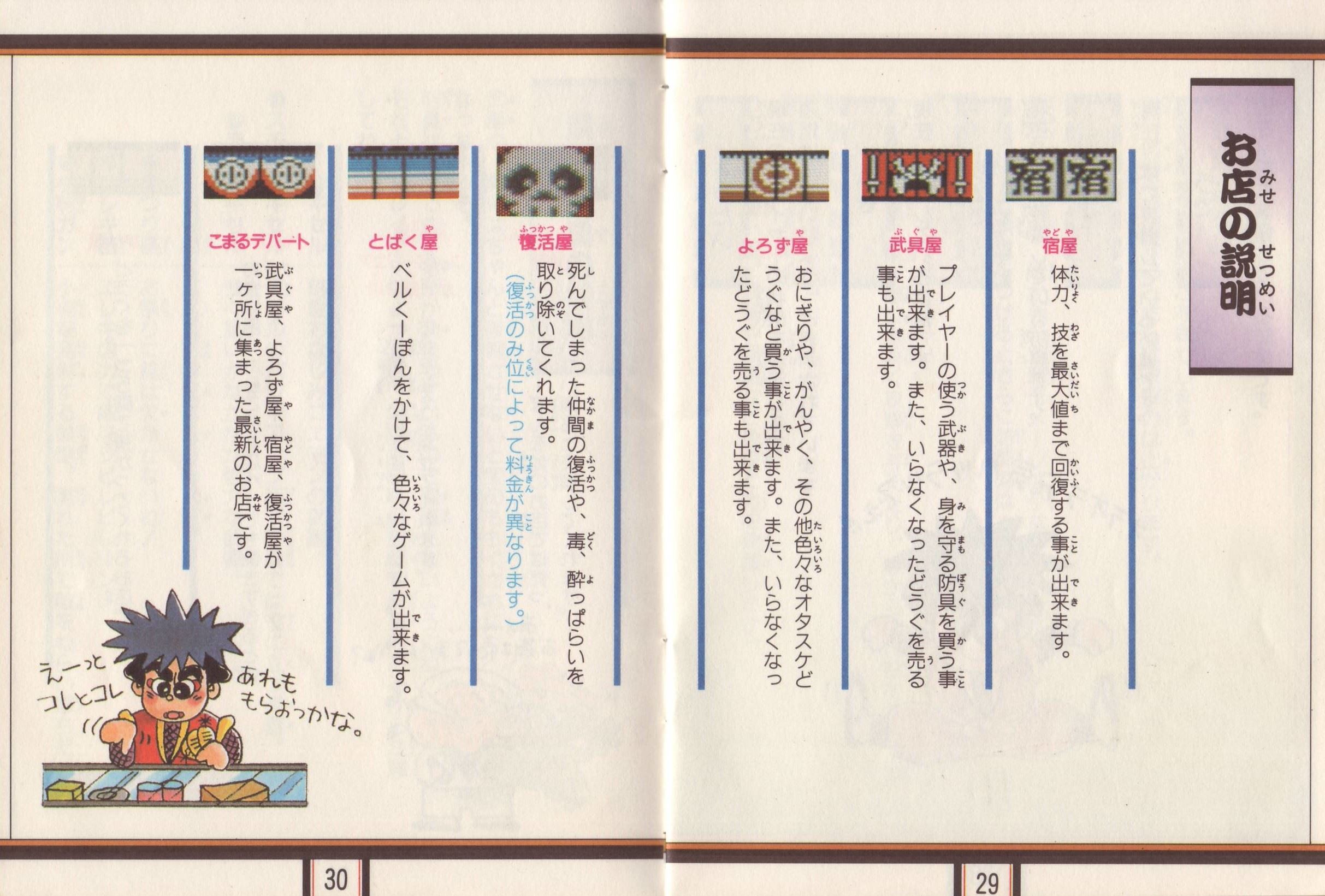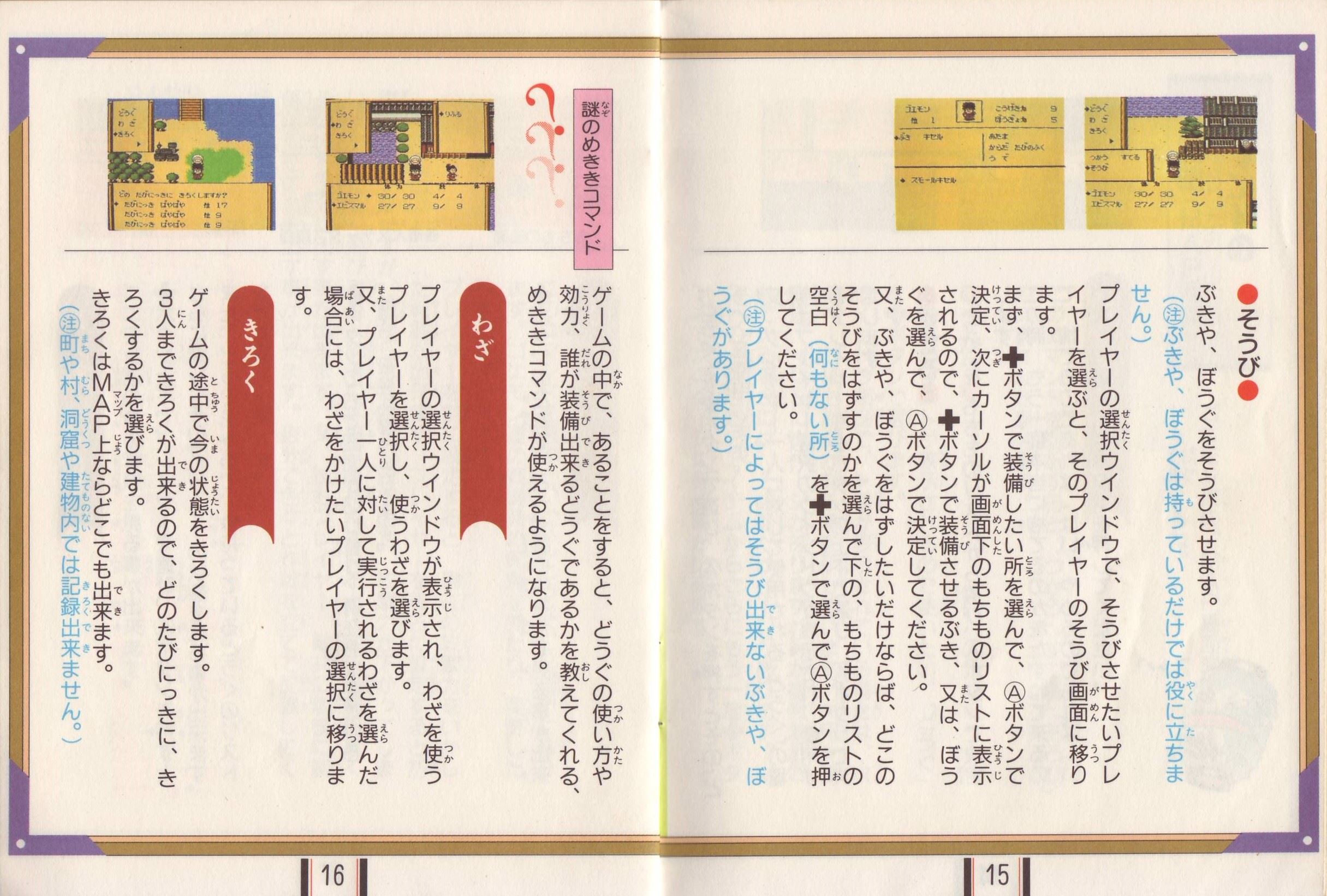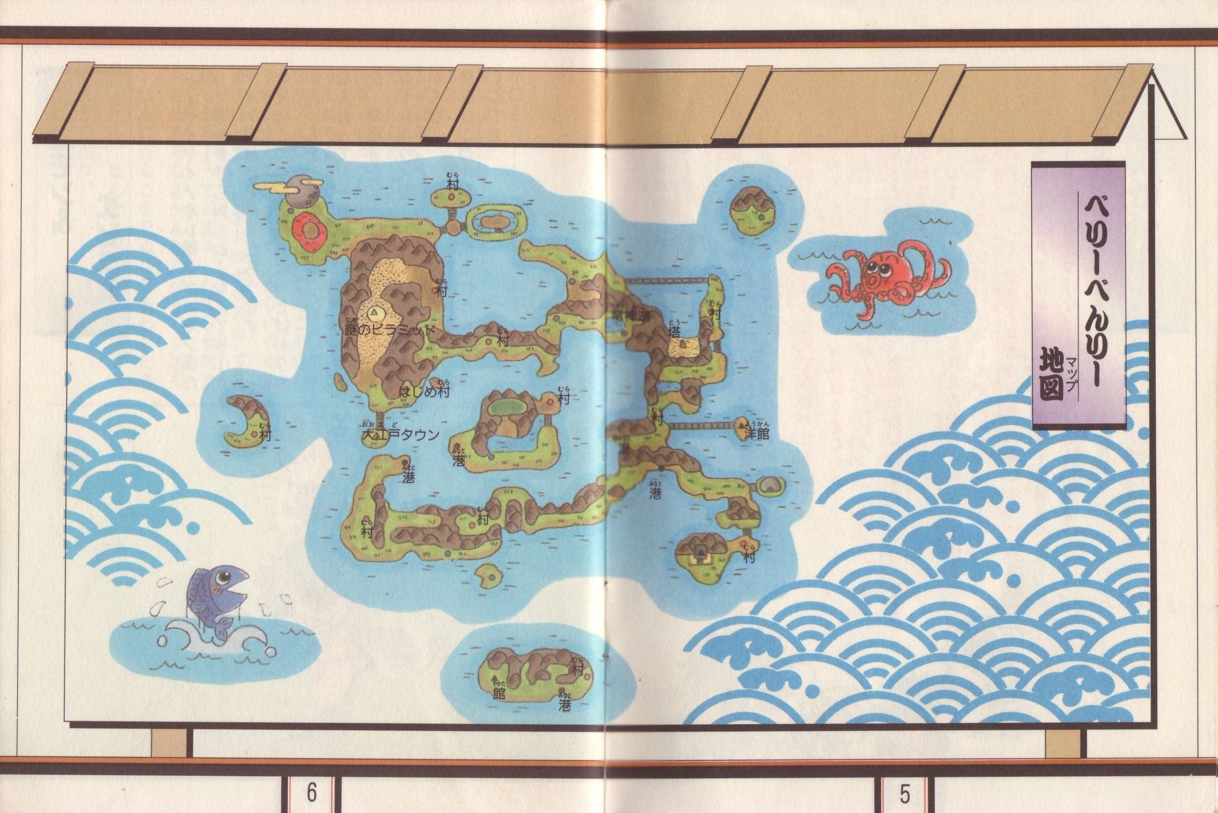 ものがたり「フィーーーーーーッ、平和だねぇー。こう静かだとオレ様の出番もありゃしねぇなあぁ」とゴロゴロヒマを楽しんでいるゴエモンの所へいきなり、 「ゴエモンはん、ゴ・エ・モ・ン・はん♡ ええ話でっせー、ごっついニュースでっせー」 相棒のエビス丸が、かわら版を持って飛び込んで来た。 そのかわら版には大江戸タウンで行われる『世界ドロボウ大会』の案内が書かれていた。 「『世界ドロボウ大会』だとぉ?うさんくせー! ケッ、ケッ! オレ様を誰だと思っていやがるんでぇ。 由緒正しい義賊のゴエモン様だぜ。ドロボウなんかと一緒にされたんじゃあ、御先祖様に申し訳ねぇじゃねぇか」 「……賞金一億両でもでっか?」 「な、なにぃ?いっ、いちおくりょお?」 「ほにほにほに、そうでっせぇ、一億両でっせー」 「一億両つったら一両がズラーッと一億枚……」 「そーそー 一億両もありゃ、腹が割れるほどだんごが食べられて……」 「へへっ、それにあのかわいいおみっちゃんとデートしたり……。」 「それは、その、ちょっと出てみちゃおうかなっ」 「ゴエモンはん……目ぇくらみはりましたな……」 「バカヤロッ、何て事言いやがるんでぇ、この頃ノンビリしすぎたモンだからちょっと腕だめしになっ、さっ、行くぜエビス丸!」 こうして、ゴエモンとエビス丸の新しい珍道中が始まった。 「レディースアンドジェントルメン……」 大江戸タウンで『世界ドロボウ大会』の幕は切って落された。 まずは、大江戸タウン内の大江戸タワーに隠された「これぞうくん」を見つけなければ予選は通過できない。 果たしてどうなる事やら……。 がんばれゴエモン!(ついでにエビス丸もネ……) べりーべんりー地図説明書の写真をご確認ください。ゴエモン&エビス丸ヤイヤイヤイ! オレ様がゴエモン様だって事を今さら知らねーなんてゆー大マヌケ野郎はいねぇだろうな!今度はこのオレ様もちょっとばかり力が入っちまってるんでぇ。 なんたって、一億両……じゃなかった、ひ、日頃きたえたこの腕を試しに『世界ドロボウ大会』っつーのに出場するからな。 優勝はこのオレ様の頭上にビカビカ輝くんでぇ。 みなさぁーん。エビちゃんでっせー。ほにほにほにーだんごでっせ、だ・ん・ごっ。 あっ、ちゃいまんねん、コレには深いワケがありますねん。聞いてもらえまっか? ゴエモンはんゆうたら、いっつもかっこええ事ばっかゆうてはりますけどなぁ、やっぱり、ププッ、人の子だんなぁ。 だんごが腹いっぱい食えるゆうんで、えらいやる気出さはって、『世界ドロボウ大会』で優勝したるーって。 まぁ、わても食欲そんなにあらしまへんねんけど、ゴエモンはんにだんごを死ぬほど食わしたろ思うたら、なんやこう、ガンバリが出て来ましたワ。 冒険のご案内さあ、いよいよ冒険に出るぞっ! っとその前に。ゴエモンとエビス丸の前にはたくさんの困難が待ちかまえている事を忘れちゃいけない。そこで、冒険のご案内をいたしましょう。てきとーに読んでちゃ後で泣く事になるぜ。 何でもくまなく まず、町や村の人達とくまなく話をしてみる事は御存知の通り、だけど一度話してくれた事をまた聞きに行っても同じ事を言ってくれない人もいるから大事そうな情報は忘れないようにする事だね。 それと、町や村以外でも、んっ? くんくん匂うぞ、あやしげな場所だ、と思う所はチェック。くまなく歩きまわれ。 しっ、しまったぁーー。 ほらほら、ちゃんときろくしてないと、いきなり敵にやられちゃったら目も当てられないじゃない。 ゴエモンたちのレベルが上がったり、新しいどうぐを手に入れたりしたら必ずきろく! まっ、習慣にしてしまえば、ほら、キミの未来は明るいじゃないか。 持ってるだけじゃダメッ お店で、武器や防具を買っても持ってるだけじゃ役に立たない。ちゃんとその武器や防具を使いこなせる人が装備してはじめて役に立つ。 それから、どこに何を装備するかも必要だぞ。ガッチガチに装備を固めて、いざ出陣! 仲間と協力して行こう! 初めはゴエモンとエビス丸の二人旅だけど、仲間が増えてにぎやかなパーティーになるよ。 それぞれのいいところを活かして仲良く旅を続けよう。 ゲームの始め方タイトル画面でSELECTボタンか、十字ボタン上下で「はじめる」「つづける」が選べます。はじめる 最初からゲームを始める時は、「はじめる」を選び、STARTボタンかAボタンを押すと名前入力画面に変わります。 十字ボタンで文字を選び、Aボタンで決定します。十字ボタン左右で画面が切り替り、カタカナ入力画面になります。 入力し終わったら、「おわり」にあわせてAボタンを押すとデモが始まります。 つづける ゲームの途中できろくしている場合、その続きからゲームをはじめることが出来ます。 「つづける」を選んでSTARTボタン又はAボタンを押すと、「たびにっき」の選択画面に変わります。 続きをしたいたびにっきを十字ボタンで選んでAボタンでゲームスタートです