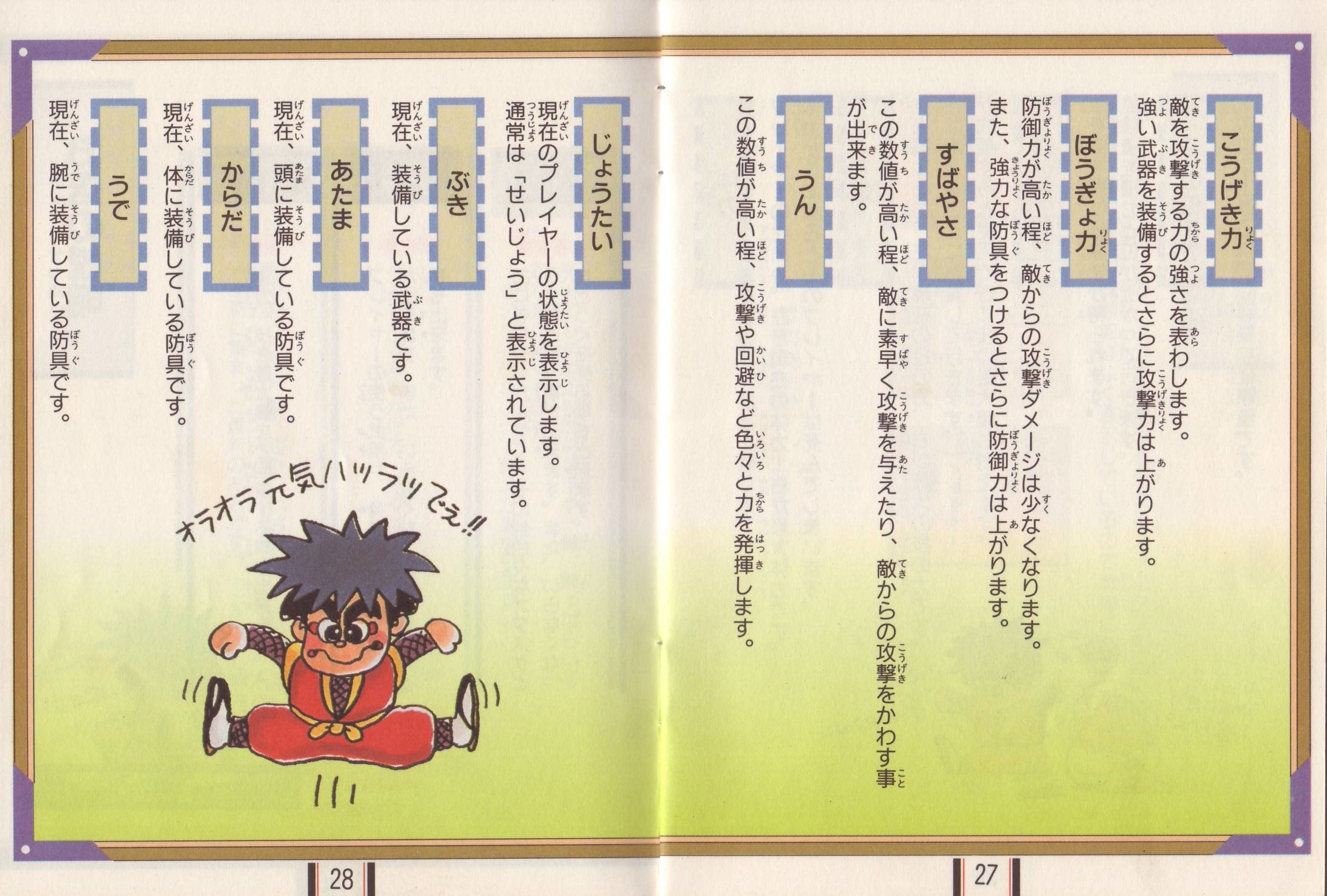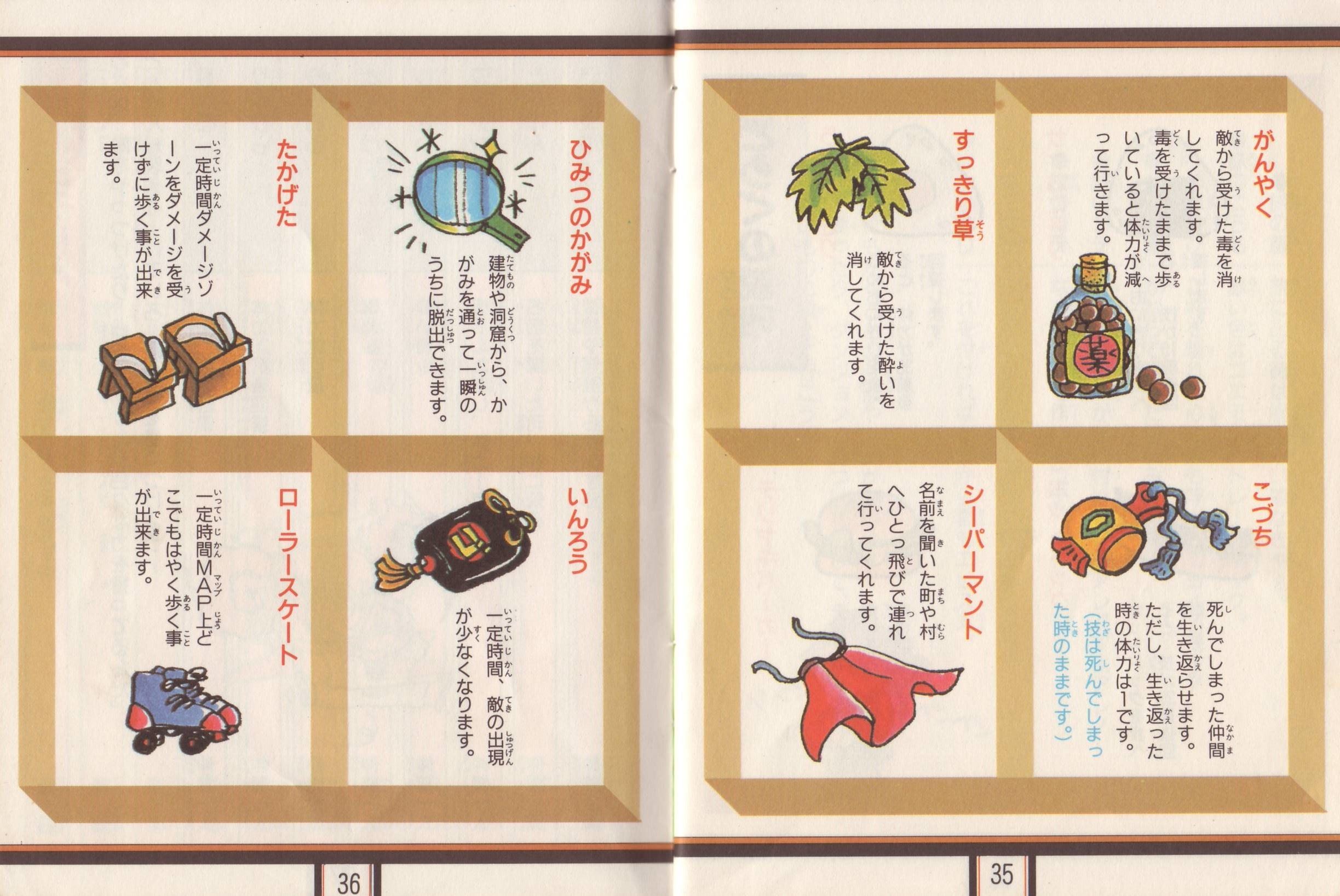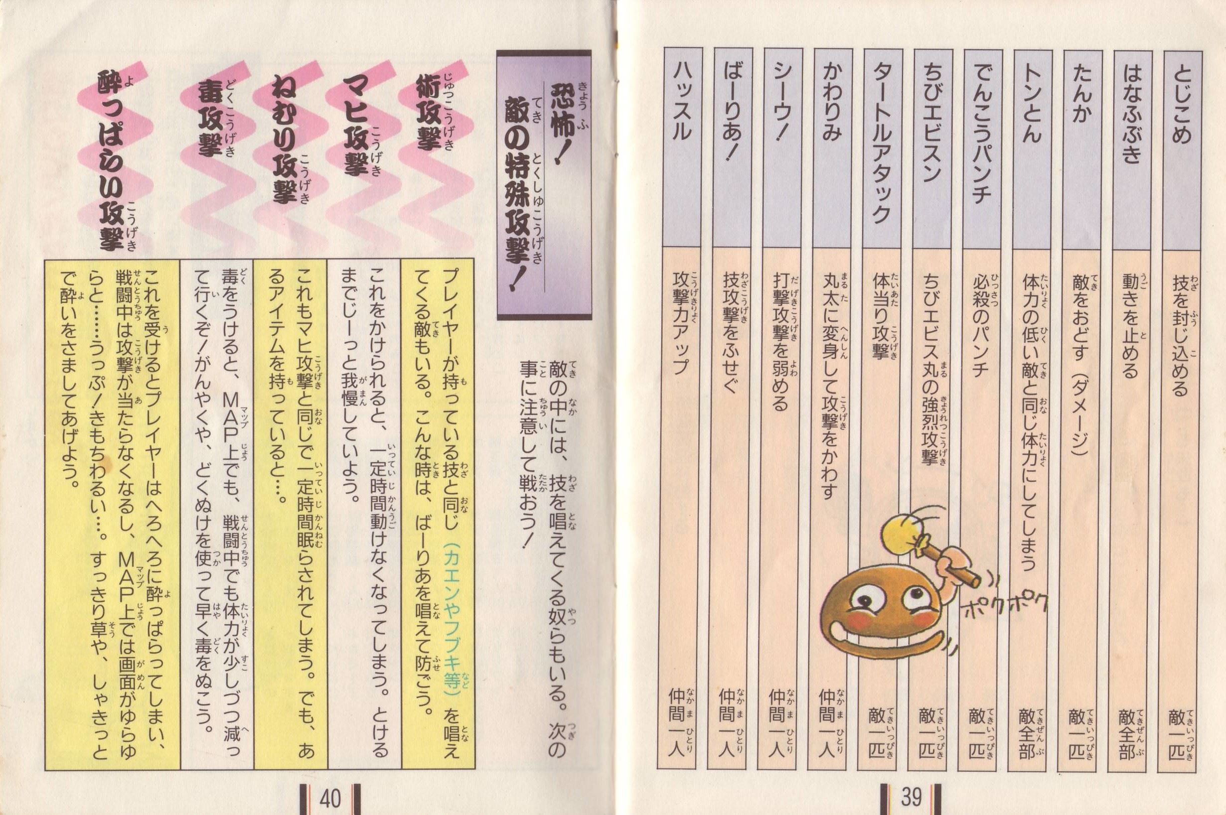 恐怖! 敵の特殊攻撃!敵の中には、技を唱えてくる奴らもいる。次の事に注意して戦おう!術攻撃 プレイヤーが持っている技と同じ(カエンやフブキ等)を唱えてくる敵もいる。こんな時は、ばーりあを唱えて防ごう。 マヒ攻撃 これをかけられると、一定時間動けなくなってしまう。とけるまでじーっと我慢していよう。 ねむり攻撃 これもマヒ攻撃と同じで一定時間眠らされてしまう。でも、あるアイテムを持っていると…。 毒攻撃 毒をうけると、MAP上でも、戦闘中でも体力が少しずつ減って行くぞ! がんやくや、どくぬけを使って早く毒をぬこう。 酔っぱらい攻撃 これを受けるとプレイヤーはへろへろに酔っぱらってしまい、戦闘中は攻撃が当たらなくなるし、MAP上では画面がゆらゆらと……うっぷ!きもちわるい…。すっきり草や、しゃきっとで酔いをさましてあげよう。 |