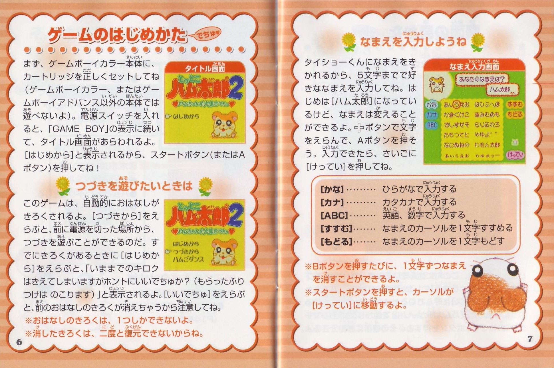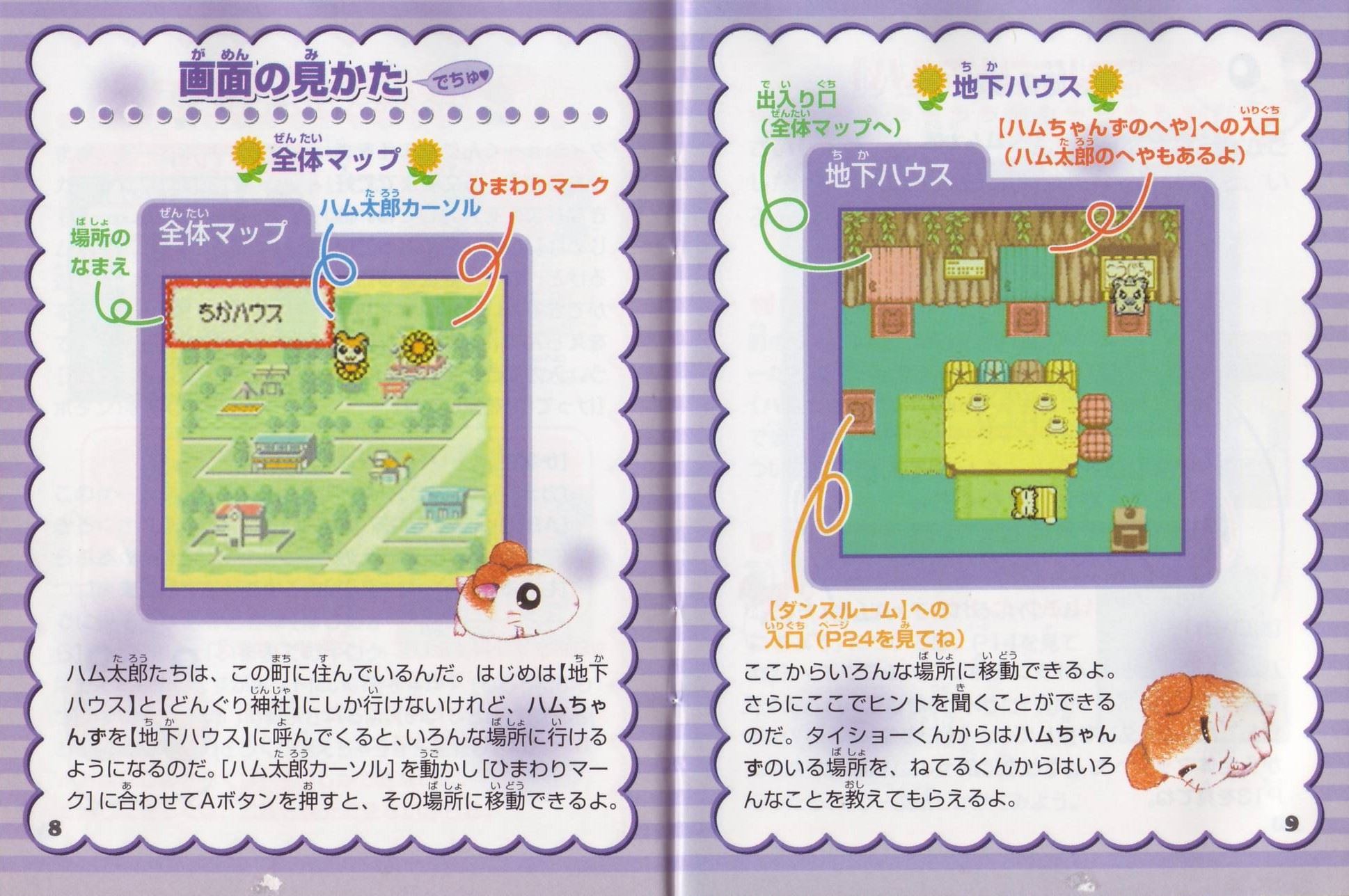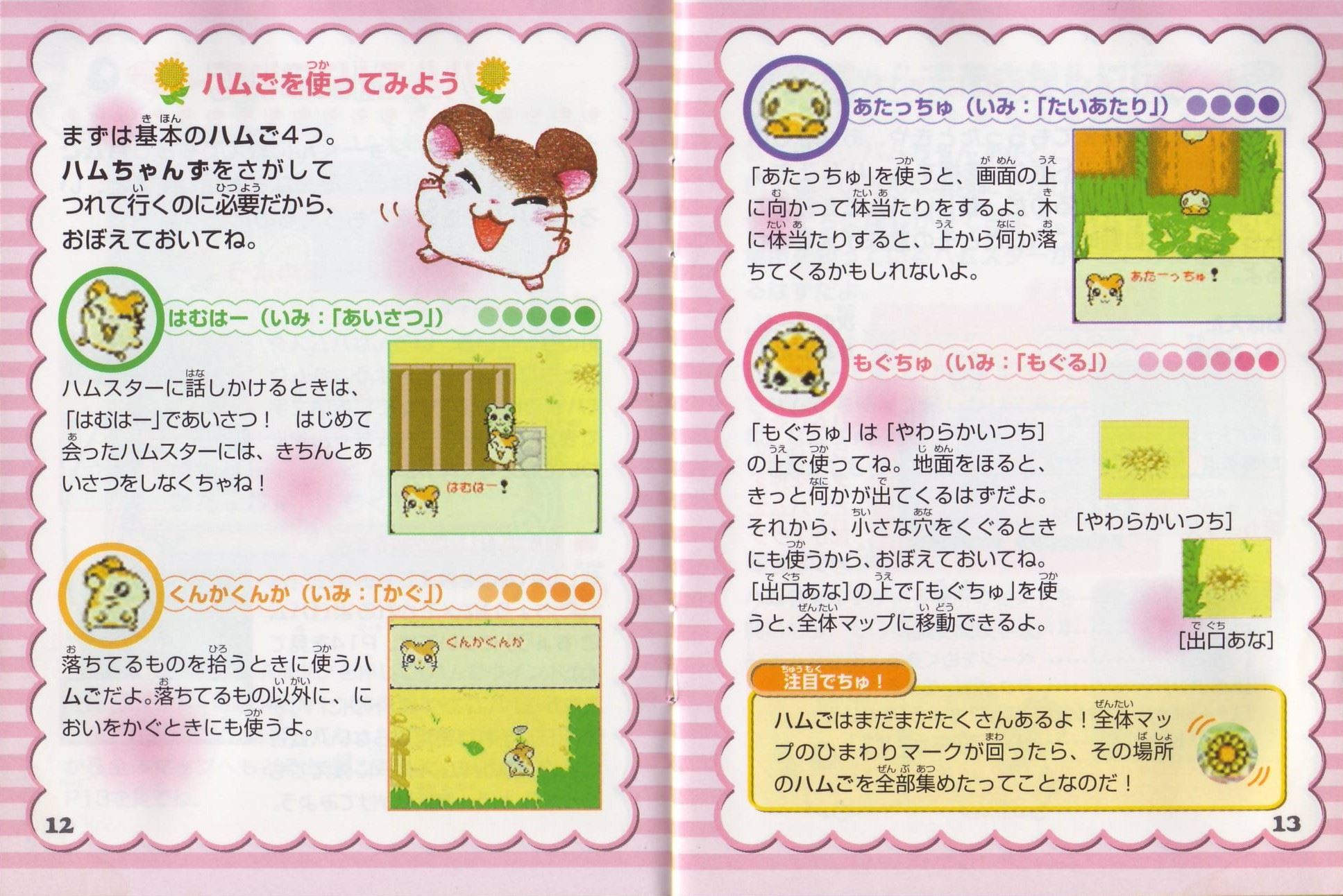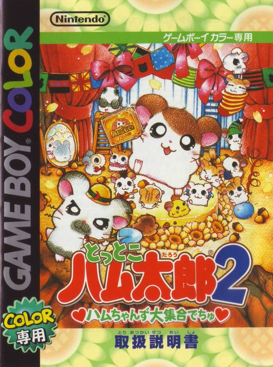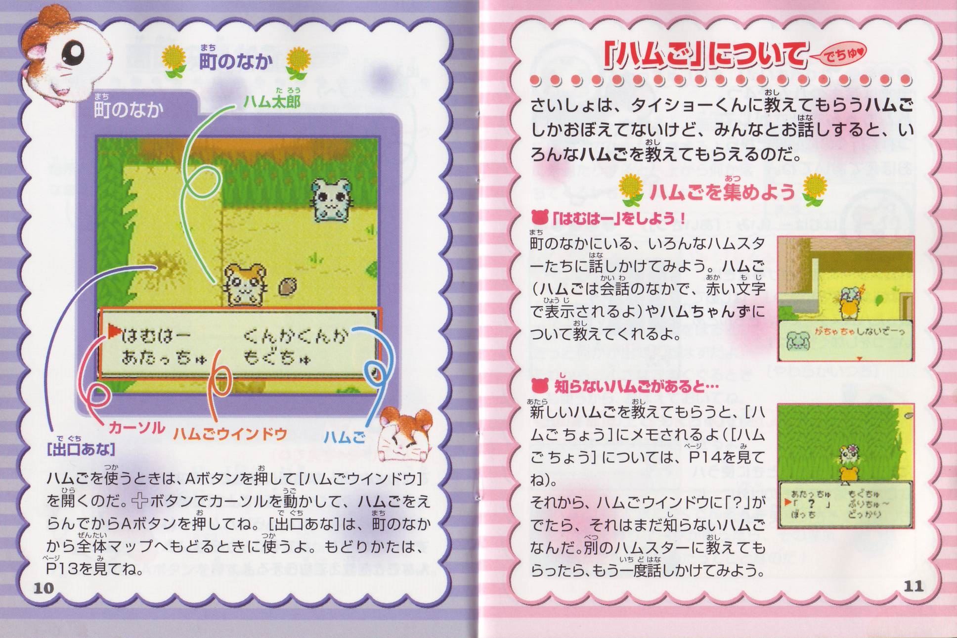 ストーリーある日、ハム太郎は、タイショーくんに、こんなお願いをされました。「うぉー! おれはいま、もうれつにいそがしいぜ! だれかひまそうなやつは…。 おっ、いたいた。おーい、ハム太郎! わるいんだけど、ハムちゃんずのメンバーを呼んできてくれないか? えっ、どうしてかって? それは、あとのお楽しみ。そうそう、おれたちハムスターは”ハム語”をつかって会話しているから、 ハムスターにあったらハムごではなしかけるといいぜ! へ? ハムごってなにかって? ハムごってのは、ハムスターのあいだでおおはやりのことばじゃねーか…。 しらなかったのか? しょうがねーなぁ。 そんじゃ、おれがしってるハムごをおしえてやっから、ちゃーんとおぼえろよ。 ハムちゃんずをさがすのにも、やくだつとおもうぜ。 それじゃあ、たのんだぞ!」 ……さて、ハム太郎は、ハムちゃんずのみんなを集めることができるのでしょうか? そうさほうほう十字ボタン:カーソルの移動/ハム太郎の移動(歩く)Bボタンを押したまま十字ボタンを押すと、走ることができるよ。 Aボタン:決定/ハムごウインドウをひらく/会話の送り(▼マークが出ている場合) Bボタン:キャンセル/ハムごウインドウをとじる/前の画面にもどる スタートボタン:[ハムごちょう]をひらく/[ハムごちょう]をとじる(P14を見てね) ゲームのはじめかたまず、ゲームボーイカラー本体に、カートリッジを正しくセットしてね(ゲームボーイカラー、またはゲームボーイアドバンス以外の本体では遊べないよ)。電源スイッチを入れると、「GAME BOY」の表示に続いて、タイトル画面があらわれるよ。 [はじめから]と表示されるから、スタートボタン(またはAボタン)を押してね! つづきを遊びたいときは このゲームは、自動的におはなしがきろくされるよ。[つづきから]をえらぶと、前に電源を切った場所から、つづきを遊ぶことができるのだ。 すでにきろくがあるときに[はじめから]をえらぶと、「いままでのキロクはきえてしまいますがホントにいいでちゅか?(もらったふりつけはのこります)」と表示されるよ。 [いいでちゅ]をえらぶと、前のおはなしのきろくが消えちゃうから注意してね。 ※おはなしのきろくは、1つしかできないよ。 ※消したきろくは、二度と復元できないからね。 なまえを入力しようね タイショーくんになまえをきかれるから、5文字までで好きななまえを入力してね。 はじめは[ハム太郎]になっているけど、なまえは変えることができるよ。 十字ボタンで文字をえらんで、Aボタンを押そう。入力できたら、さいごに[けってい]を押してね。 [かな]……ひらがなで入力する [カナ]……カタカナで入力する [ABC]……英語、数字で入力する [すすむ]……なまえのカーソルを1文字すすめる [もどる]……なまえのカーソルを1文字もどす ※Bボタンを押すたびに、1文字ずつなまえを消すことができるよ。 ※スタートボタンを押すと、カーソルが[けってい]に移動するよ。 画面の見かた全体マップハム太郎たちは、この町に住んでいるんだ。はじめは【地下ハウス】と【どんぐり神社】にしか行けないけれど、ハムちゃんずを【地下ハウス】に呼んでくると、いろんな場所に行けるようになるのだ。 [ハム太郎カーソル]を動かし[ひまわりマーク]に合わせてAボタンを押すと、その場所に移動できるよ。 地下ハウス ここからいろんな場所に移動できるよ。さらにここでヒントを聞くことができるのだ。 タイショーくんからはハムちゃんずのいる場所を、ねてるくんからはいろんなことを教えてもらえるよ。 【ダンスルーム】への入口(P24を見てね) 町のなか ハムごを使うときは、Aボタンを押して[ハムごウインドウ]を開くのだ。 十字ボタンでカーソルを動かして、ハムごをえらんでAボタンを押してね。 [出口あな]は、町のなかから全体マップへもどるときに使うよ。 もどりかたは、P13を見てね。 ハムごについてさいしょは、タイショーくんに教えてもらうハムごしかおぼえてないけど、みんなとお話しすると、いろんなハムごを教えてもらえるのだ。ハムごを集めよう 「はむはー」をしよう! 町のなかにいる、いろんなハムスターたちに話しかけてみよう。 ハムご(ハムごは会話のなかで、赤い文字で表示されるよ)やハムちゃんずについて教えてくれるよ。 知らないハムごがあると… 新しいハムごを教えてもらうと、[ハムごちょう]にメモされるよ([ハムごちょう]については、P14を見てね)。 それから、ハムごウインドウに「?」がでたら、それはまだ知らないハムごなんだ。 別のハムスターに教えてもらったら、もう一度話しかけてみよう。 ハムごを使ってみよう まずは基本のハムご4つ。 ハムちゃんずをさがしてつれて行くのに必要だから、おぼえておいてね。 はむはー(いみ:「あいさつ」) ハムスターに話しかけるときは、「はむはー」であいさつ!はじめて会ったハムスターには、きちんとあいさつをしなくちゃね! くんかくんか(いみ:「かぐ」) 落ちているものを拾