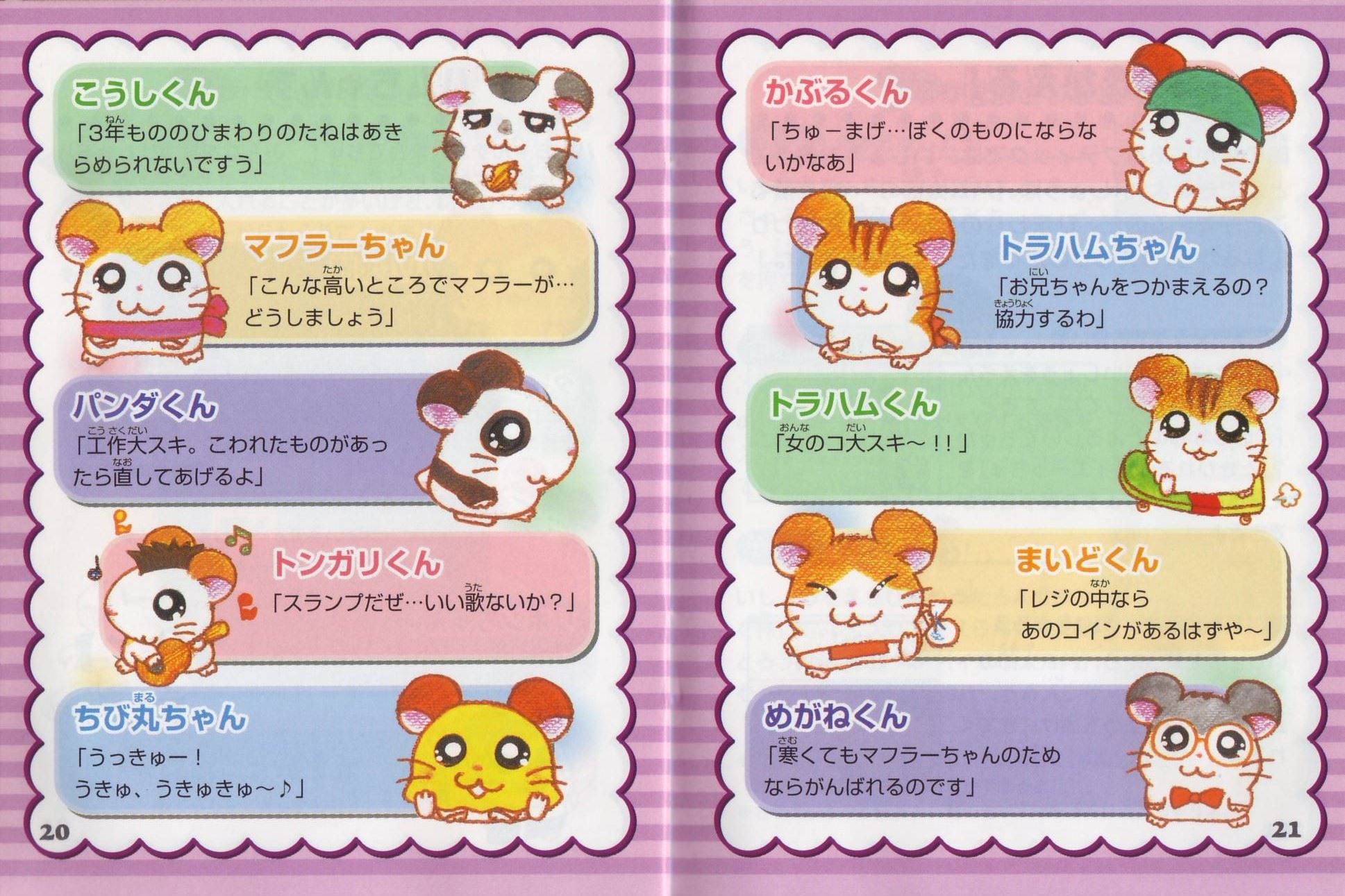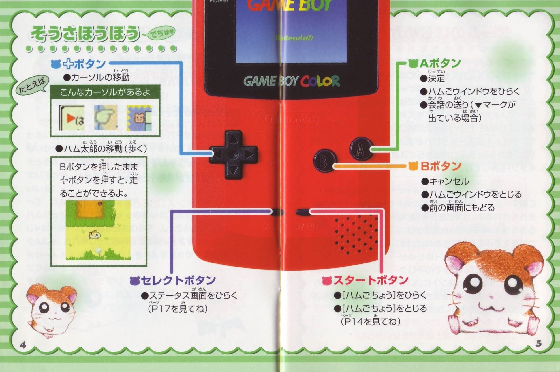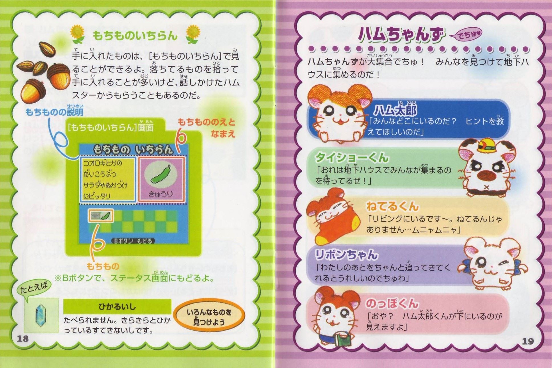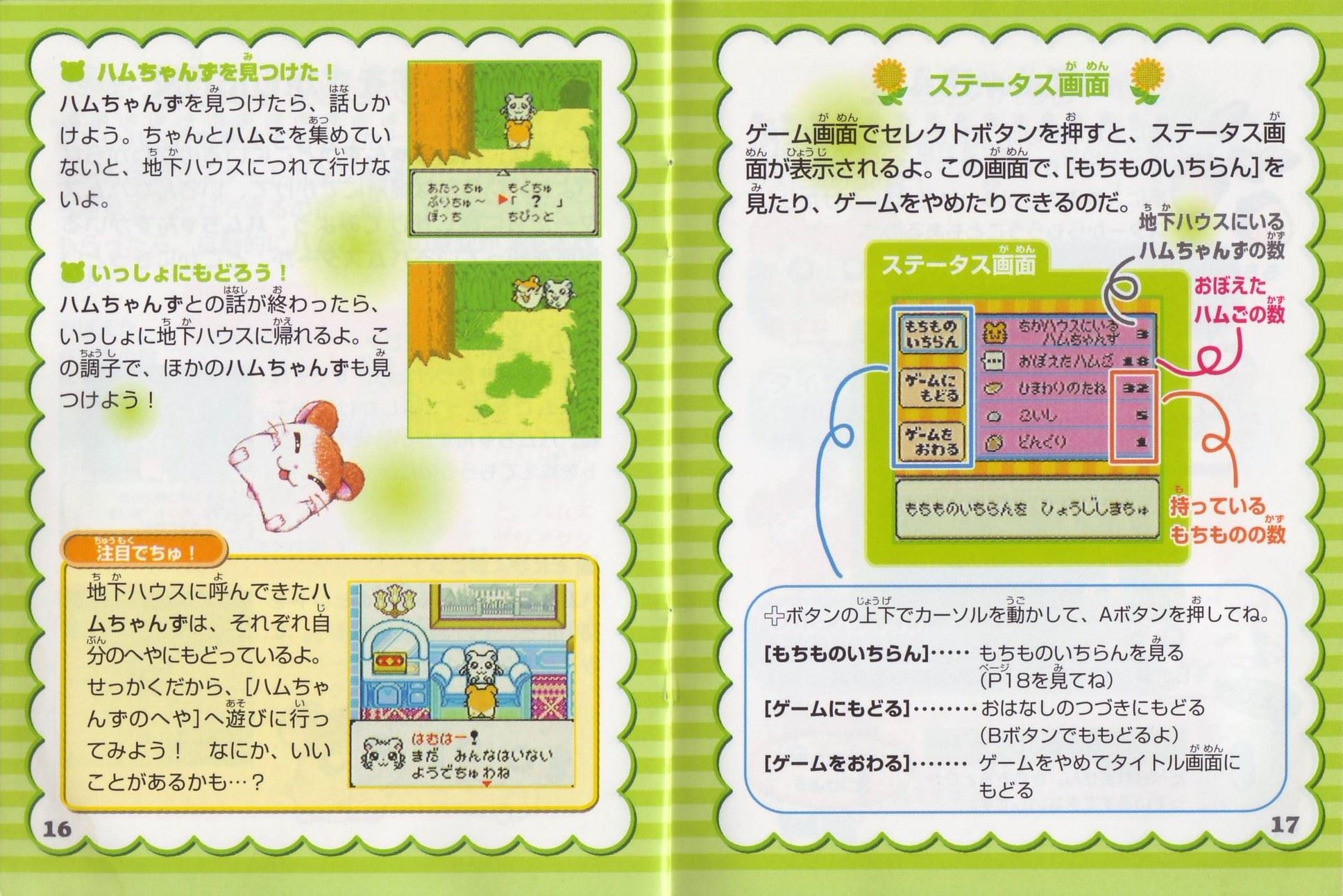 ストーリーある日、ハム太郎は、タイショーくんに、こんなお願いをされました。「うぉー! おれはいま、もうれつにいそがしいぜ! だれかひまそうなやつは…。 おっ、いたいた。おーい、ハム太郎! わるいんだけど、ハムちゃんずのメンバーを呼んできてくれないか? えっ、どうしてかって? それは、あとのお楽しみ。そうそう、おれたちハムスターは”ハム語”をつかって会話しているから、 ハムスターにあったらハムごではなしかけるといいぜ! へ? ハムごってなにかって? ハムごってのは、ハムスターのあいだでおおはやりのことばじゃねーか…。 しらなかったのか? しょうがねーなぁ。 そんじゃ、おれがしってるハムごをおしえてやっから、ちゃーんとおぼえろよ。 ハムちゃんずをさがすのにも、やくだつとおもうぜ。 それじゃあ、たのんだぞ!」 ……さて、ハム太郎は、ハムちゃんずのみんなを集めることができるのでしょうか? そうさほうほう十字ボタン:カーソルの移動/ハム太郎の移動(歩く)Bボタンを押したまま十字ボタンを押すと、走ることができるよ。 Aボタン:決定/ハムごウインドウをひらく/会話の送り(▼マークが出ている場合) Bボタン:キャンセル/ハムごウインドウをとじる/前の画面にもどる スタートボタン:[ハムごちょう]をひらく/[ハムごちょう]をとじる(P14を見てね) ゲームのはじめかたまず、ゲームボーイカラー本体に、カートリッジを正しくセットしてね(ゲームボーイカラー、またはゲームボーイアドバンス以外の本体では遊べないよ)。電源スイッチを入れると、「GAME BOY」の表示に続いて、タイトル画面があらわれるよ。 [はじめから]と表示されるから、スタートボタン(またはAボタン)を押してね! つづきを遊びたいときは このゲームは、自動的におはなしがきろくされるよ。[つづきから]をえらぶと、前に電源を切った場所から、つづきを遊ぶことができるのだ。 すでにきろくがあるときに[はじめから]をえらぶと、「いままでのキロクはきえてしまいますがホントにいいでちゅか?(もらったふりつけはのこります)」と表示されるよ。 [いいでちゅ]をえらぶと、前のおはなしのきろくが消えちゃうから注意してね。 ※おはなしのきろくは、1つしかできないよ。 ※消したきろくは、二度と復元できないからね。 なまえを入力しようね タイショーくんになまえをきかれるから、5文字までで好きななまえを入力してね。 はじめは[ハム太郎]になっているけど、なまえは変えることができるよ。 十字ボタンで文字をえらんで、Aボタンを押そう。入力できたら、さいごに[けってい]を押してね。 [かな]……ひらがなで入力する [カナ]……カタカナで入力する [ABC]……英語、数字で入力する [すすむ]……なまえのカーソルを1文字すすめる [もどる]……なまえのカーソルを1文字もどす ※Bボタンを押すたびに、1文字ずつなまえを消すことができるよ。 ※スタートボタンを押すと、カーソルが[けってい]に移動するよ。 画面の見かた全体マップハム太郎たちは、この町に住んでいるんだ。はじめは【地下ハウス】と【どんぐり神社】にしか行けないけれど、ハムちゃんずを【地下ハウス】に呼んでくると、いろんな場所に行けるようになるのだ。 [ハム太郎カーソル]を動かし[ひまわりマーク]に合わせてAボタンを押すと、その場所に移動できるよ。 地下ハウス ここからいろんな場所に移動できるよ。さらにここでヒントを聞くことができるのだ。 タイショーくんからはハムちゃんずのいる場所を、ねてるくんからはいろんなことを教えてもらえるよ。 【ダンスルーム】への入口(P24を見てね) 町のなか ハムごを使うときは、Aボタンを押して[ハムごウインドウ]を開くのだ。 十字ボタンでカーソルを動かして、ハムごをえらんでAボタンを押してね。 [出口あな]は、町のなかから全体マップへもどるときに使うよ。 もどりかたは、P13を見てね。 ハムごについてさいしょは、タイショーくんに教えてもらうハムごしかおぼえてないけど、みんなとお話しすると、いろんなハムごを教えてもらえるのだ。ハムごを集めよう 「はむはー」をしよう! 町のなかにいる、いろんなハムスターたちに話しかけてみよう。 ハムご(ハムごは会話のなかで、赤い文字で表示されるよ)やハムちゃんずについて教えてくれるよ。 知らないハムごがあると… 新しいハムごを教えてもらうと、[ハムごちょう]にメモされるよ([ハムごちょう]については、P14を見てね)。 それから、ハムごウインドウに「?」がでたら、それはまだ知らないハムごなんだ。 別のハムスターに教えてもらったら、もう一度話しかけてみよう。 ハムごを使ってみよう まずは基本のハムご4つ。 ハムちゃんずをさがしてつれて行くのに必要だから、おぼえておいてね。 はむはー(いみ:「あいさつ」) ハムスターに話しかけるときは、「はむはー」であいさつ!はじめて会ったハムスターには、きちんとあいさつをしなくちゃね! くんかくんか(いみ:「かぐ」) 落ちているものを拾