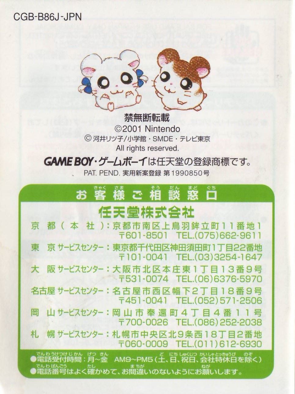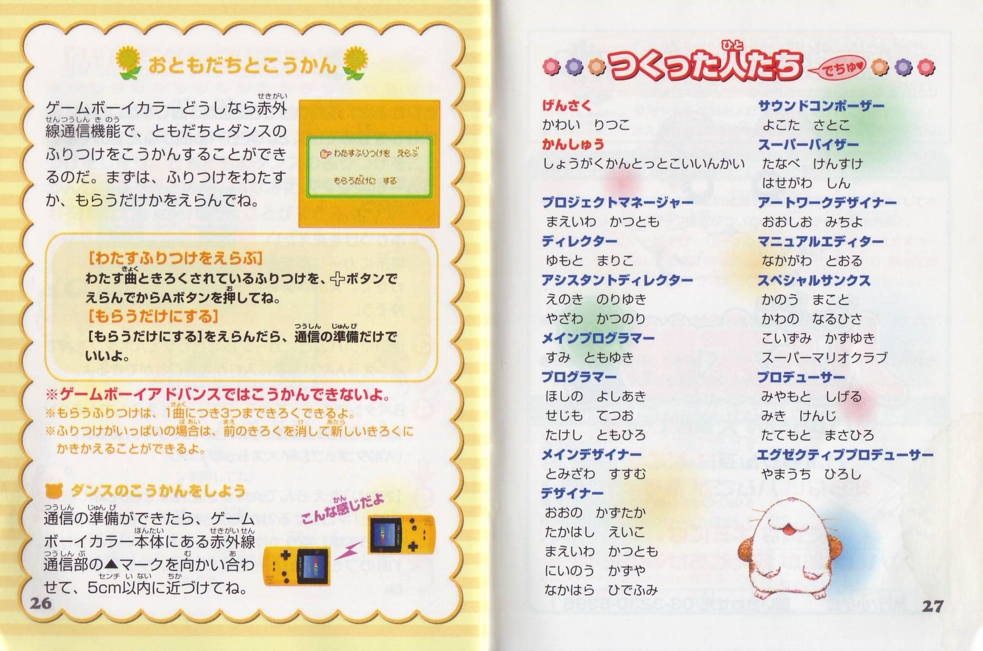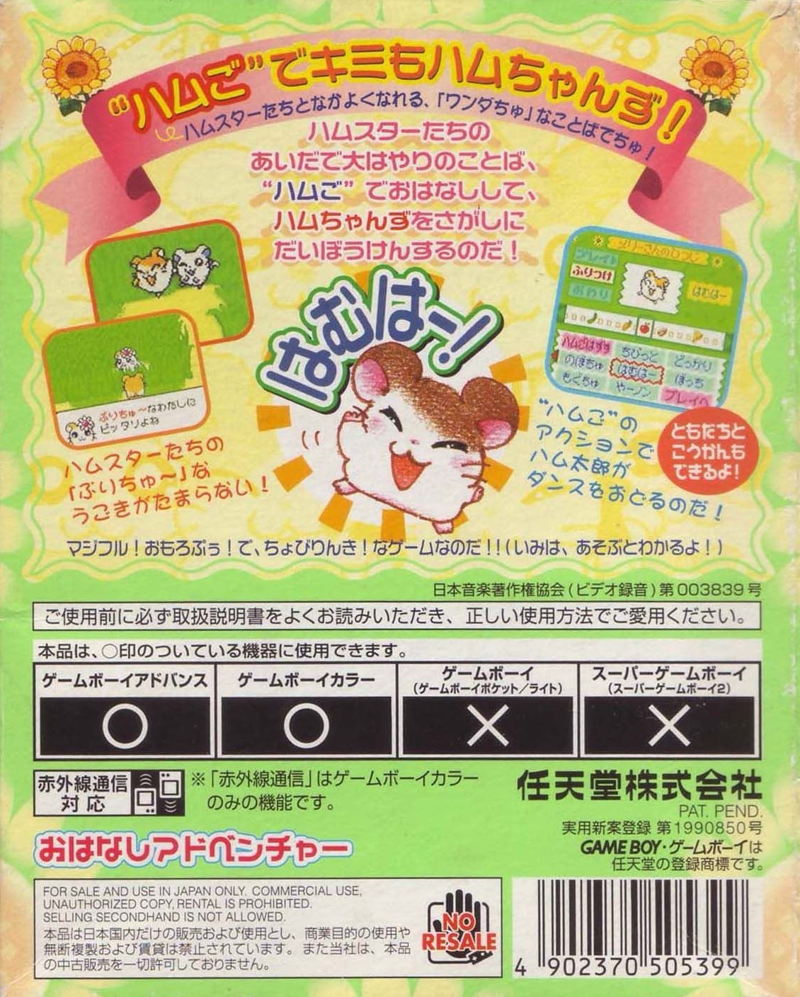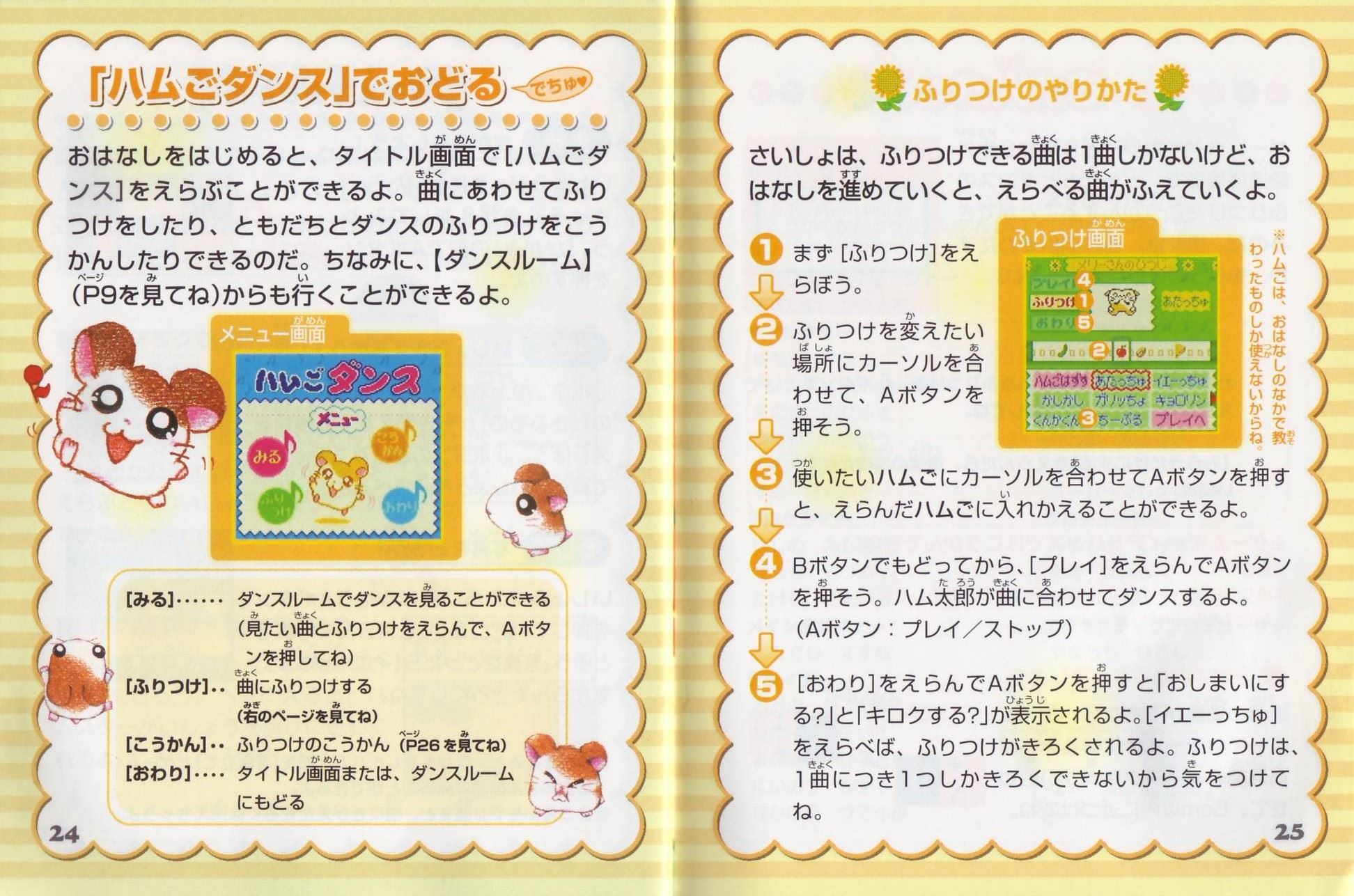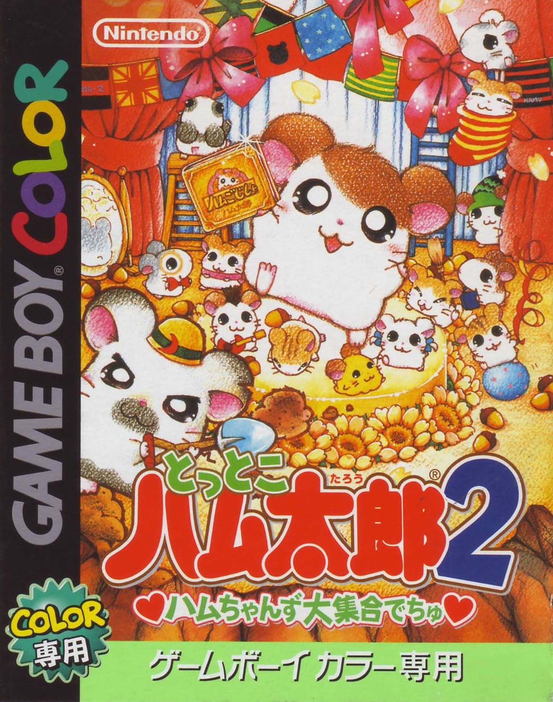 ストーリーある日、ハム太郎は、タイショーくんに、こんなお願いをされました。「うぉー! おれはいま、もうれつにいそがしいぜ! だれかひまそうなやつは…。 おっ、いたいた。おーい、ハム太郎! わるいんだけど、ハムちゃんずのメンバーを呼んできてくれないか? えっ、どうしてかって? それは、あとのお楽しみ。そうそう、おれたちハムスターは”ハム語”をつかって会話しているから、 ハムスターにあったらハムごではなしかけるといいぜ! へ? ハムごってなにかって? ハムごってのは、ハムスターのあいだでおおはやりのことばじゃねーか…。 しらなかったのか? しょうがねーなぁ。 そんじゃ、おれがしってるハムごをおしえてやっから、ちゃーんとおぼえろよ。 ハムちゃんずをさがすのにも、やくだつとおもうぜ。 それじゃあ、たのんだぞ!」 ……さて、ハム太郎は、ハムちゃんずのみんなを集めることができるのでしょうか? そうさほうほう十字ボタン:カーソルの移動/ハム太郎の移動(歩く)Bボタンを押したまま十字ボタンを押すと、走ることができるよ。 Aボタン:決定/ハムごウインドウをひらく/会話の送り(▼マークが出ている場合) Bボタン:キャンセル/ハムごウインドウをとじる/前の画面にもどる スタートボタン:[ハムごちょう]をひらく/[ハムごちょう]をとじる(P14を見てね) ゲームのはじめかたまず、ゲームボーイカラー本体に、カートリッジを正しくセットしてね(ゲームボーイカラー、またはゲームボーイアドバンス以外の本体では遊べないよ)。電源スイッチを入れると、「GAME BOY」の表示に続いて、タイトル画面があらわれるよ。 [はじめから]と表示されるから、スタートボタン(またはAボタン)を押してね! つづきを遊びたいときは このゲームは、自動的におはなしがきろくされるよ。[つづきから]をえらぶと、前に電源を切った場所から、つづきを遊ぶことができるのだ。 すでにきろくがあるときに[はじめから]をえらぶと、「いままでのキロクはきえてしまいますがホントにいいでちゅか?(もらったふりつけはのこります)」と表示されるよ。 [いいでちゅ]をえらぶと、前のおはなしのきろくが消えちゃうから注意してね。 ※おはなしのきろくは、1つしかできないよ。 ※消したきろくは、二度と復元できないからね。 なまえを入力しようね タイショーくんになまえをきかれるから、5文字までで好きななまえを入力してね。 はじめは[ハム太郎]になっているけど、なまえは変えることができるよ。 十字ボタンで文字をえらんで、Aボタンを押そう。入力できたら、さいごに[けってい]を押してね。 [かな]……ひらがなで入力する [カナ]……カタカナで入力する [ABC]……英語、数字で入力する [すすむ]……なまえのカーソルを1文字すすめる [もどる]……なまえのカーソルを1文字もどす ※Bボタンを押すたびに、1文字ずつなまえを消すことができるよ。 ※スタートボタンを押すと、カーソルが[けってい]に移動するよ。 画面の見かた全体マップハム太郎たちは、この町に住んでいるんだ。はじめは【地下ハウス】と【どんぐり神社】にしか行けないけれど、ハムちゃんずを【地下ハウス】に呼んでくると、いろんな場所に行けるようになるのだ。 [ハム太郎カーソル]を動かし[ひまわりマーク]に合わせてAボタンを押すと、その場所に移動できるよ。 地下ハウス ここからいろんな場所に移動できるよ。さらにここでヒントを聞くことができるのだ。 タイショーくんからはハムちゃんずのいる場所を、ねてるくんからはいろんなことを教えてもらえるよ。 【ダンスルーム】への入口(P24を見てね) 町のなか ハムごを使うときは、Aボタンを押して[ハムごウインドウ]を開くのだ。 十字ボタンでカーソルを動かして、ハムごをえらんでAボタンを押してね。 [出口あな]は、町のなかから全体マップへもどるときに使うよ。 もどりかたは、P13を見てね。 ハムごについてさいしょは、タイショーくんに教えてもらうハムごしかおぼえてないけど、みんなとお話しすると、いろんなハムごを教えてもらえるのだ。ハムごを集めよう 「はむはー」をしよう! 町のなかにいる、いろんなハムスターたちに話しかけてみよう。 ハムご(ハムごは会話のなかで、赤い文字で表示されるよ)やハムちゃんずについて教えてくれるよ。 知らないハムごがあると… 新しいハムごを教えてもらうと、[ハムごちょう]にメモされるよ([ハムごちょう]については、P14を見てね)。 それから、ハムごウインドウに「?」がでたら、それはまだ知らないハムごなんだ。 別のハムスターに教えてもらったら、もう一度話しかけてみよう。 ハムごを使ってみよう まずは基本のハムご4つ。 ハムちゃんずをさがしてつれて行くのに必要だから、おぼえておいてね。 はむはー(いみ:「あいさつ」) ハムスターに話しかけるときは、「はむはー」であいさつ!はじめて会ったハムスターには、きちんとあいさつをしなくちゃね! くんかくんか(いみ:「かぐ」) 落ちているものを拾