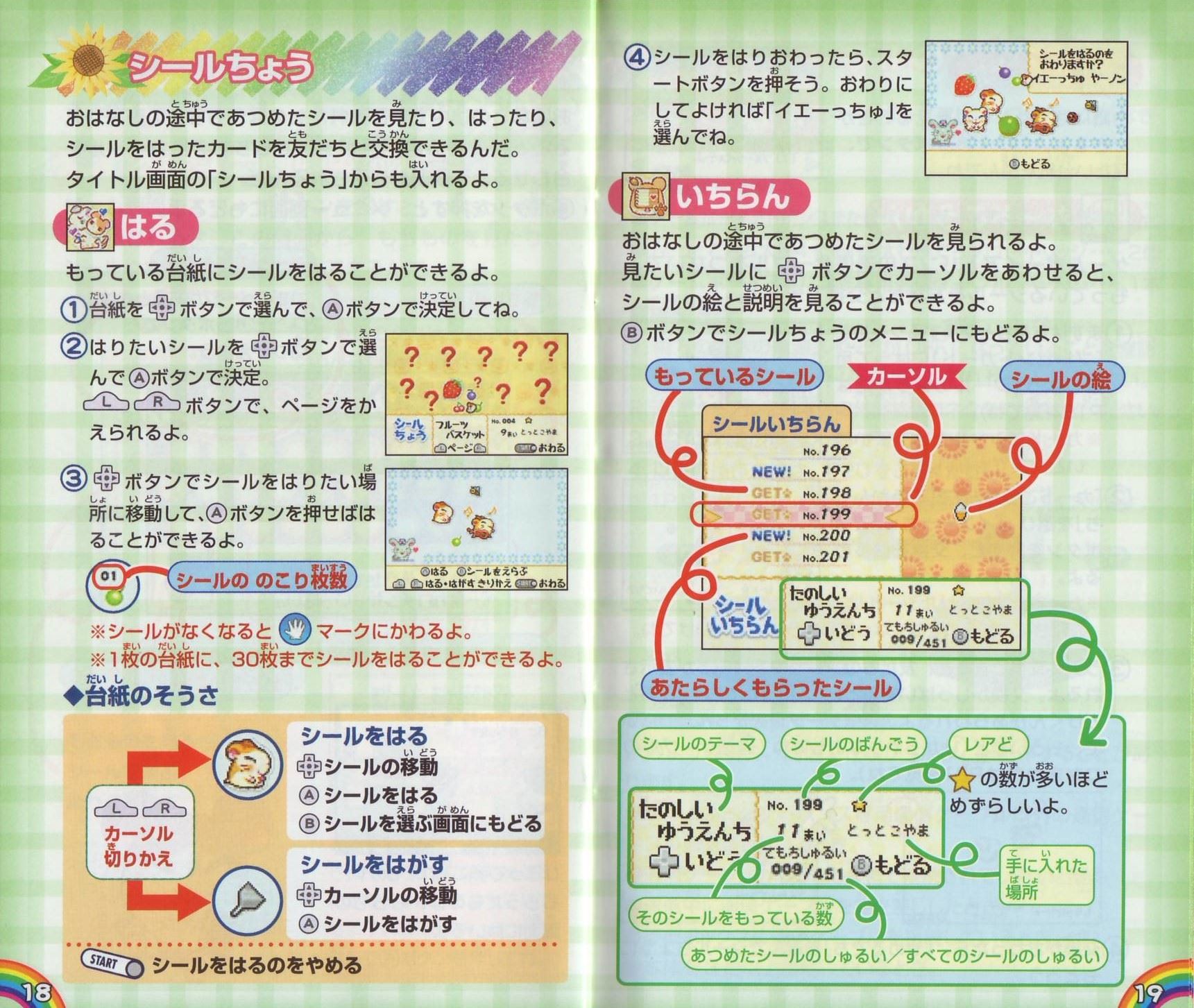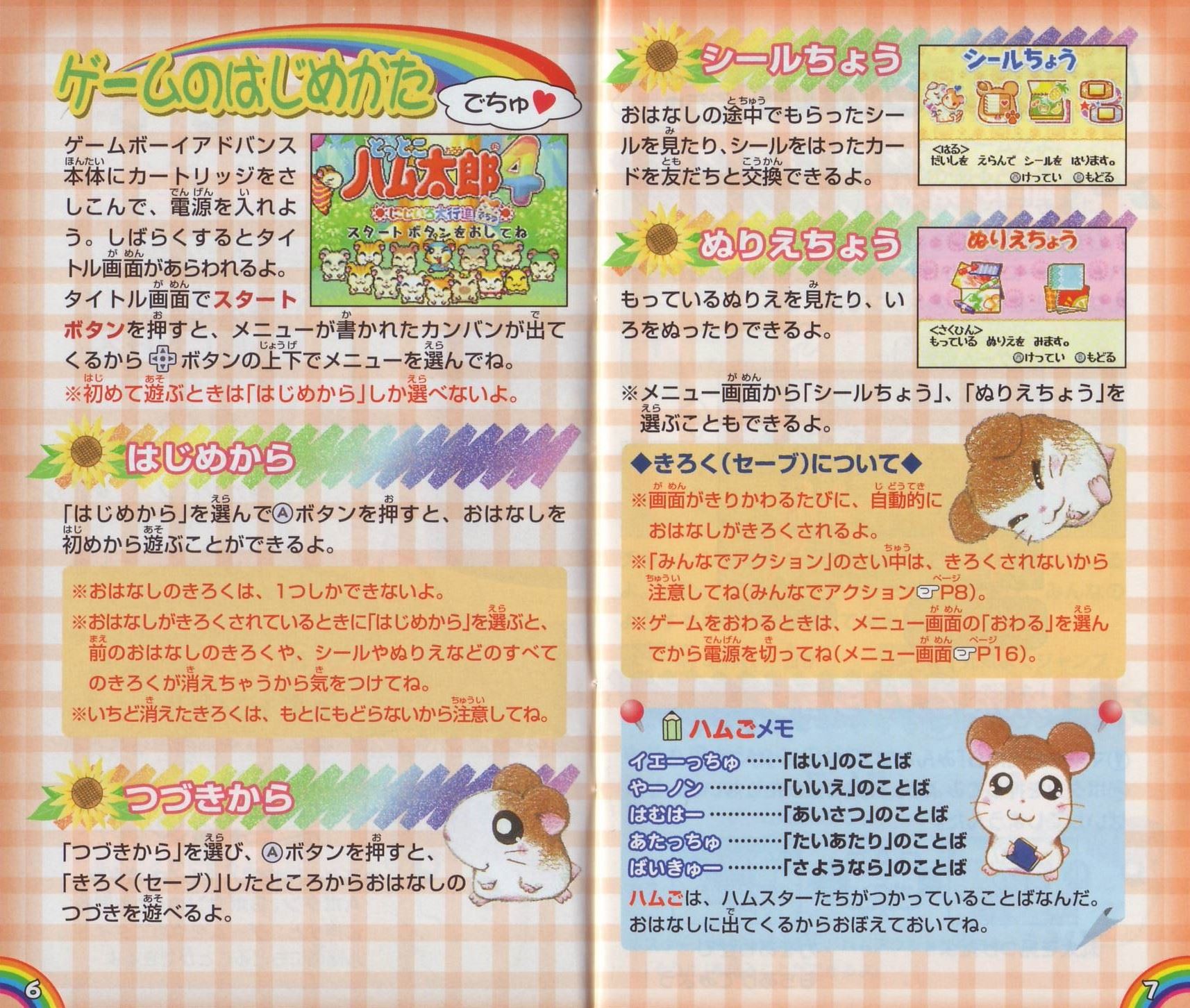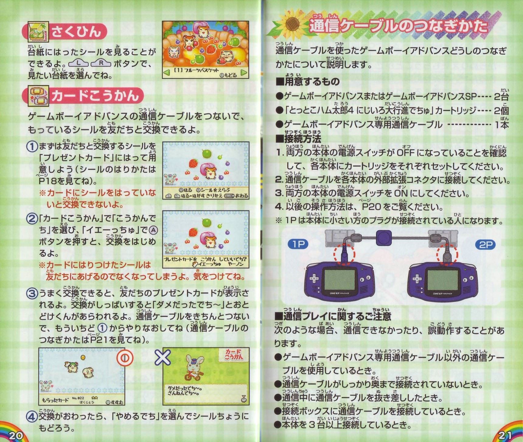 メニュー画面メニュー画面の見かたゲーム画面でスタートボタンを押すと、メニュー画面が表示されるよ。この画面から、もちものを見たり、シールやぬりえで遊ぶことができるんだ。 メニュー画面 説明書の写真をご確認ください。 もっているひまわりのタネ:ひまわりのタネは、おみせでいろんなものと交換できるよ。 もちものを見る→P17 シールで遊ぶ→P18 ぬりえで遊ぶ→P22 ※十字ボタンで選んで、Aボタンで決定してね。Bボタンでゲーム画面にもどるよ。 おわるを選ぶと、おはなしをきろくしてゲームをやめることができるよ。おわりにしてもよければ「イエーっちゅ」を選んでAボタンを押してね。 もちもの画面 おはなしの途中で手に入れたものは、もちもの画面で見ることができるよ。十字ボタンでもちものにカーソルを合わせると、説明が表示されるんだ。 Bボタンを押すと、メニュー画面にもどるよ。 もちもの画面 説明書の写真をご確認ください。 ページのばんごう:つぎのページがあるときは、LボタンまたはRボタンで切りかえよう。 ひろって手に入れたものや、もらったものは、もちもの画面にはいるよ。 シールちょう おはなしの途中であつめたシールを見たり、はったり、シールをはったカードを友だちと交換できるんだ。 タイトル画面の「シールちょう」からも入れるよ。 はる もっている台紙にシールをはることができるよ。 1 台紙を十字ボタンで選んで、Aボタンで決定してね。 2 はりたいシールを十字ボタンで選んでAボタンで決定。LボタンまたはRボタンで、ページをかえられるよ。 3 十字ボタンでシールをはりたい場所に移動して、Aボタンを押せばはることができるよ。 ※シールがなくなると手マークにかわるよ。 ※1枚の台紙に、30枚までシールをはることができるよ。 ◆台紙のそうさ LボタンまたはRボタンでカーソル切りかえ シールをはる 十字ボタン:シールの移動 Aボタン:シールをはる Bボタン:シールを選ぶ画面にもどる シールをはがす 十字ボタン:カーソルの移動 Aボタン:シールをはがす スタートボタン:シールをはるのをやめる 4 シールをはりおわったら、スタートボタンを押そう。おわりにしてよければ「イエーっちゅ」を選んでね。 いちらん おはなしの途中であつめたシールを見られるよ。見たいシールに十字ボタンでカーソルをあわせると、シールの絵と説明を見ることができるよ。 Bボタンでシールちょうのメニューにもどるよ。 シールいちらん 説明書の写真をご確認ください。 レア度:★の数が多いほどめずらしいよ。 さくひん 台紙にはったシールを見ることができるよ。LボタンまたはRボタンで、見たい台紙を選んでね。 カードこうかん ゲームボーイアドバンスの通信ケーブルをつないで、もっているシールを友だちと交換できるよ。 1 まずは友だちと交換するシールを「プレゼントカード」にはって用意しよう(シールのはりかたはP18を見てね)。 ※カードにシールをはっていないと交換できないよ。 2 「カードこうかん」で「こうかんでち」を選び、「イエーっちゅ」でAボタンを押すと、交換をはじめるよ。 ※カードにはりつけたシールは友だちにあげるのでなくなってしまうよ。気をつけてね。 3 うまく交換できると、友だちのプレゼントカードが表示されるよ。交換がしっぱいすると「ダメだったでちー」とおとどけくんがあらわれるよ。 通信ケーブルをきちんとつないで、もういちど1からやりなおしてね(通信ケーブルのつなぎかたはP21を見てね)。 4 交換がおわったら、「やめるでち」を選んでシールちょうにもどろう。 通信ケーブルのつなぎかた 通信ケーブルを使ったゲームボーイアドバンスどうしのつなぎ方について説明します。 ■用意するもの ●ゲームボーイアドバンスまたはゲームボーイアドバンスSP…2台 ●「とっとこハム太郎4 にじいろ大行進でちゅ」カートリッジ…2個 ●ゲームボーイアドバンス専用通信ケーブル…1本 ■接続方法 1.両方の本体の電源スイッチがOFFになっていることを確認して、各本体にカートリッジをそれぞれセットしてください。 2.通信ケーブルを各本体の外部拡張コネクタに接続してください。 3.両方の本体の電源スイッチをONにしてください。 4.以後の操作方法は、P20をご覧ください。 ※1Pは本体に小さい方のプラグが接続されている人になります。 ■通信プレイに関するご注意 次のような場合、通信できなかったり、誤動作することがあります。 ●ゲームボーイアドバンス専用通信ケーブル以外の通信ケーブルを使用しているとき。 ●通信ケーブルがしっかりと奥まで接続されていないとき。 ●通信中に通信ケーブルを抜き差ししたとき。 ●接続ボックスに通信ケーブルを接続しているとき。 ●本体を3台以上接続しているとき。 ぬりえちょう おはなしの途中、ハムスターからぬりえをもらうことができるんだ。 おみせには、ひまわりのタネで買えるぬりえもあるよ。 ぬる もっているぬりえにいろをぬることができるよ。