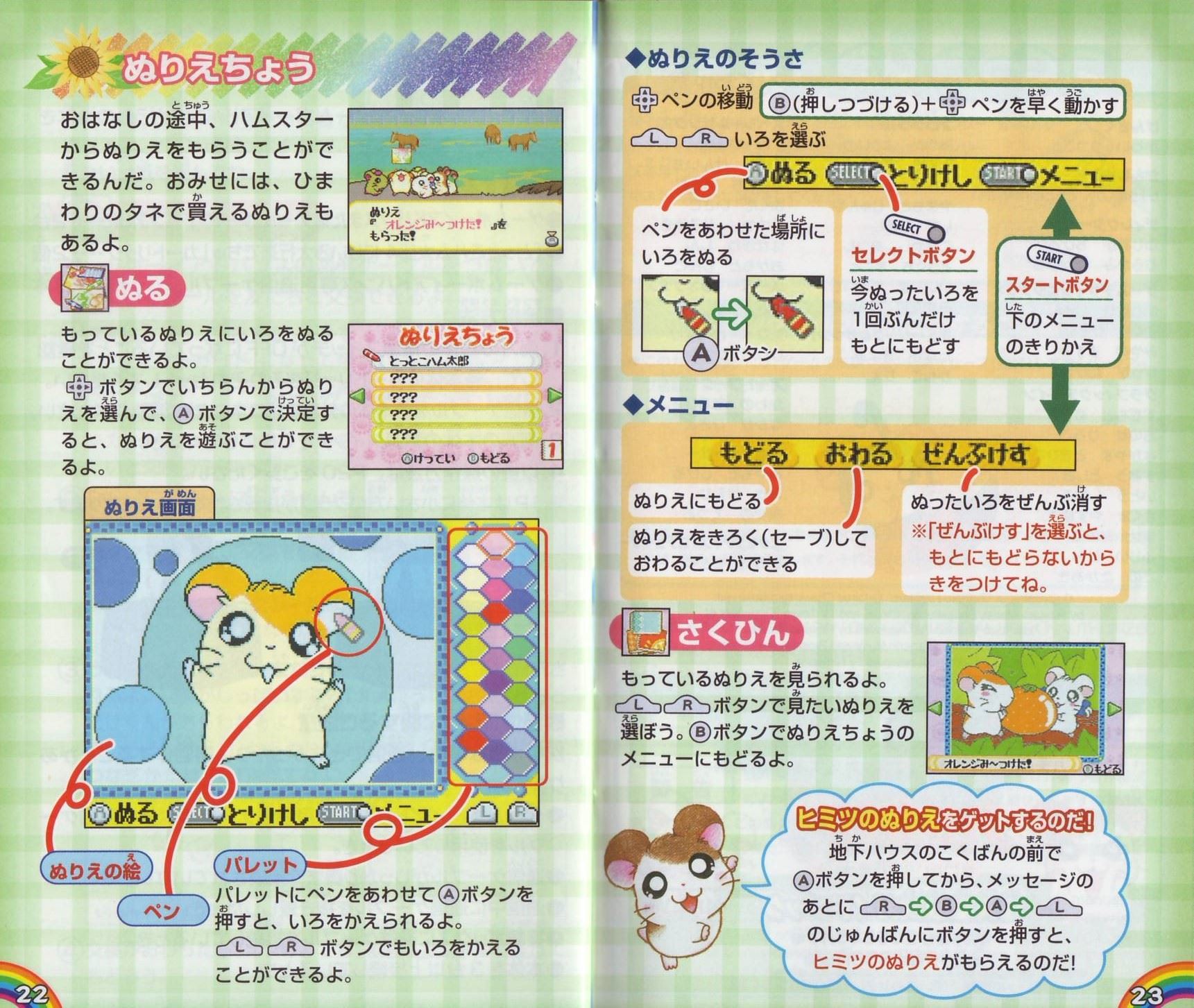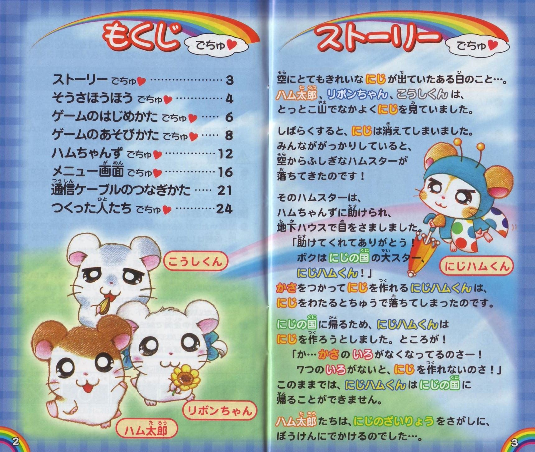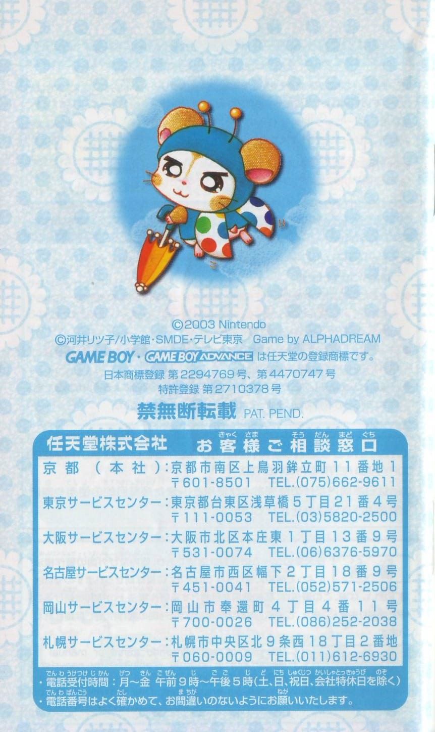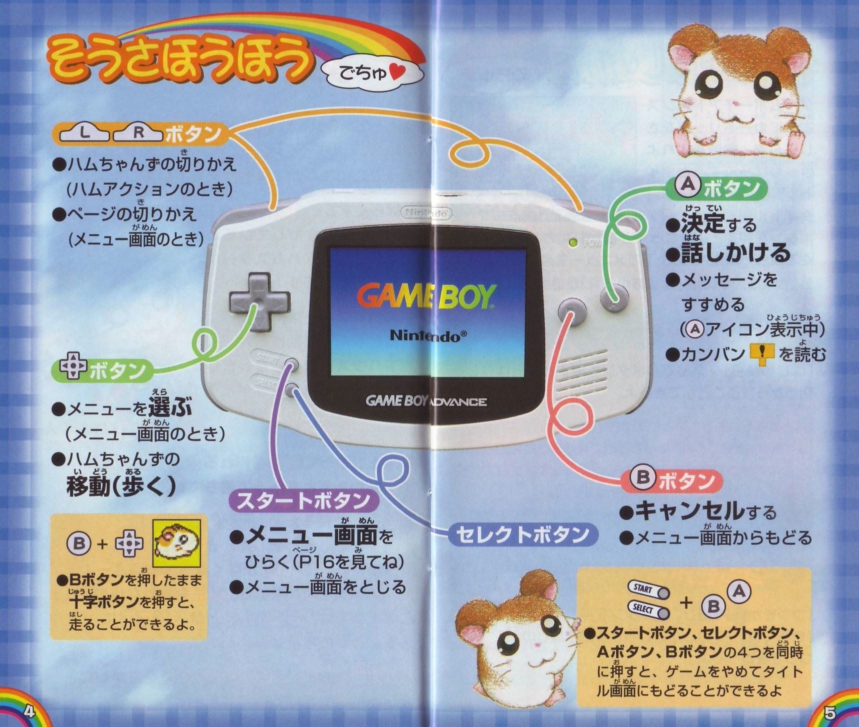 ストーリー空にとてもきれいなにじが出ていたある日のこと…。ハム太郎、リボンちゃん、こうしくんは、とっとこ山でなかよくにじを見ていました。 しばらくすると、にじは消えてしまいました。みんなががっかりしていると、空からふしぎなハムスターが落ちてきたのです! そのハムスターは、ハムちゃんずに助けられ、地下ハウスで目をさましました。 「助けてくれてありがとう! ボクはにじの国の大スター、にじハムくん!」 かさをつかってにじを作れるにじハムくんは、にじをわたるとちゅうで落ちてしまったのです。 にじの国に帰るため、にじハムくんはにじを作ろうとしました。ところが! 「か…かさのいろがなくなってるのさー! 7つのいろがないと、にじを作れないのさ!」 このままでは、にじハムくんはにじの国に帰ることができません。 ハム太郎たちはにじのざいりょうをさがしに、ぼうけんにでかけるのでした…。 そうさほうほう十字ボタン●メニューを選ぶ(メニュー画面のとき) ●ハムちゃんずの移動(歩く) ●Bボタンを押したまま十字ボタンを押すと、走ることができるよ。 Aボタン ●決定する ●話しかける ●メッセージをすすめる(Aアイコン表示中) ●カンバンを読む Bボタン ●キャンセルする ●メニュー画面からもどる Lボタン/Rボタン ●ハムちゃんずの切りかえ(ハムアクションのとき) ●ページの切りかえ(メニュー画面のとき) スタートボタン ●メニュー画面をひらく(P16を見てね) ●メニュー画面をとじる ●スタートボタン、セレクトボタン、Aボタン、Bボタンの4つを同時に押すと、ゲームをやめてタイトル画面にもどることができるよ ゲームのはじめかたゲームボーイアドバンス本体にカートリッジをさしこんで、電源を入れよう。しばらくするとタイトル画面があらわれるよ。タイトル画面でスタートボタンを押すと、メニューが書かれたカンバンが出てくるから十字ボタンの上下でメニューを選んでね。 ※初めて遊ぶときは「はじめから」しか選べないよ。 はじめから 「はじめから」を選んでAボタンを押すと、おはなしを初めから遊ぶことができるよ。 ※おはなしのきろくは、1つしかできないよ。 ※おはなしがきろくされているときに「はじめから」を選ぶと、前のおはなしのきろくや、シールやぬりえなどのすべてのきろくが消えちゃうから気をつけてね。 ※いちど消えたきろくは、もとにもどらないから注意してね。 つづきから 「つづきから」を選び、Aボタンを押すと、「きろく(セーブ)」したところからのおはなしのつづきを遊べるよ。 シールちょう おはなしの途中でもらったシールを見たり、シールをはったカードを友だちと交換できるよ。 ぬりえちょう もっているぬりえを見たり、いろをぬったりできるよ。 ※メニュー画面から「シールちょう」、「ぬりえちょう」を選ぶこともできるよ。 ◆きろく(セーブ)について◆ ※画面がきりかわるたびに、自動的におはなしがきろくされるよ。 ※「みんなでアクション」のさい中は、きろくされないから注意してね(みんなでアクション→P8)。 ※ゲームをおわるときは、メニュー画面の「おわる」を選んでから電源を切ってね(メニュー画面→P16)。 ハムごメモ イエーっちゅ……「はい」のことば やーノン……「いいえ」のことば はむはー……「あいさつ」のことば あたっちゅ……「たいあたり」のことば ばいきゅー……「さようなら」のことば ハムごは、ハムスターたちがつかっていることばなんだ。おはなしに出てくるからおぼえておいてね。 ゲームのあそびかた画面の見かたハムちゃんずは、いろいろなところをぼうけんするよ。ハムスターに話しかけたり、落ちているものをひろったりするときには、Aボタンを押してね。 ゲーム画面 説明書の写真をご確認ください。 みんなでアクション !マークが出たら「みんなでアクション」がつかえるよ。Aボタンを押してみよう。仲間の数がたりないと、しっぱいしてしまうんだ。 丸太を見つけたよ→Aボタン→力をあわせてもちあげてみよう! ハムアクション ハムアクションはハムちゃんずが遊ぶミニゲームだよ。カンバンがあるところで、ハムアクションができるよ。 ハムアクションのカンバンのいみ 裏返しのカンバン:まだ遊べないよ ひまわりのついた!マークのカンバン:まだクリアしていないよ。 何も書かれていないカンバン:おはなしをすすめると!マークのカンバンにかわり、遊ぶことができるよ。 ひまわりがついていない!マークのカンバン:いちどクリアしているよ。さいしょと同じようにもう一度遊ぶことができるよ。 チェックが入ったカンバン:いちどクリアしていて、もう遊べないよ。 チャレンジできるキャラクターはそれぞれ決まっているよ。 LボタンまたはRボタンでハムちゃんずを選び、みんなのようすを見て、Aボタンで決定しよう。 あれれ?目がうるうるしてるよ。→×チャレンジできない 元気よくジャンプしてるよ!→〇チャレンジできる ◆ハムアクション