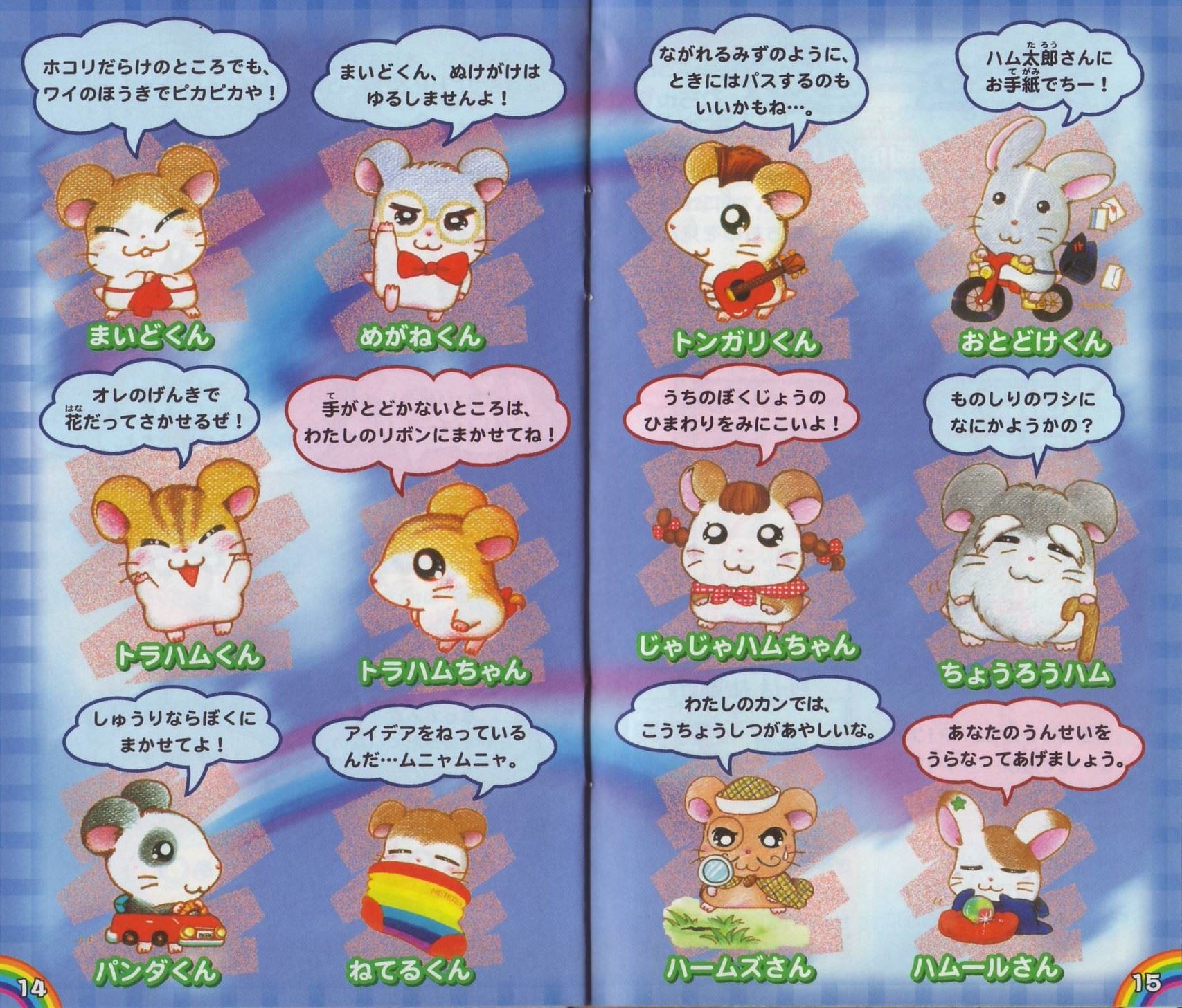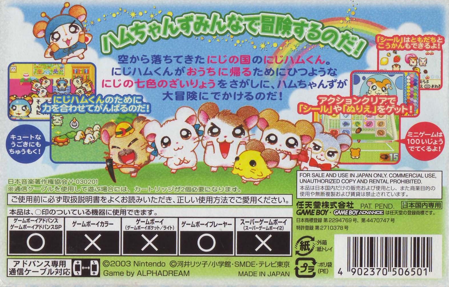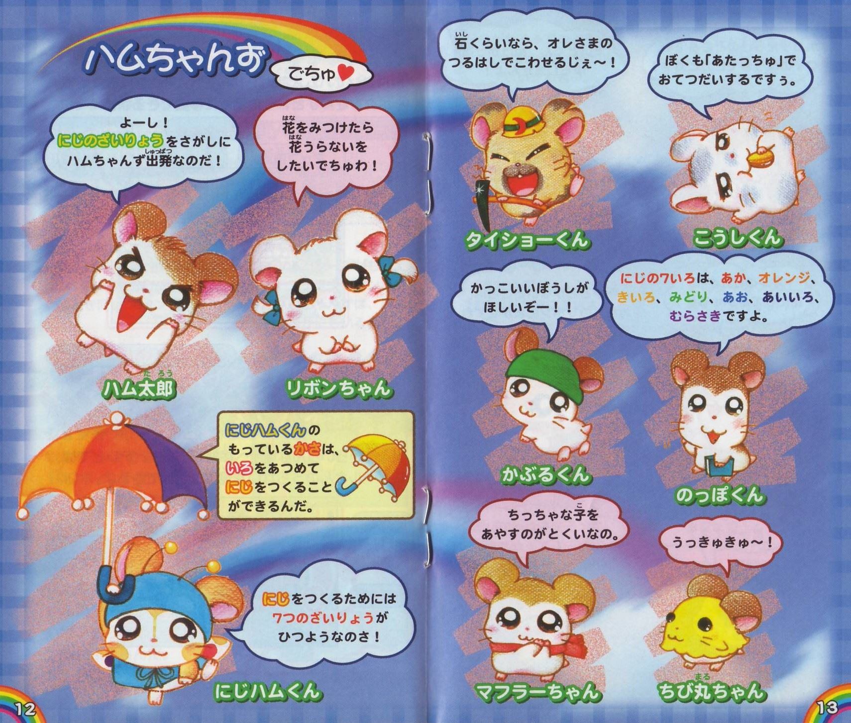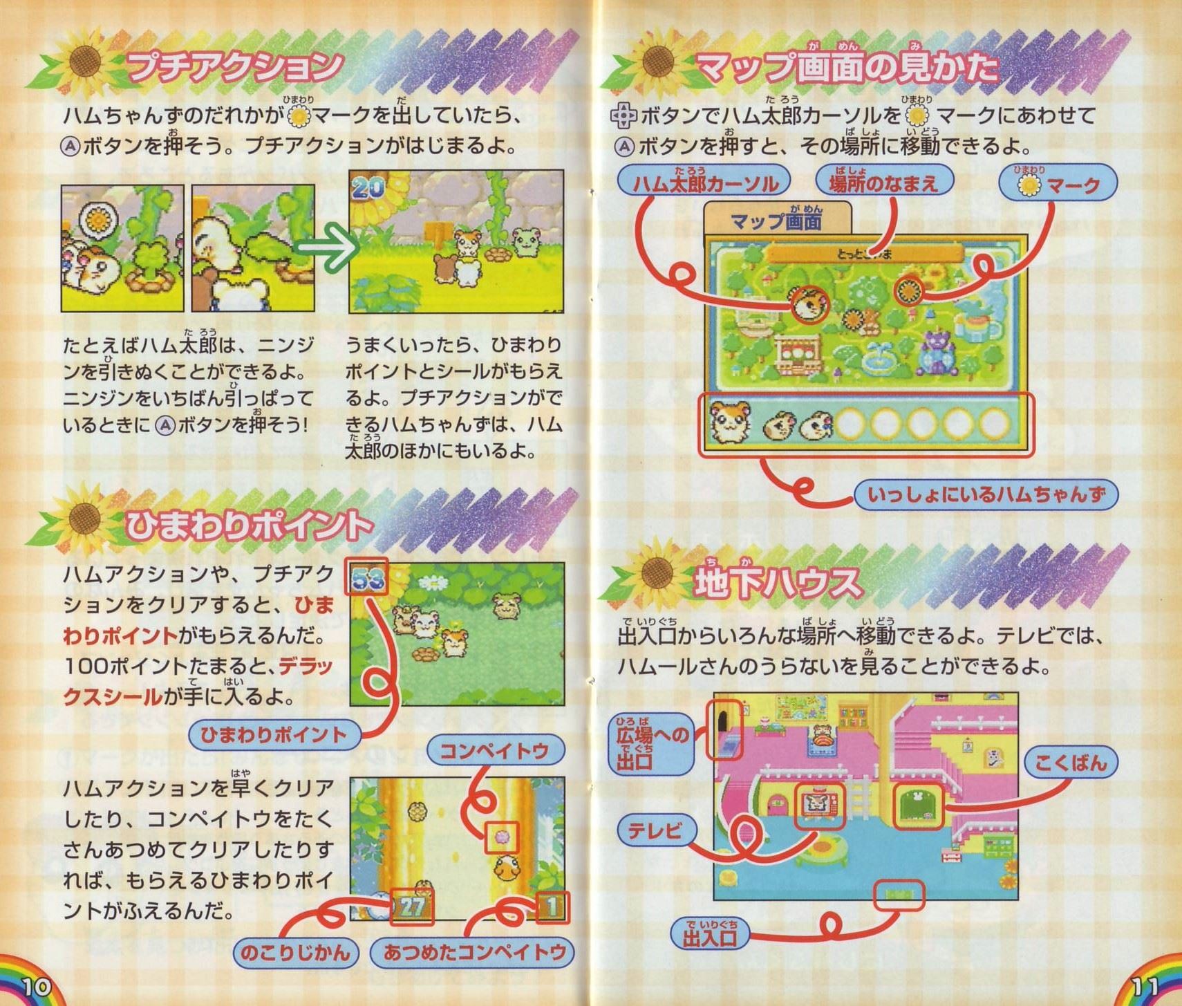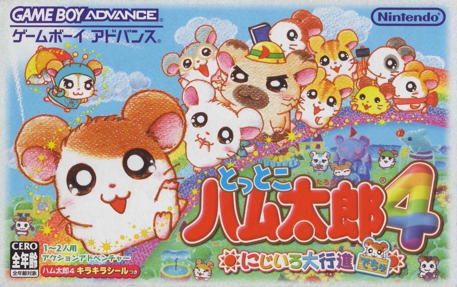 ストーリー空にとてもきれいなにじが出ていたある日のこと…。ハム太郎、リボンちゃん、こうしくんは、とっとこ山でなかよくにじを見ていました。 しばらくすると、にじは消えてしまいました。みんなががっかりしていると、空からふしぎなハムスターが落ちてきたのです! そのハムスターは、ハムちゃんずに助けられ、地下ハウスで目をさましました。 「助けてくれてありがとう! ボクはにじの国の大スター、にじハムくん!」 かさをつかってにじを作れるにじハムくんは、にじをわたるとちゅうで落ちてしまったのです。 にじの国に帰るため、にじハムくんはにじを作ろうとしました。ところが! 「か…かさのいろがなくなってるのさー! 7つのいろがないと、にじを作れないのさ!」 このままでは、にじハムくんはにじの国に帰ることができません。 ハム太郎たちはにじのざいりょうをさがしに、ぼうけんにでかけるのでした…。 そうさほうほう十字ボタン●メニューを選ぶ(メニュー画面のとき) ●ハムちゃんずの移動(歩く) ●Bボタンを押したまま十字ボタンを押すと、走ることができるよ。 Aボタン ●決定する ●話しかける ●メッセージをすすめる(Aアイコン表示中) ●カンバンを読む Bボタン ●キャンセルする ●メニュー画面からもどる Lボタン/Rボタン ●ハムちゃんずの切りかえ(ハムアクションのとき) ●ページの切りかえ(メニュー画面のとき) スタートボタン ●メニュー画面をひらく(P16を見てね) ●メニュー画面をとじる ●スタートボタン、セレクトボタン、Aボタン、Bボタンの4つを同時に押すと、ゲームをやめてタイトル画面にもどることができるよ ゲームのはじめかたゲームボーイアドバンス本体にカートリッジをさしこんで、電源を入れよう。しばらくするとタイトル画面があらわれるよ。タイトル画面でスタートボタンを押すと、メニューが書かれたカンバンが出てくるから十字ボタンの上下でメニューを選んでね。 ※初めて遊ぶときは「はじめから」しか選べないよ。 はじめから 「はじめから」を選んでAボタンを押すと、おはなしを初めから遊ぶことができるよ。 ※おはなしのきろくは、1つしかできないよ。 ※おはなしがきろくされているときに「はじめから」を選ぶと、前のおはなしのきろくや、シールやぬりえなどのすべてのきろくが消えちゃうから気をつけてね。 ※いちど消えたきろくは、もとにもどらないから注意してね。 つづきから 「つづきから」を選び、Aボタンを押すと、「きろく(セーブ)」したところからのおはなしのつづきを遊べるよ。 シールちょう おはなしの途中でもらったシールを見たり、シールをはったカードを友だちと交換できるよ。 ぬりえちょう もっているぬりえを見たり、いろをぬったりできるよ。 ※メニュー画面から「シールちょう」、「ぬりえちょう」を選ぶこともできるよ。 ◆きろく(セーブ)について◆ ※画面がきりかわるたびに、自動的におはなしがきろくされるよ。 ※「みんなでアクション」のさい中は、きろくされないから注意してね(みんなでアクション→P8)。 ※ゲームをおわるときは、メニュー画面の「おわる」を選んでから電源を切ってね(メニュー画面→P16)。 ハムごメモ イエーっちゅ……「はい」のことば やーノン……「いいえ」のことば はむはー……「あいさつ」のことば あたっちゅ……「たいあたり」のことば ばいきゅー……「さようなら」のことば ハムごは、ハムスターたちがつかっていることばなんだ。おはなしに出てくるからおぼえておいてね。 ゲームのあそびかた画面の見かたハムちゃんずは、いろいろなところをぼうけんするよ。ハムスターに話しかけたり、落ちているものをひろったりするときには、Aボタンを押してね。 ゲーム画面 説明書の写真をご確認ください。 みんなでアクション !マークが出たら「みんなでアクション」がつかえるよ。Aボタンを押してみよう。仲間の数がたりないと、しっぱいしてしまうんだ。 丸太を見つけたよ→Aボタン→力をあわせてもちあげてみよう! ハムアクション ハムアクションはハムちゃんずが遊ぶミニゲームだよ。カンバンがあるところで、ハムアクションができるよ。 ハムアクションのカンバンのいみ 裏返しのカンバン:まだ遊べないよ ひまわりのついた!マークのカンバン:まだクリアしていないよ。 何も書かれていないカンバン:おはなしをすすめると!マークのカンバンにかわり、遊ぶことができるよ。 ひまわりがついていない!マークのカンバン:いちどクリアしているよ。さいしょと同じようにもう一度遊ぶことができるよ。 チェックが入ったカンバン:いちどクリアしていて、もう遊べないよ。 チャレンジできるキャラクターはそれぞれ決まっているよ。 LボタンまたはRボタンでハムちゃんずを選び、みんなのようすを見て、Aボタンで決定しよう。 あれれ?目がうるうるしてるよ。→×チャレンジできない 元気よくジャンプしてるよ!→〇チャレンジできる ◆ハムアクション