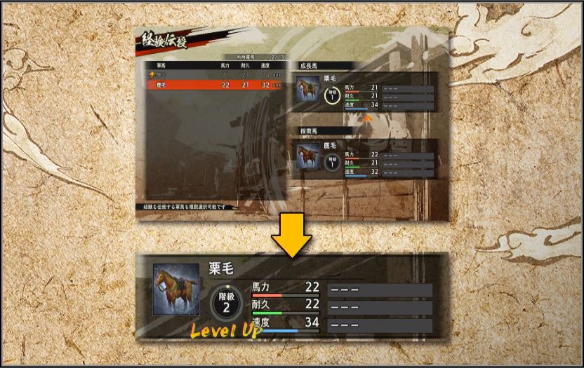 軍馬の階級が上がると、軍馬の能力が強化されます。